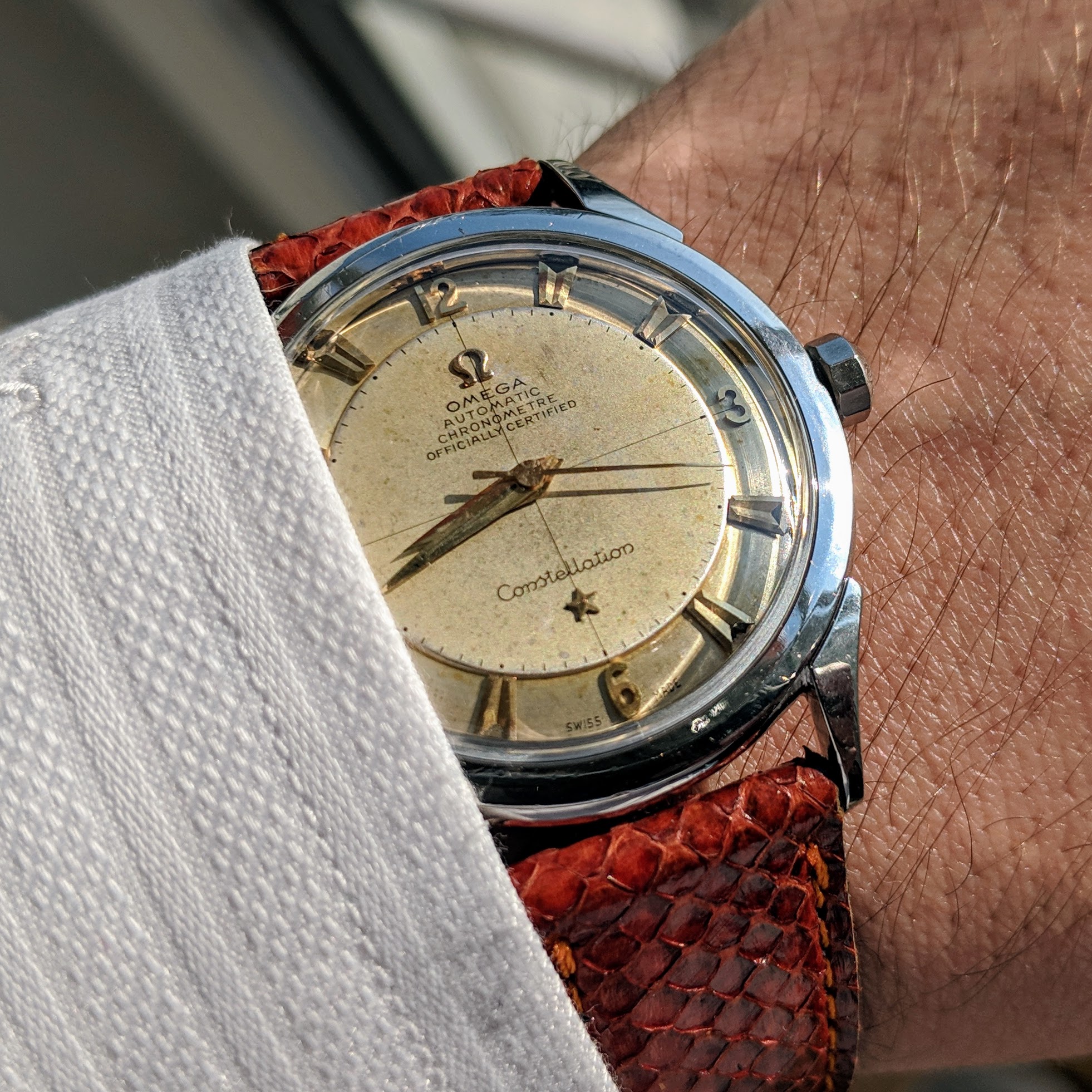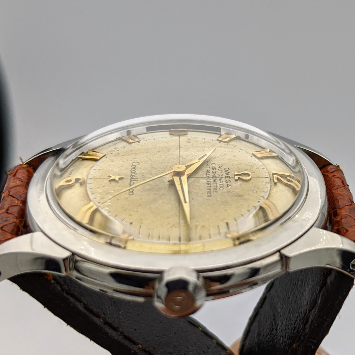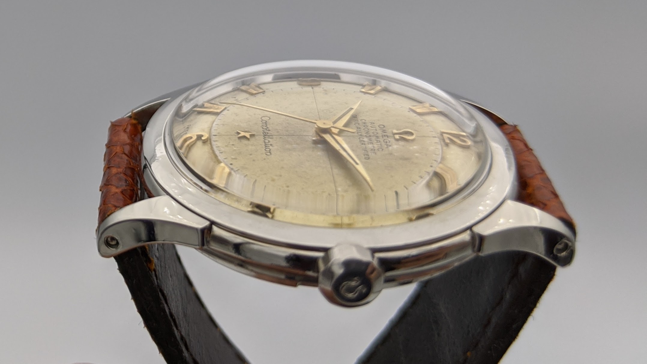 This is the second gen. Constellation - successor of the 2648, the only difference is the srew down case back. It has a rare Cal 352 bumper movement with a 12Mio serial plus an uncommon disk dial. All original nice and honest condition.