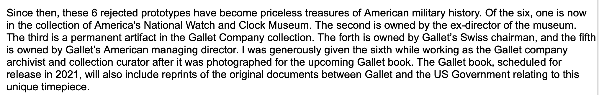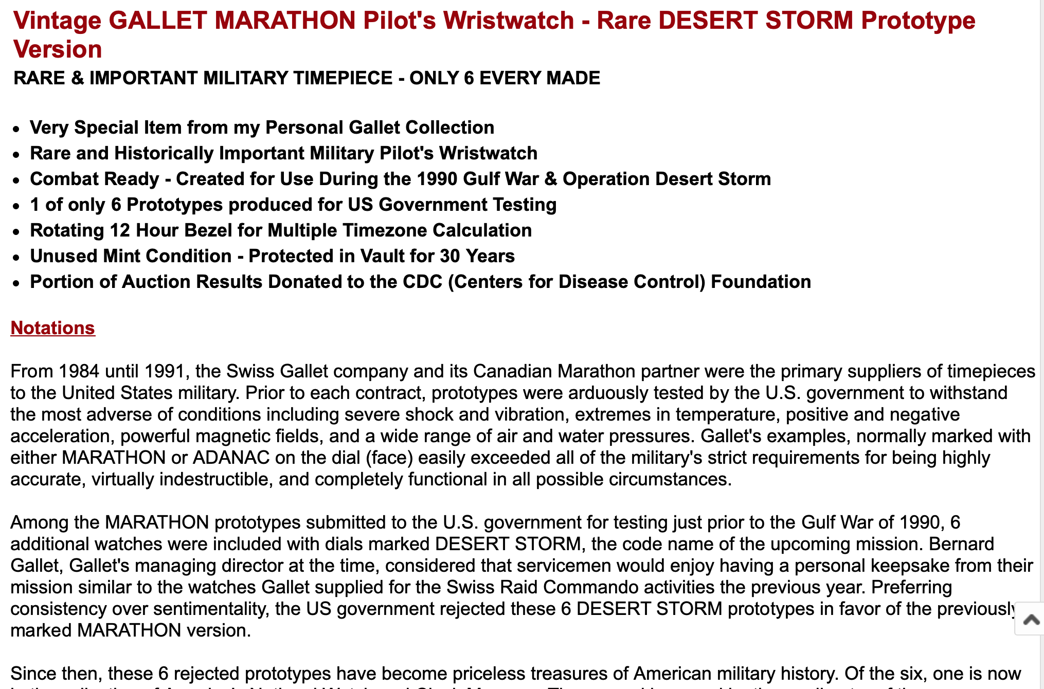 The watches produced by Gallet under the Marathon trademark are well-attested, certainly. The "Desert Storm" prototype, on the other hand, comes with a shifting mythology provided by the people at Gallet USA, who also 1) own multiple examples, and 2) make fantastic claims for its monetary and historical value.