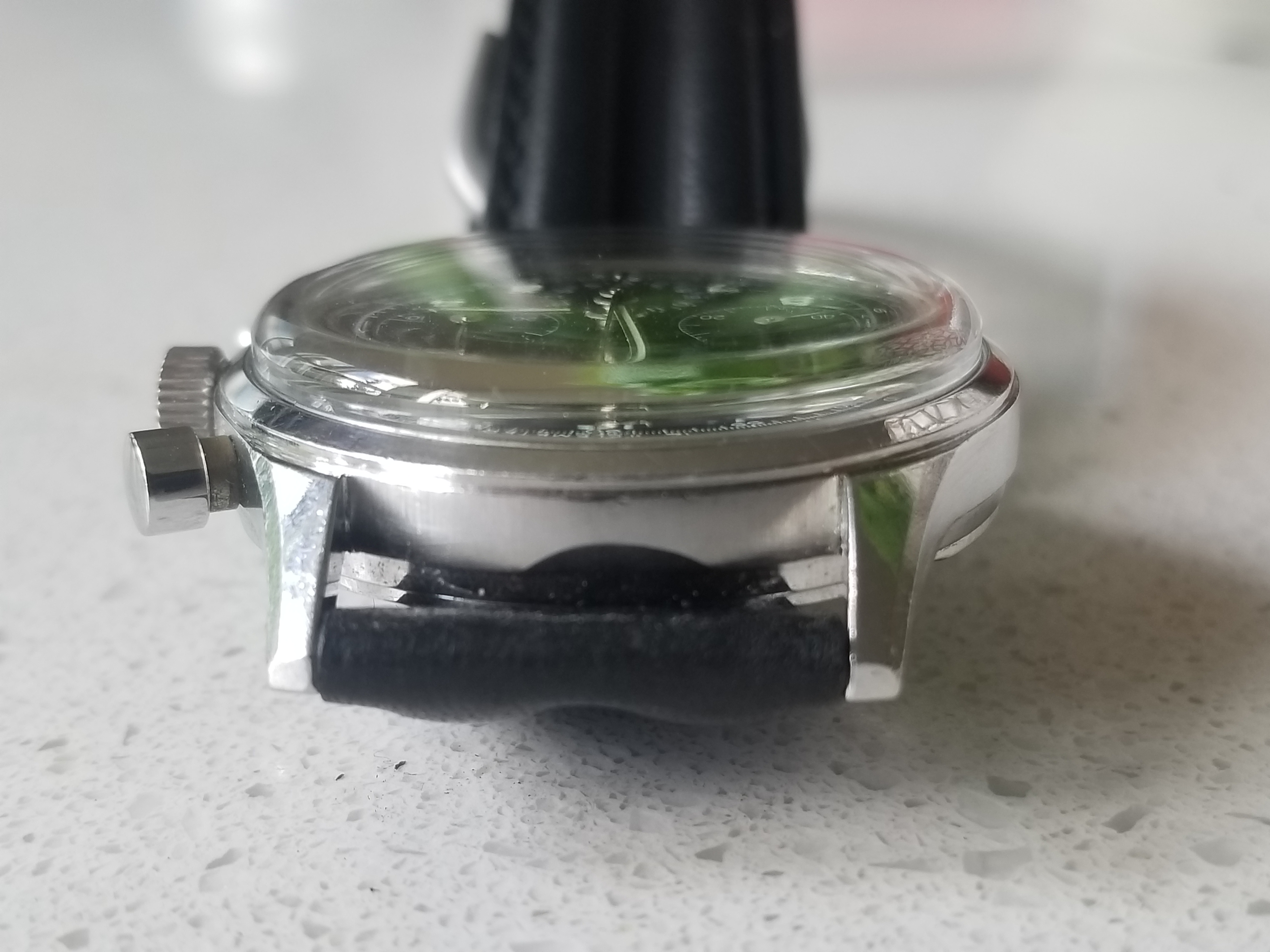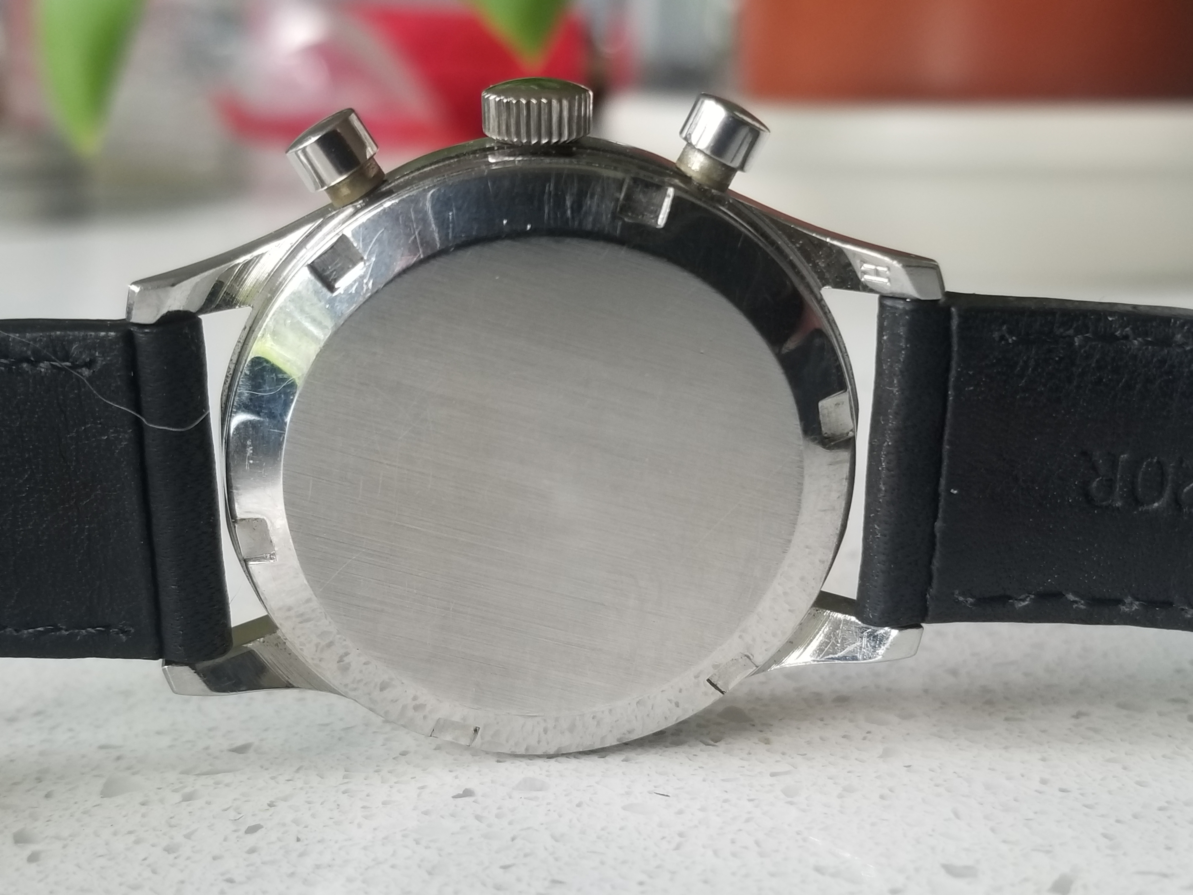 This watch includes the EP40-68 movement. The EP40-68 is an improvement over the EP40 because it includes an adjustable stud carrier. The backside of the lug has an ‘H’ engraved, which identifies the case has the EP movement versus the Valjoux movement. The EP pushers have a smoother touch than either the Valjoux 72 or the Lemania 321 and 1861, (which I also own and can compare to their use.) To me, this EP chronograph is the nicest I have operated. I have not timed it to plus or minus seconds per day but can say it keeps accurate time and the chronograph functions and resets as expected.