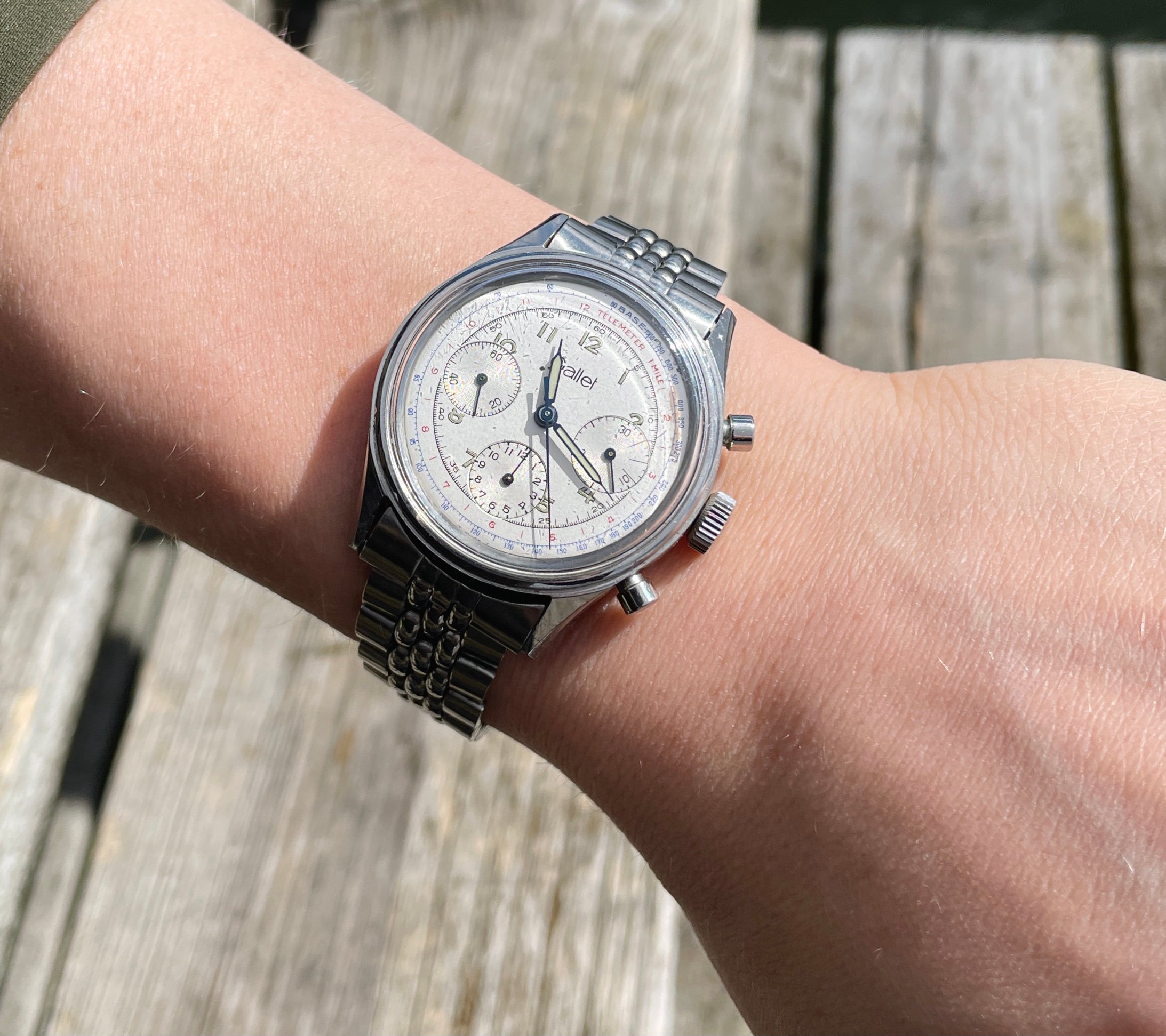 White multi-scale dial in very well preserved condition except a stain around the base-scale at 2 o'clock and a spot next to the logo (this spot may just be dirt that can be removed but I wont try opening it up). Beautiful blued hands with tritium matching the numerals, the lume is a yellow-green ish colour which is usual for Gallet from this era.