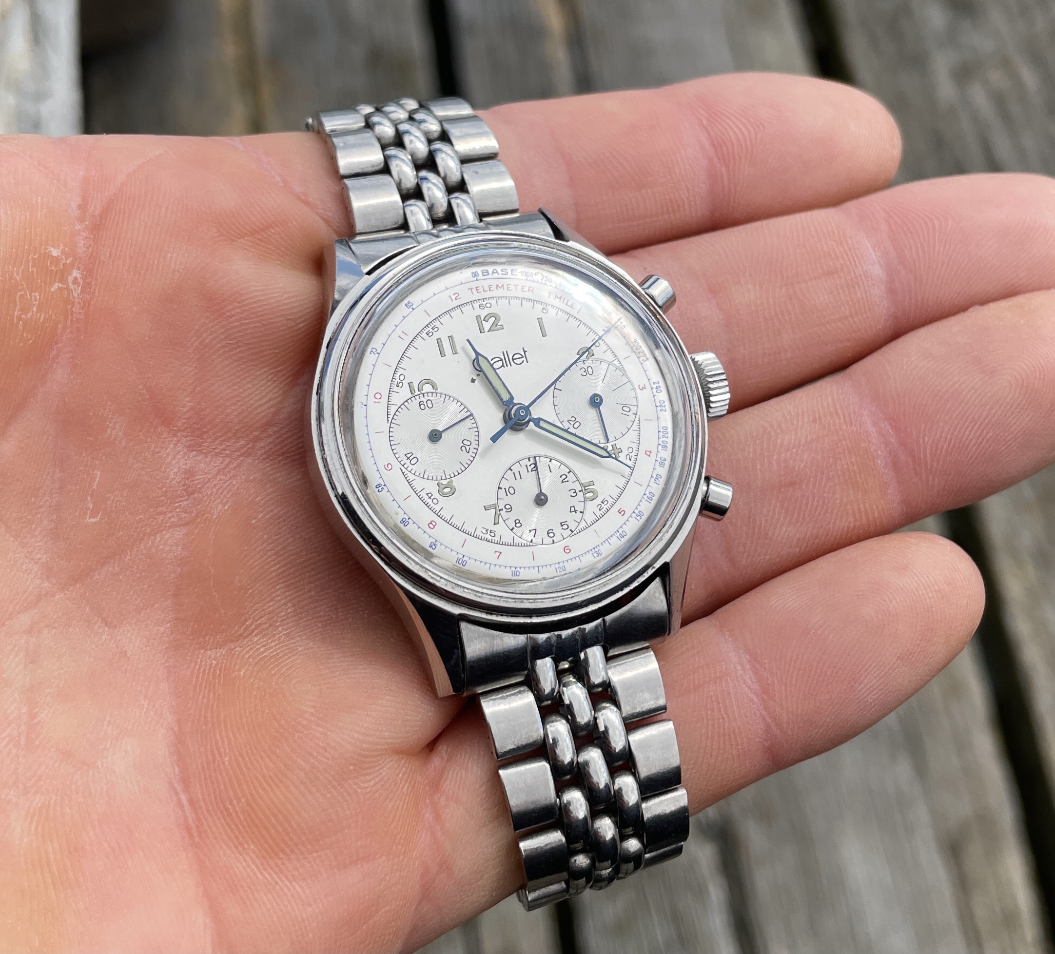 These large Gallets with top quality 3-register movements are fetching very high prices, so with the small flaws on the dial counted in I think my asking price should be very fair.