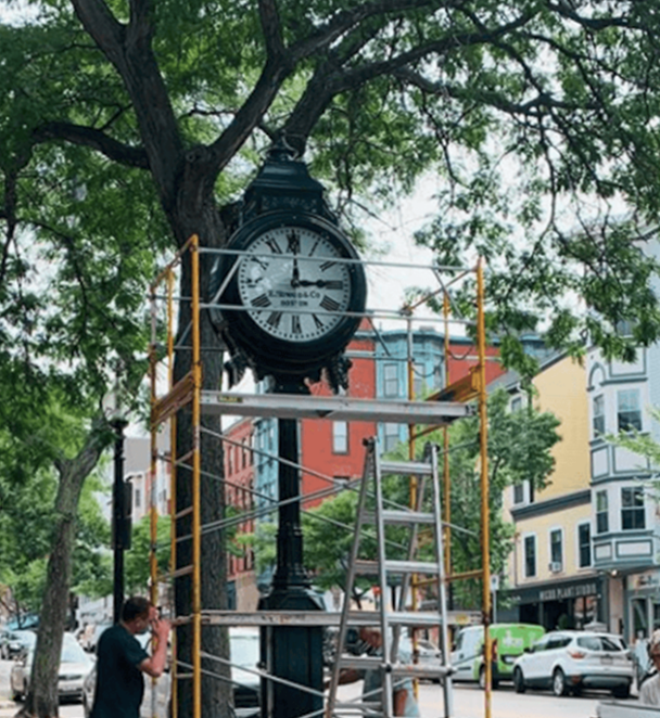 South Boston’s street clock on West Broadway will be temporarily removed, restored over the winter, and return in the spring. The project will restore the exterior and interior surfaces as well as all the gears, weights and pulleys that keep the clock running. The work will be paid for by the City of Boston’s Edward Ingersoll Browne Fund.