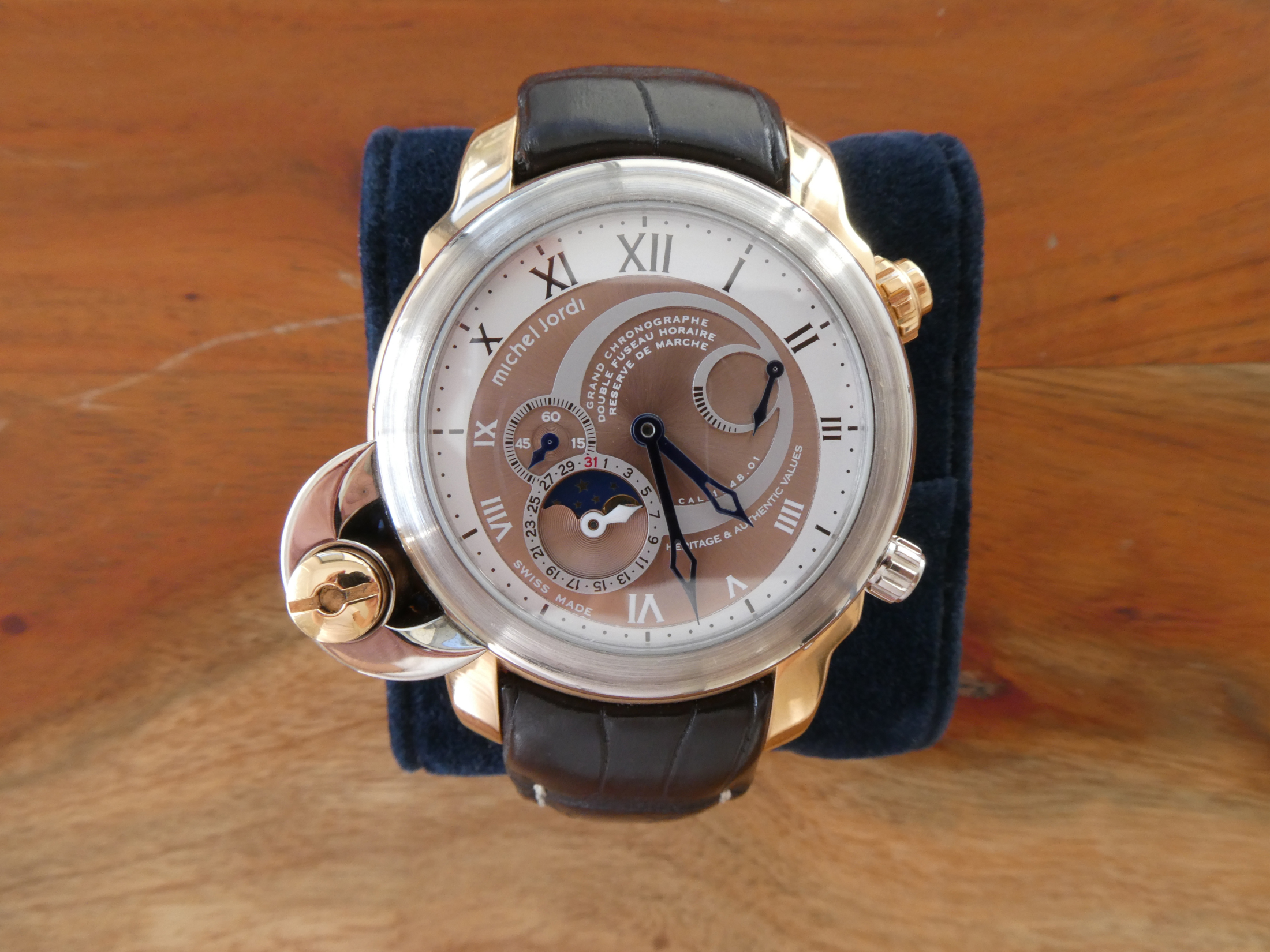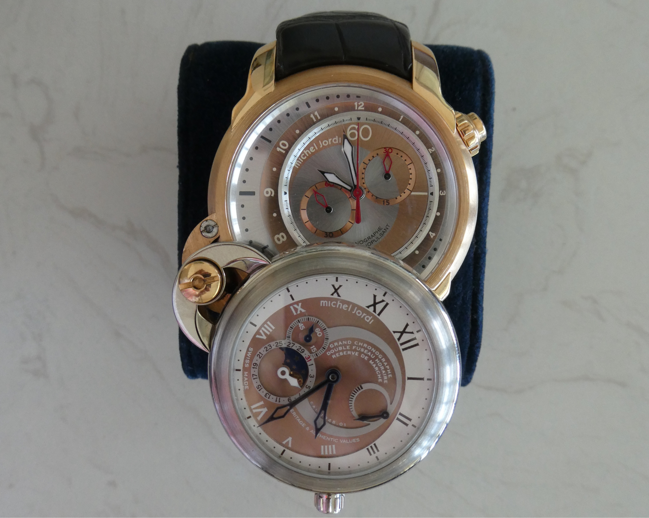 The watch in question is Michel Jordi piece, which he bought new in 2009. It has all the original box / papers, as well as a service certificate from a store in Switzerland from 2 or 3 years ago. Some photos below.