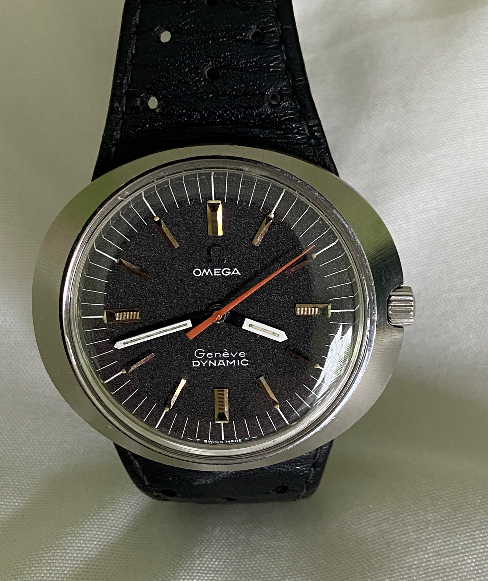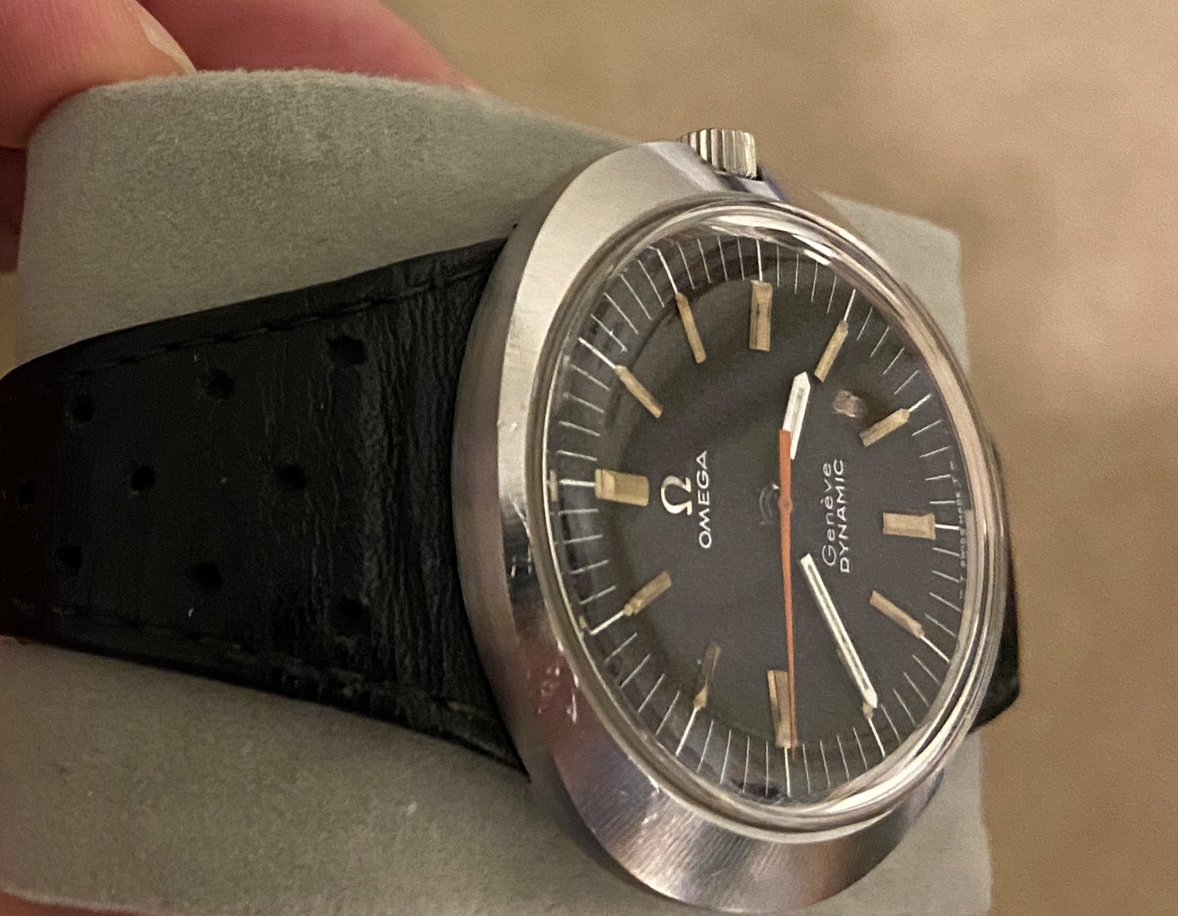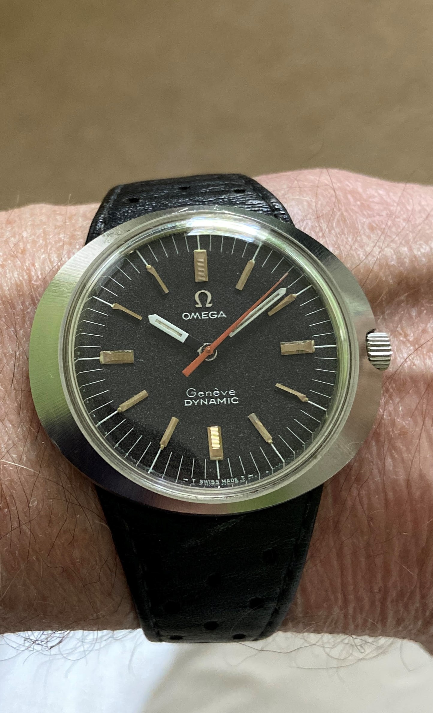 For same is my Gen 1 Omega Dynamic 135.0033 with dark brown/grey moondust dial. Manual winding, with gold markers and orange second hand. Running great, no issues, I'm just doing some consolidating.