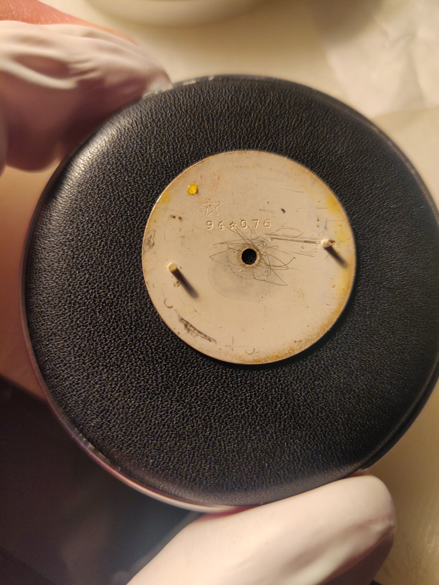 ·I tried acetone and isopropanol without results. The dial was already chipping away at the edge so began lightly scraping and the paint chipped off very easily. I doubt that the original paint would fall off like that. The other half is untouched by me.