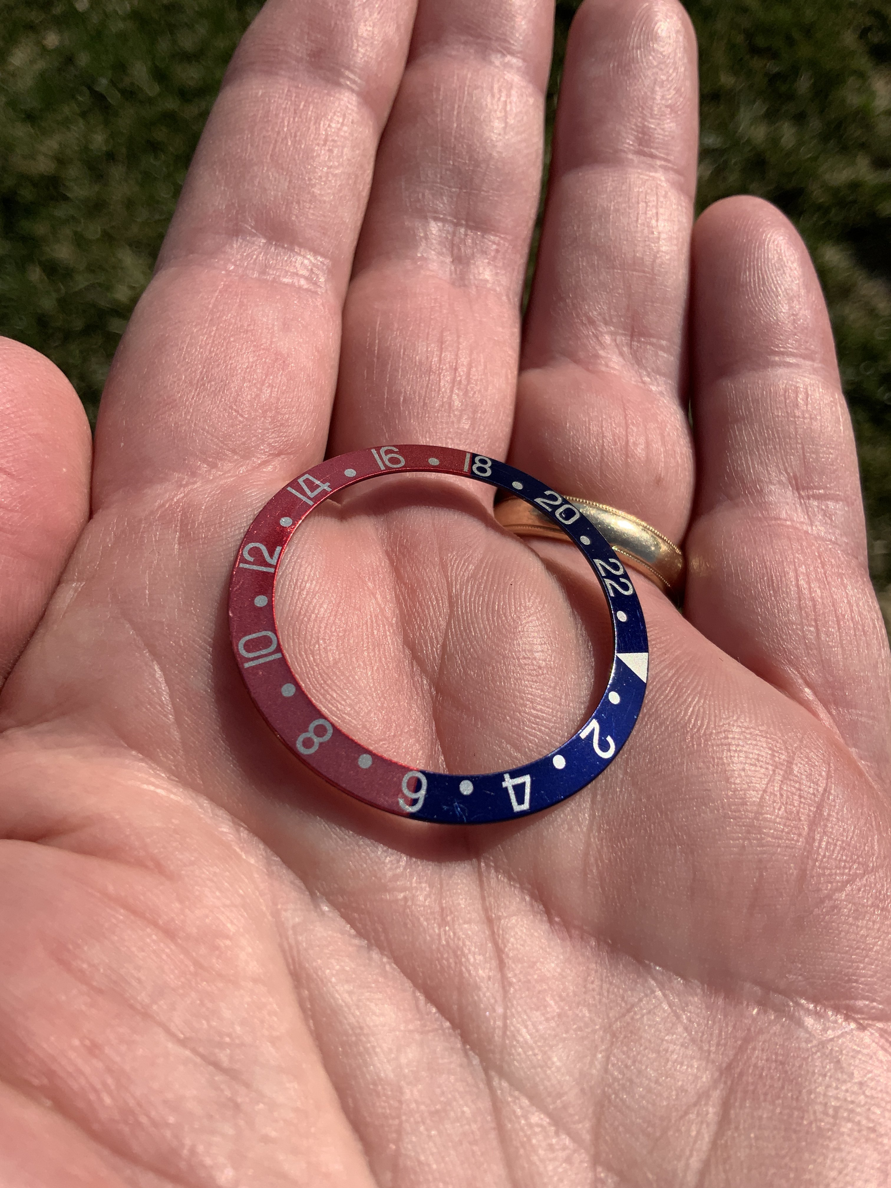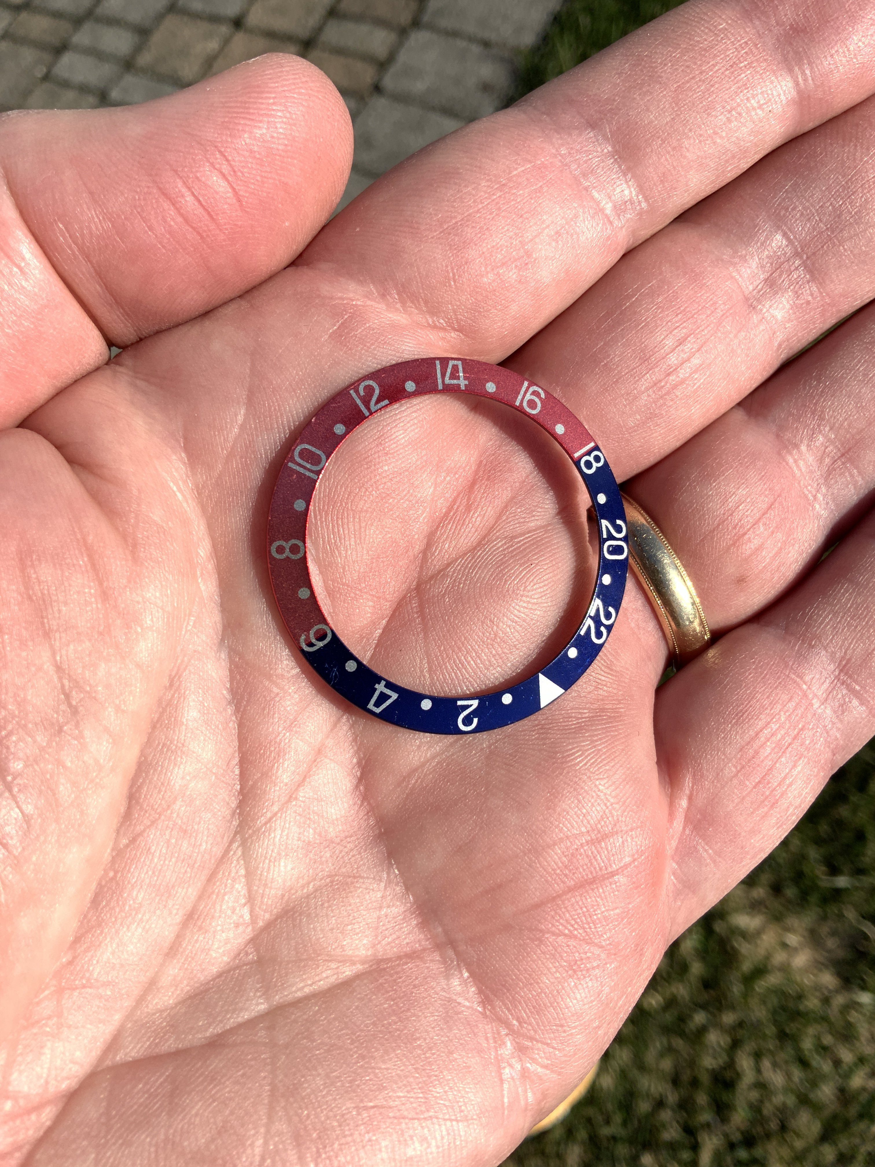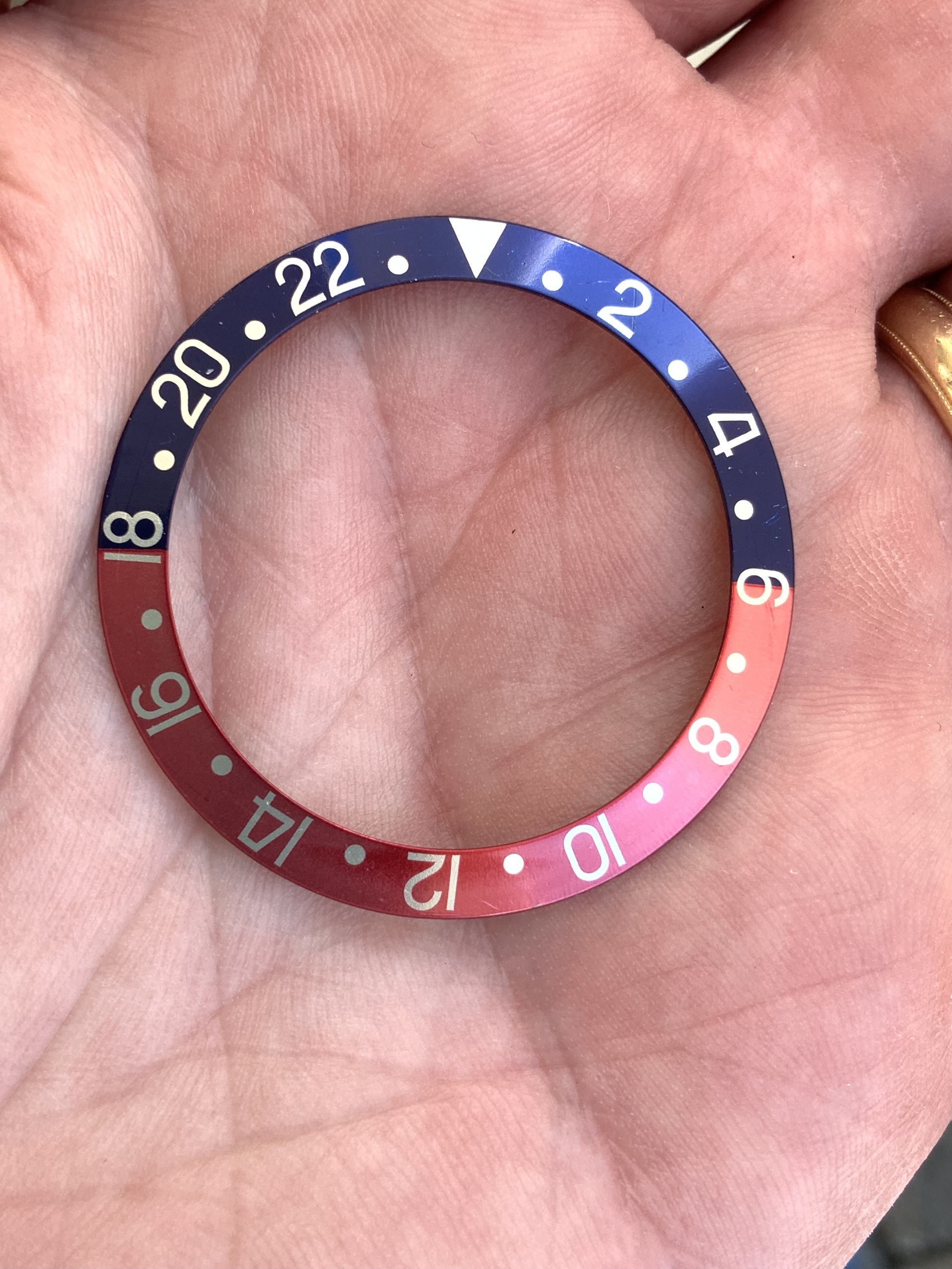 ·Up for sale is this genuine Rolex bezel “Pepsi” insert for a GMT Master 1675 or 16750 with an acrylic crystal. It’s in great condition. The blue is vibrant and the red has faded to a medium/dark pink as shown in these pictures, which are not color filtered. The back of the insert is blue. My understanding is that blue is period correct for my mid-80s era GMT 16750. Even if you have an older 1675, it will look terrific on your watch for a fraction of the price of a red back insert (which in this condition would easily cost a couple thousand dollars.)