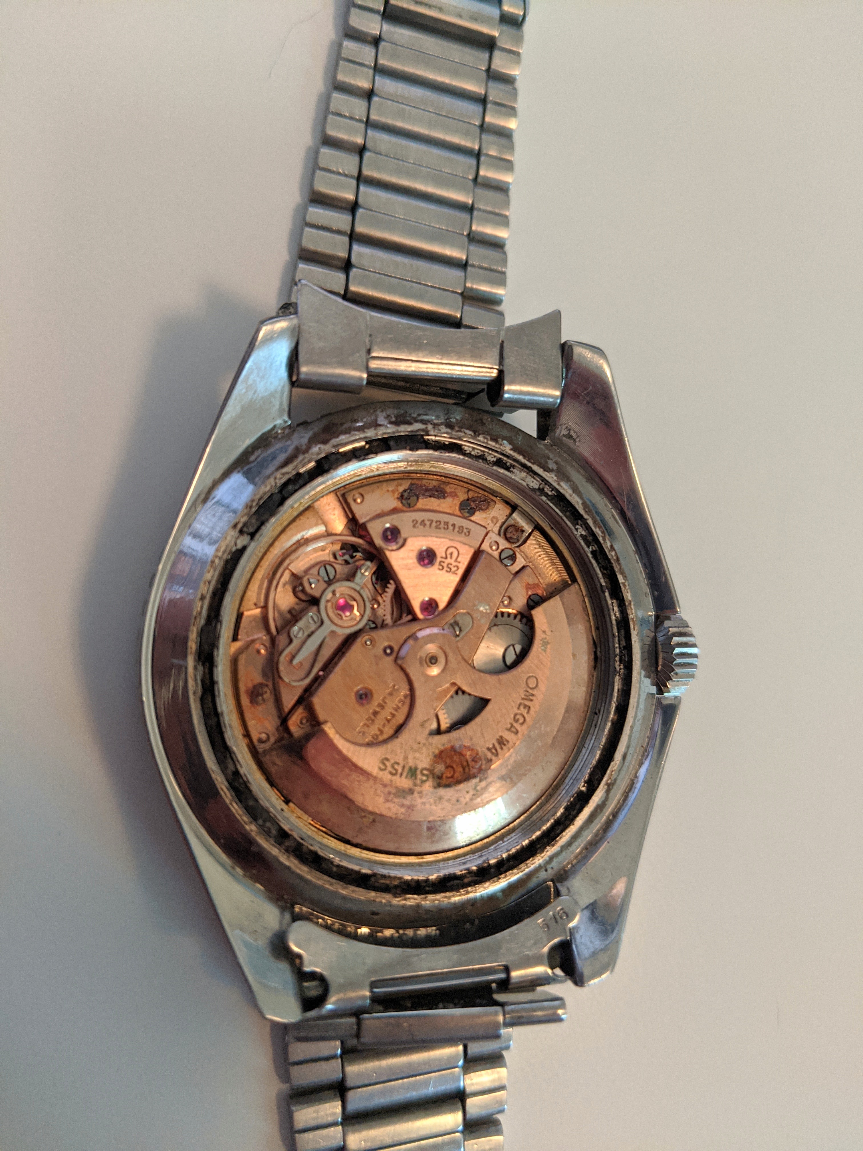 2. My father in law gave me this watch last night. He said his brother bought it for him when he was a teenager while the brother was stationed in the Azore Islands, he's checking on the exact date, mid to late 1960s. My father in law was a recreational diver and used this watch extensively for shallow water diving in mostly freshwater rivers in the central Florida area. He doesn't recall ever having it serviced. It was sitting in a drawer after many years of not being used until one year ago, when he wore it again and wore it into the same fresh water river that he used it in so many years ago scuba diving. A day or two later, it stopped working. (note condition of the gasket). As you can see from the pictures, water got into the case. As far as I know, all original parts, including bracelet.