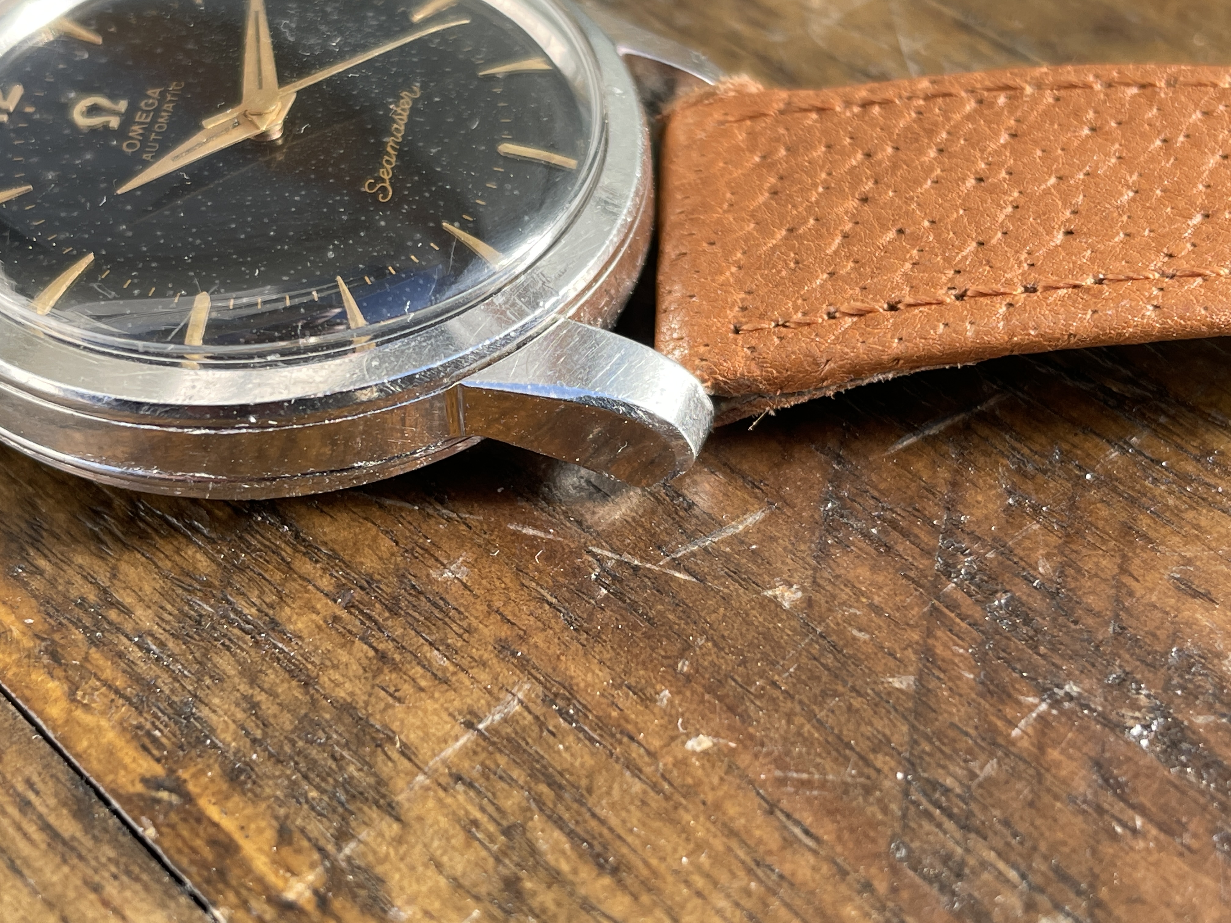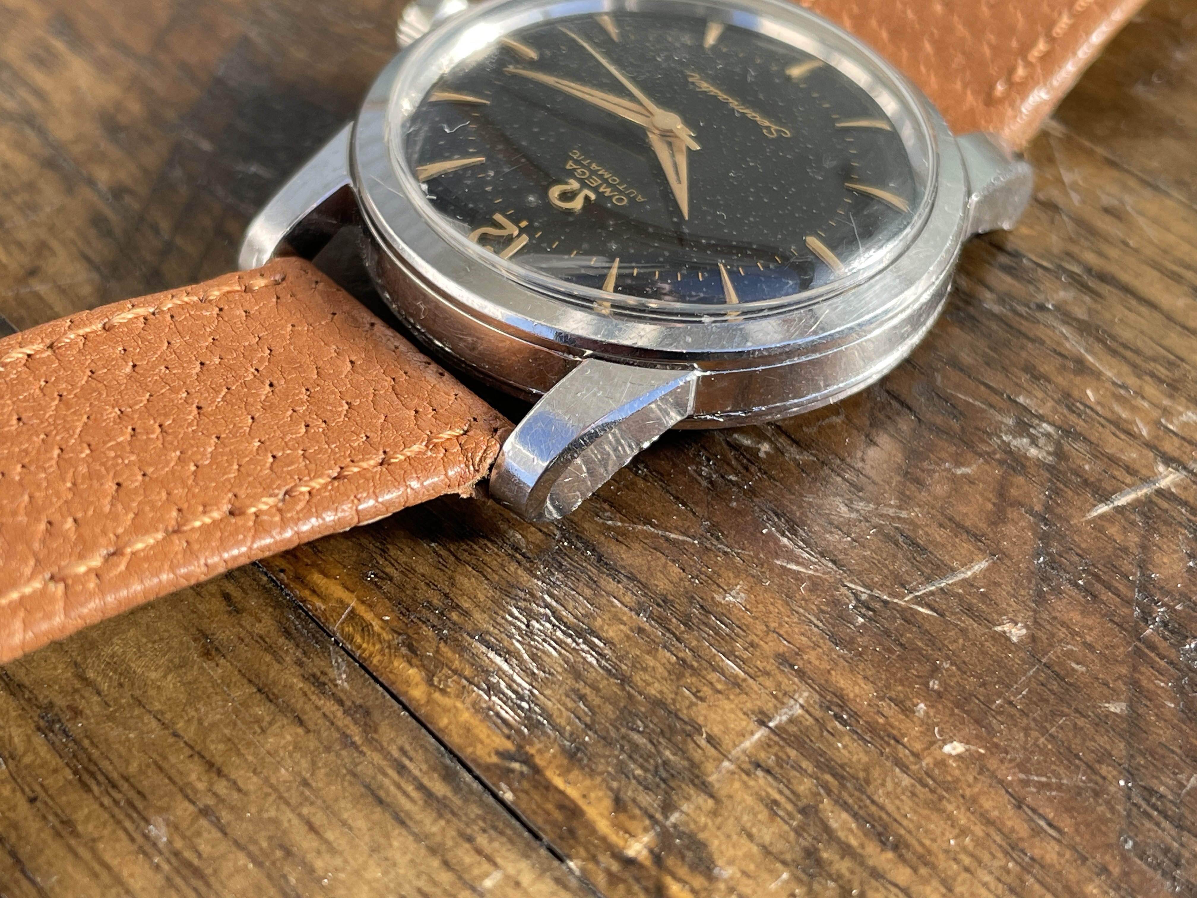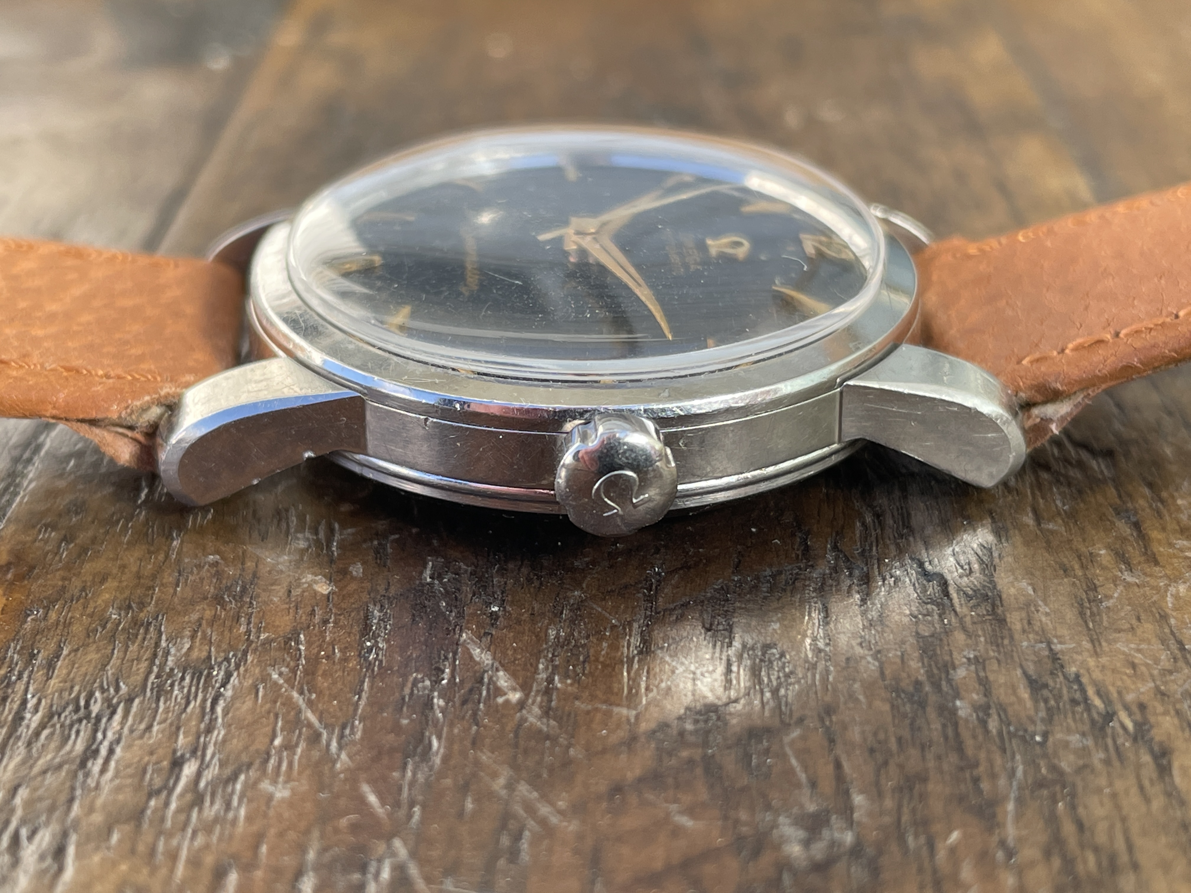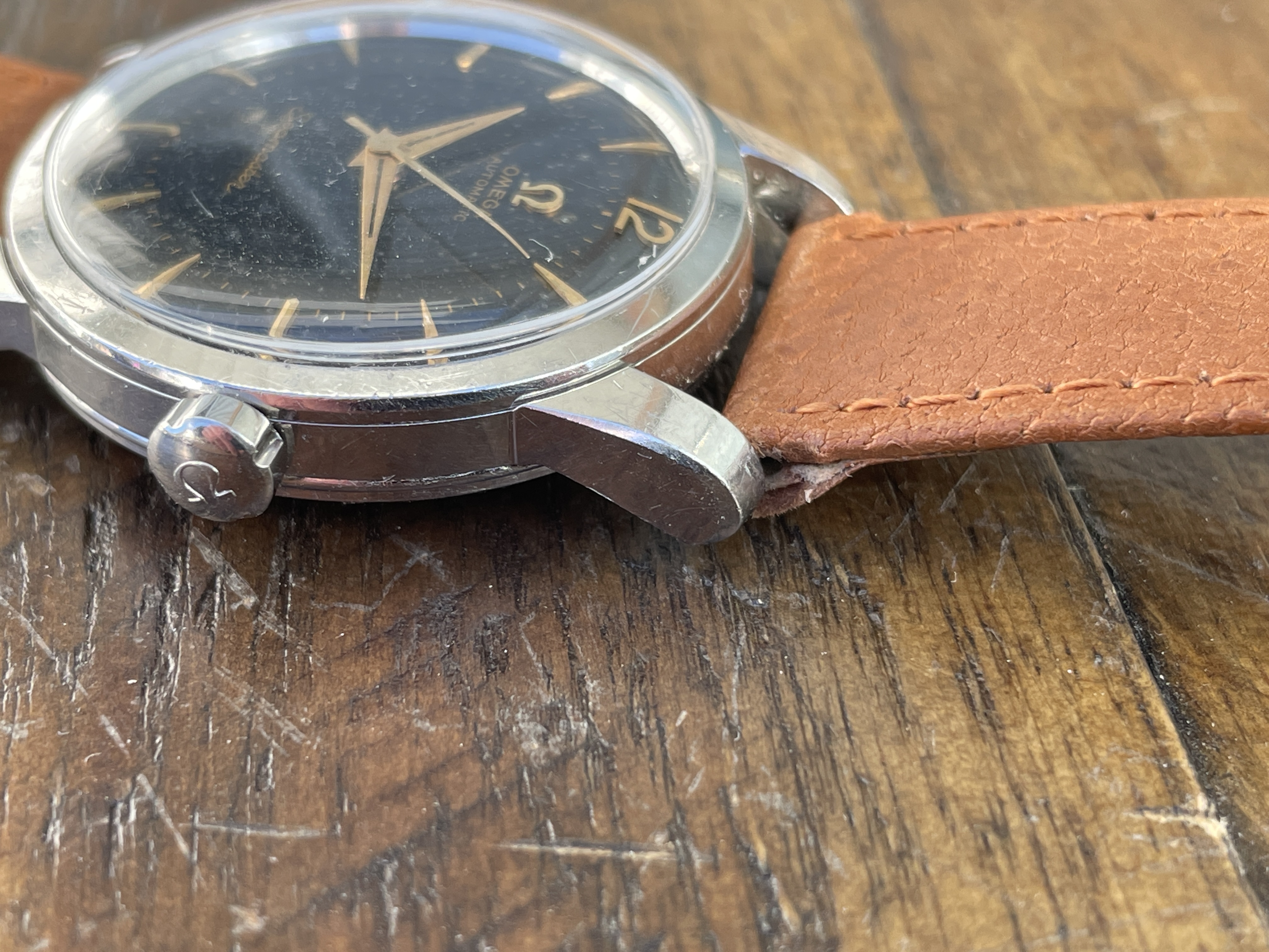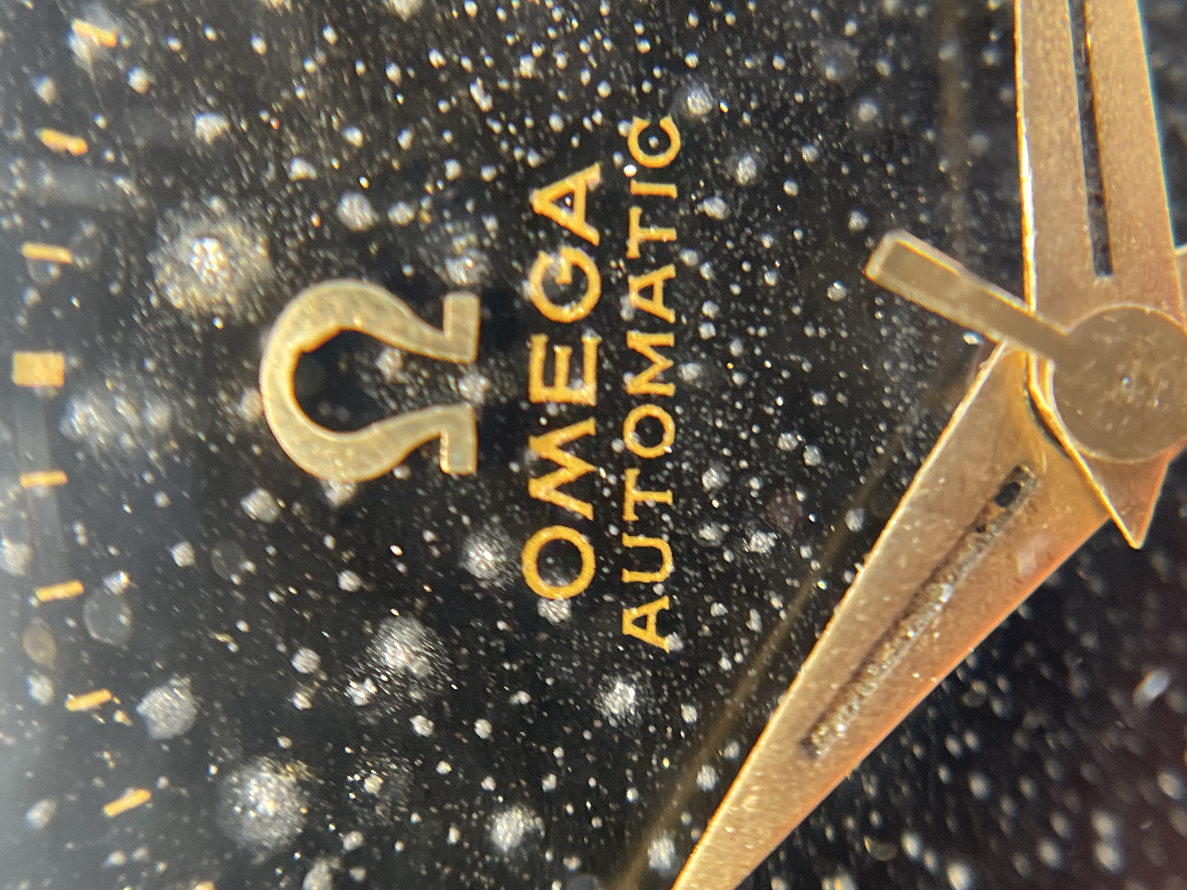 DIAL: The original black gilt omega dial has even spotting throughout. The spotting on the dial appears as small gray circles that is contrasted by the original black background. The spotting is more or less noticeable depending on the viewing angle and lighting situation. Definitely the harshest in direct sunlight. Macro photos also make it look much worse but I have included them anyways to illustrate the gilt lettering which I think looks wonderful. The dial features applied gold Arabic and dagger style hour markers and matching dauphine hands.