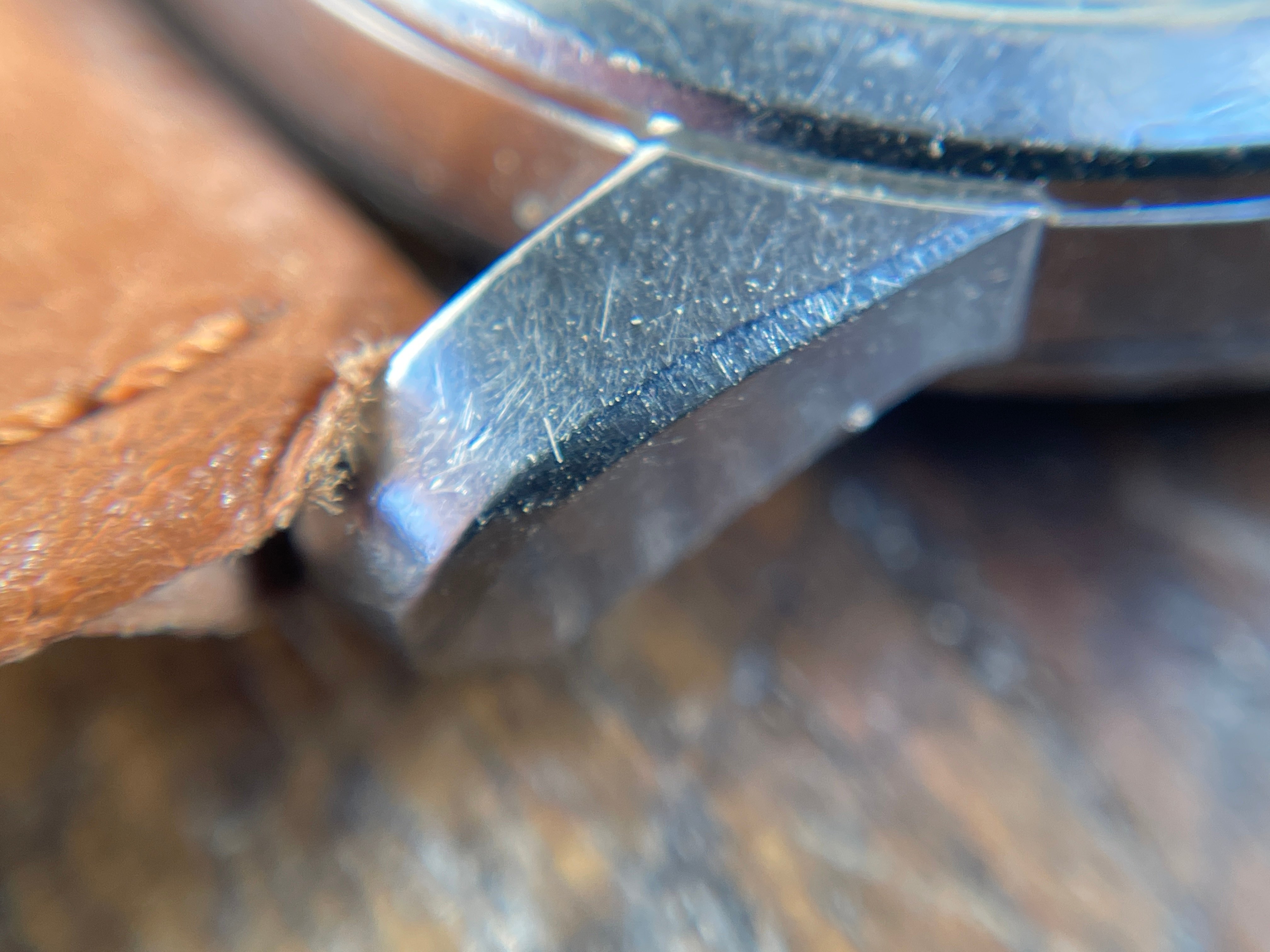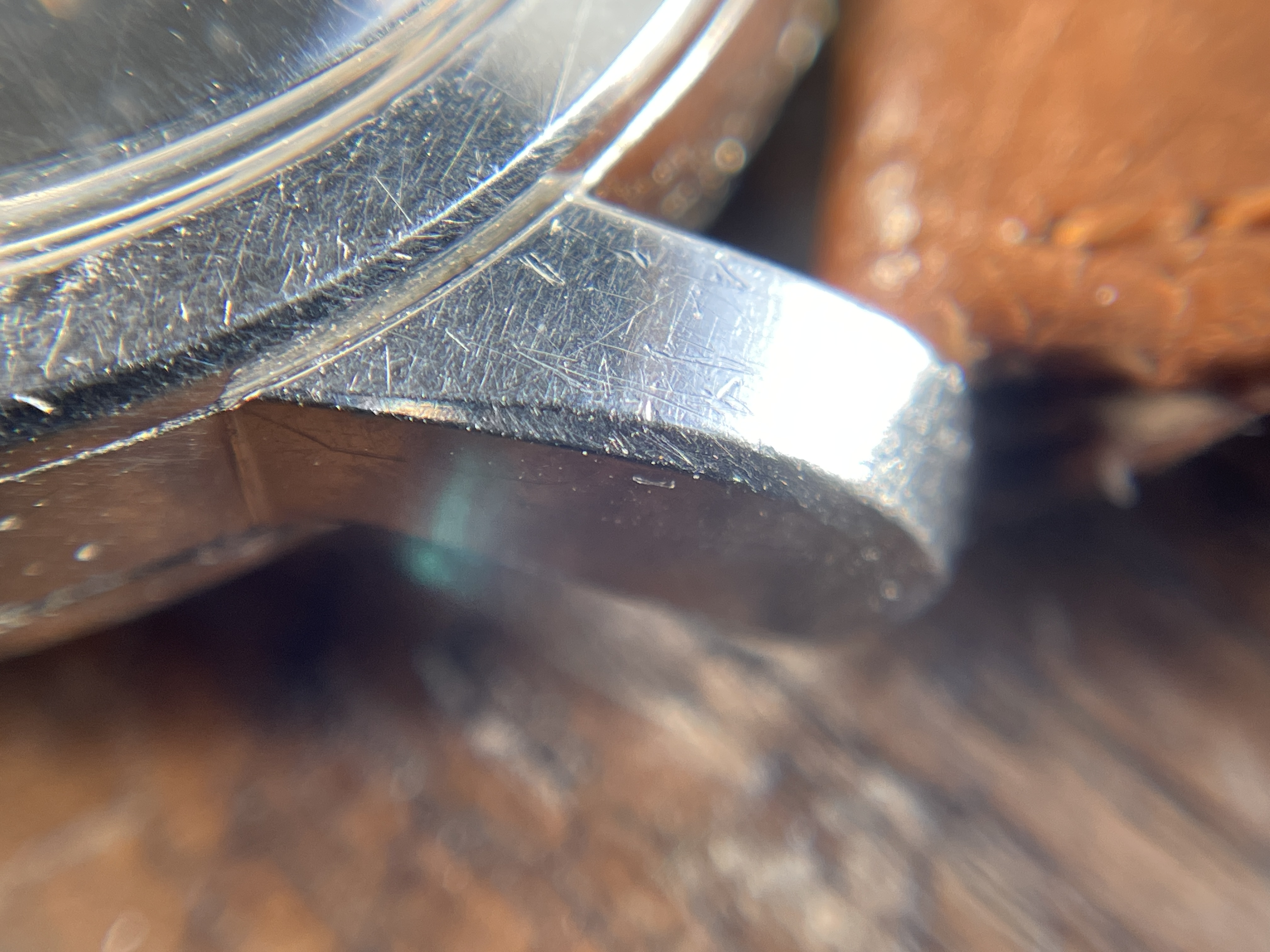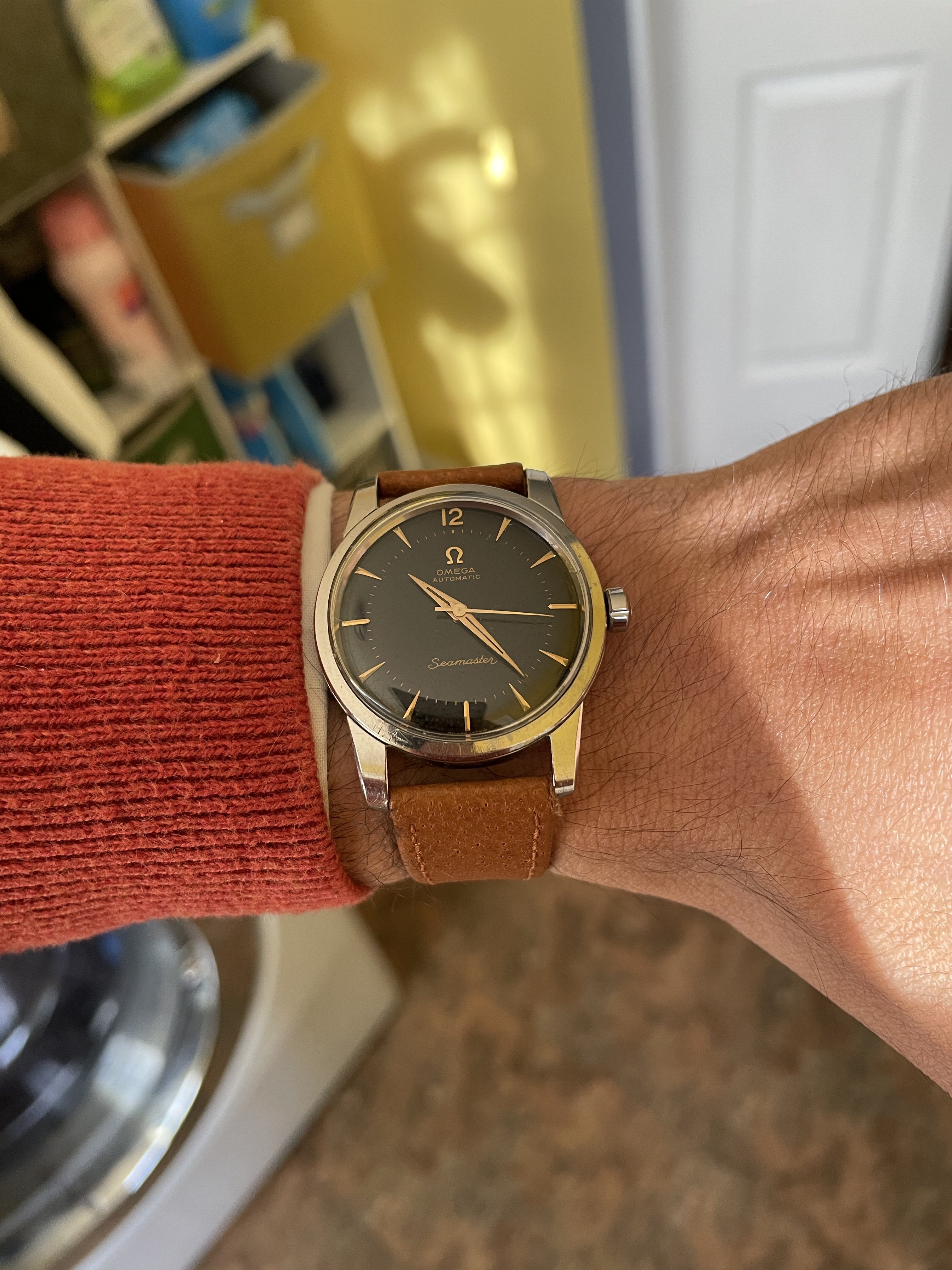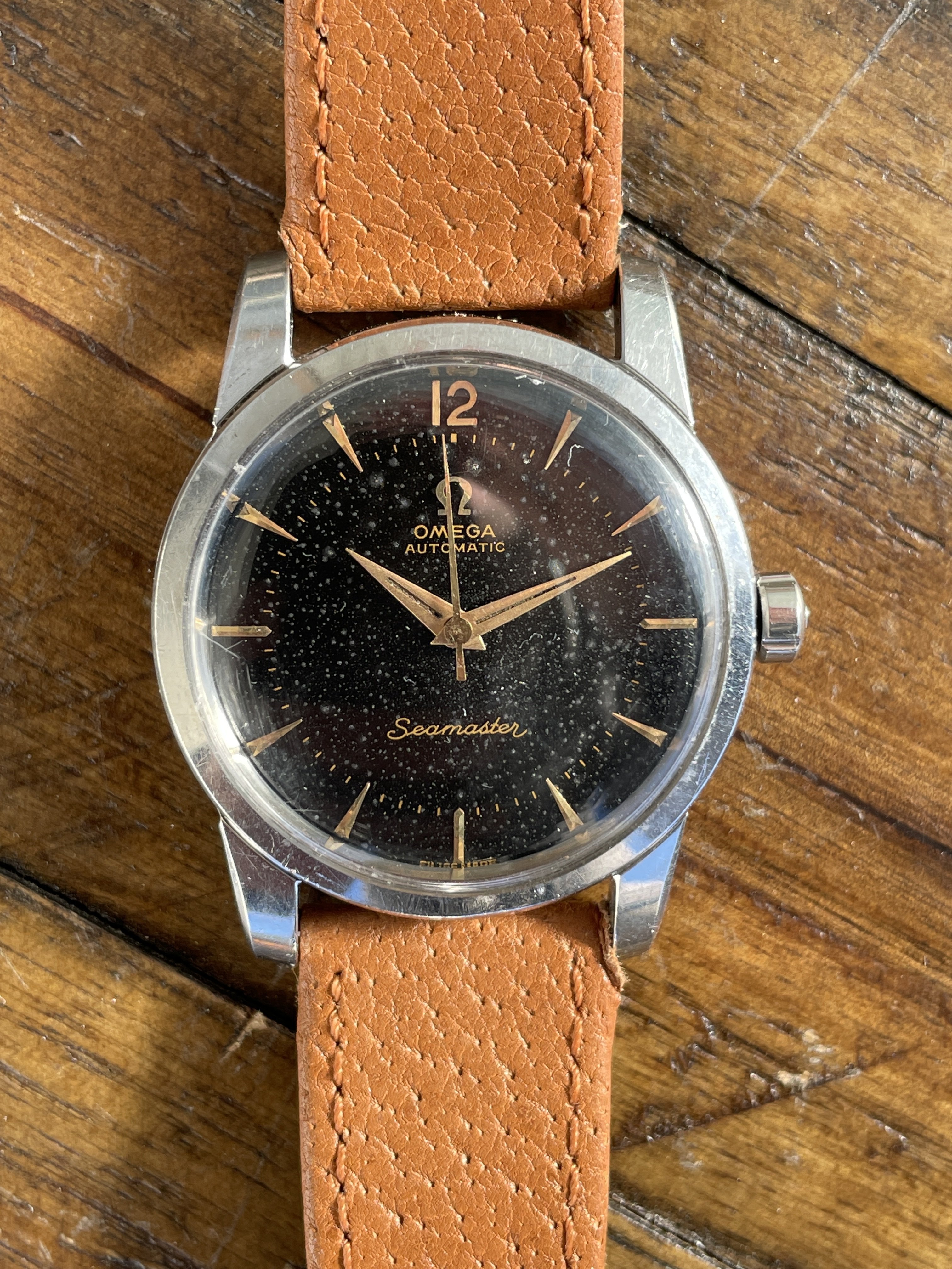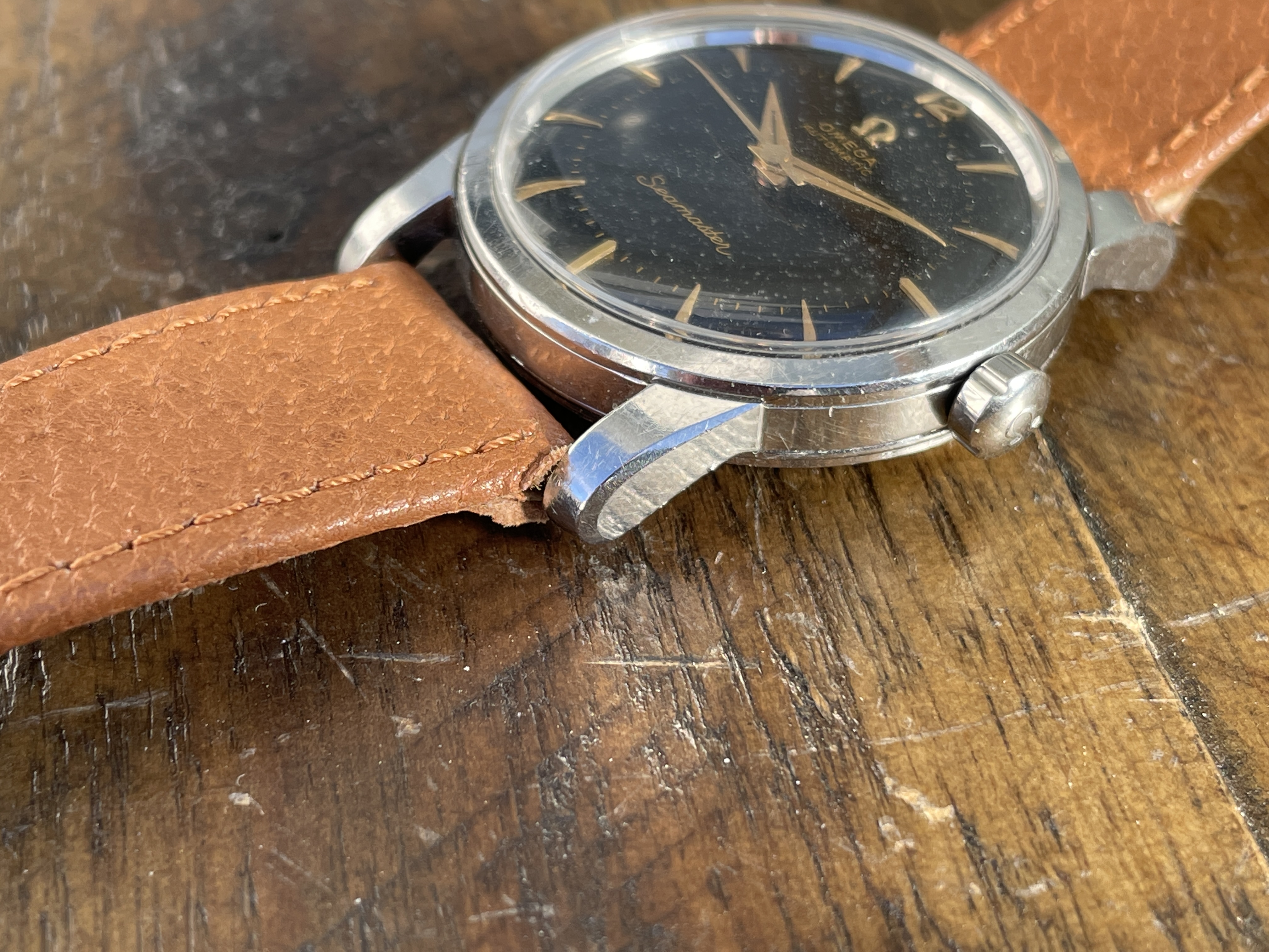DIAL: The original black gilt omega dial has even spotting throughout. The spotting on the dial appears as small gray circles that is contrasted by the original black background. The spotting is more or less noticeable depending on the viewing angle and lighting situation. Definitely the harshest in direct sunlight. Macro photos also make it look much worse but I have included them anyways to illustrate the gilt lettering which I think looks wonderful. The dial features applied gold Arabic and dagger style hour markers and matching dauphine hands.