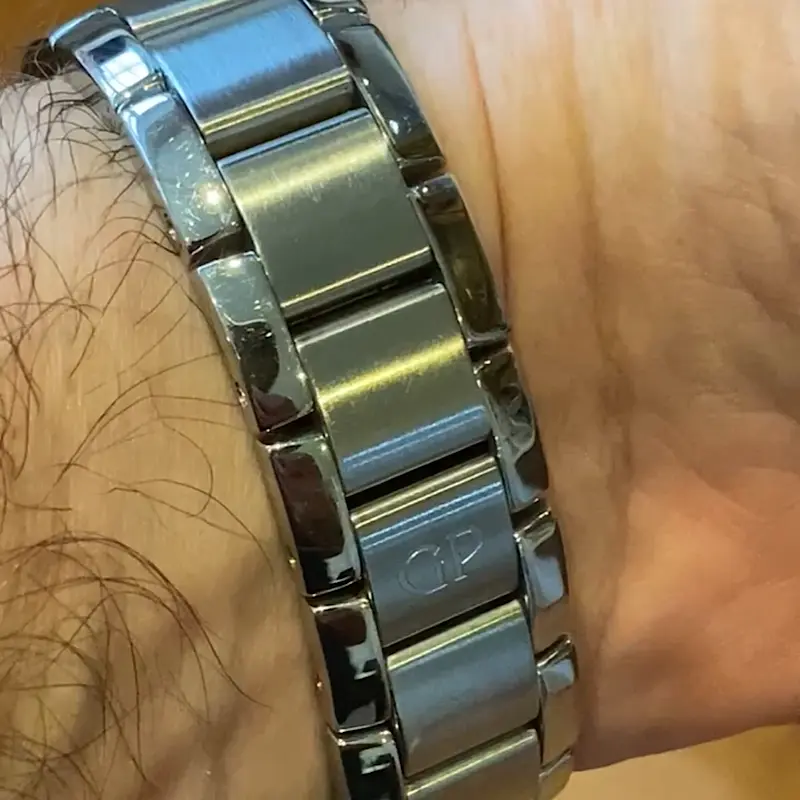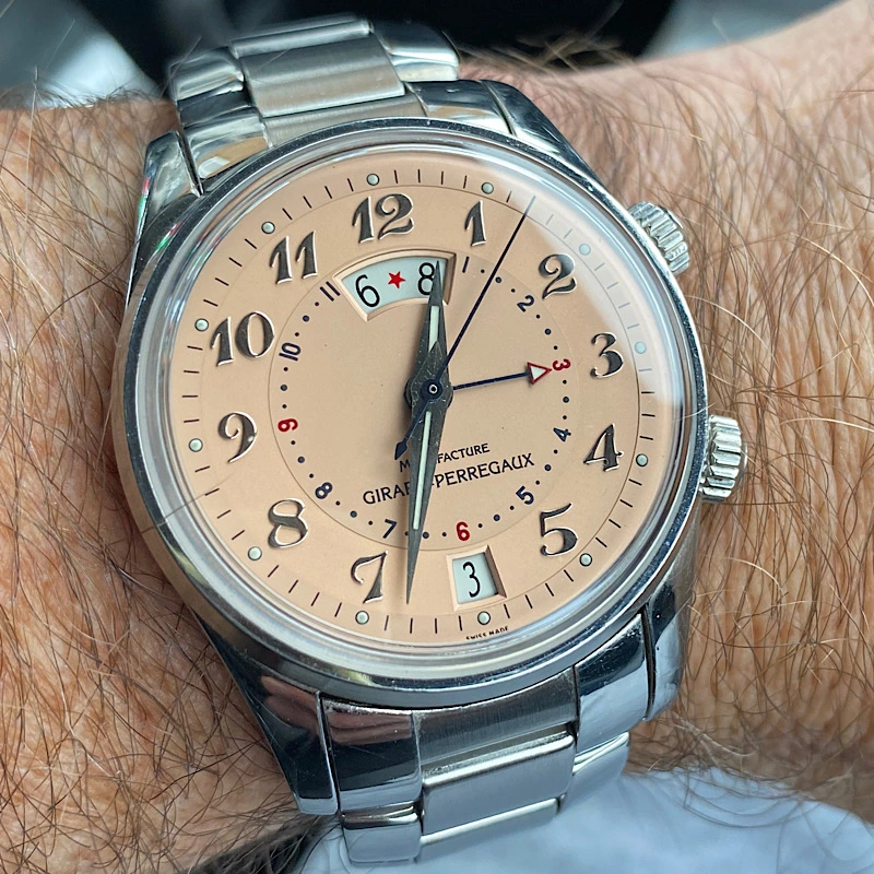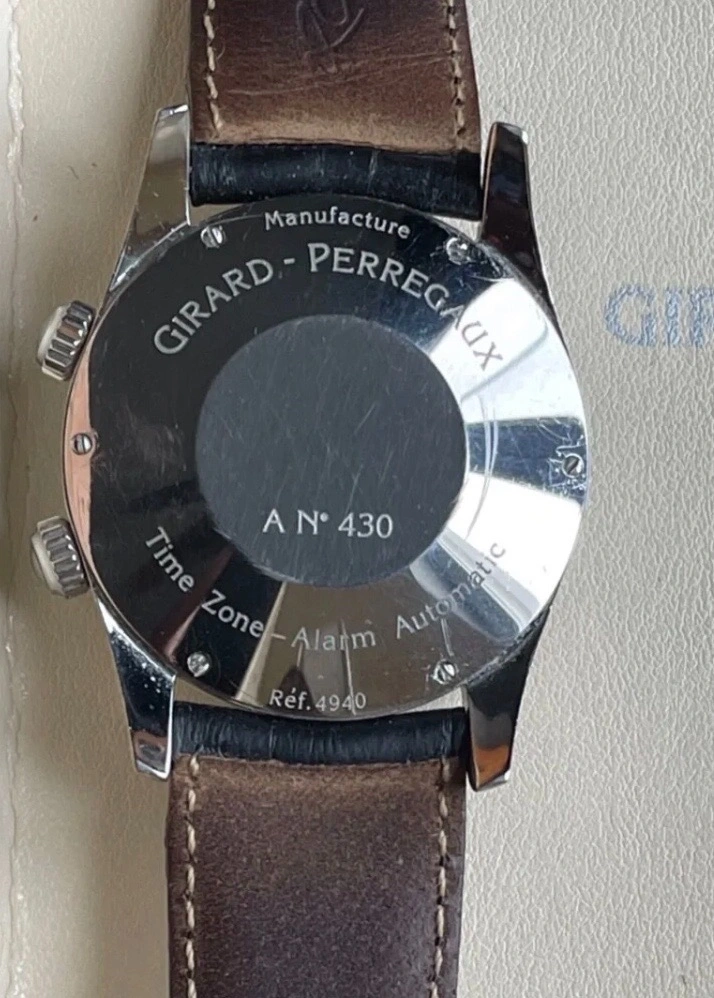 ·Reputedly only 150 made of this lovely salmon dial with Breguet numerals. Functions: hacking seconds, date, alarm, 2nd time zone (jump hour) all in a perfectly proportioned 38mm case. Now coming on its original bracelet with hidden buckle, complete with original GP box and eBay authentication card. All functions working and timekeeping good, but service history unknown. Case appears unpolished with a few marks commensurate with age. I have tried to show these in hi-res images.