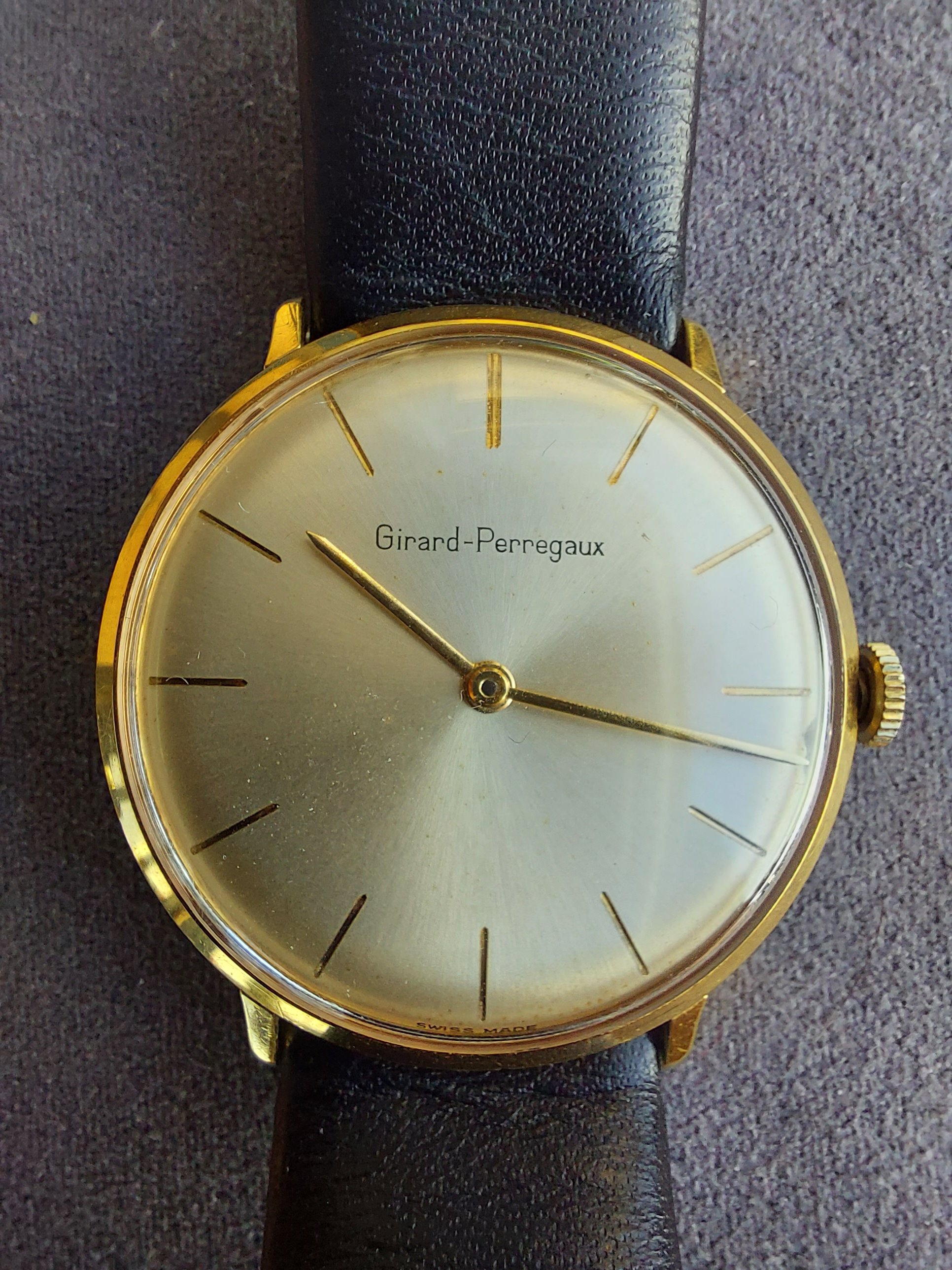 Offering my GP dress watch here - serviced last year by Jerry at Jerry's Watch Repair in Seattle. Working well. Nice clean watch, excellent Girard Perregaux impression on dial. Some oxidization on dial, evidence of prior water intrusion by crown, not unusual. Some scratches on back from yours truly in bunged attempts to open. Obverse hour markers imprinted into dial, no shadow; enables a very clean legible face. Honest, solid, clean vintage watch. $300 f and f paypal.