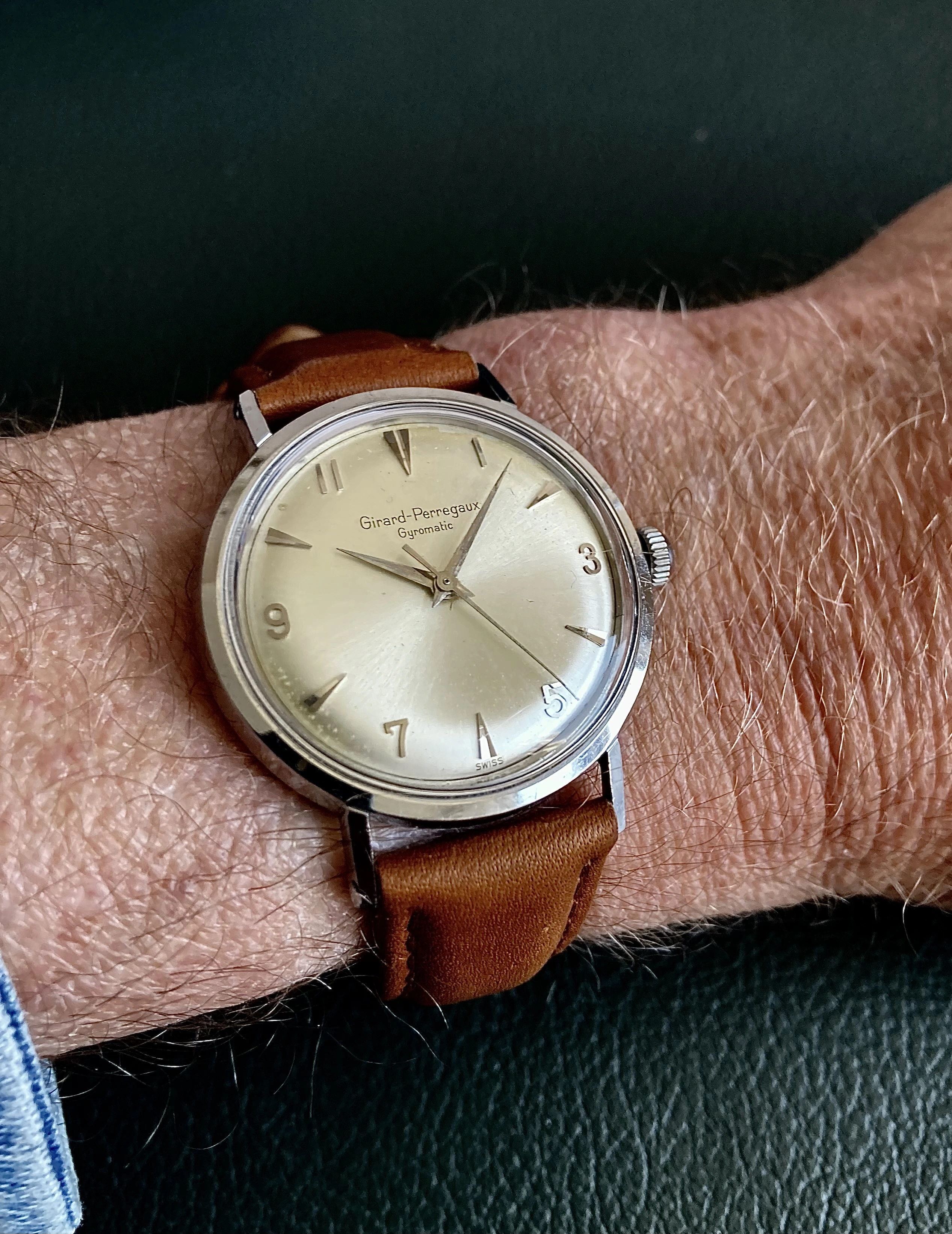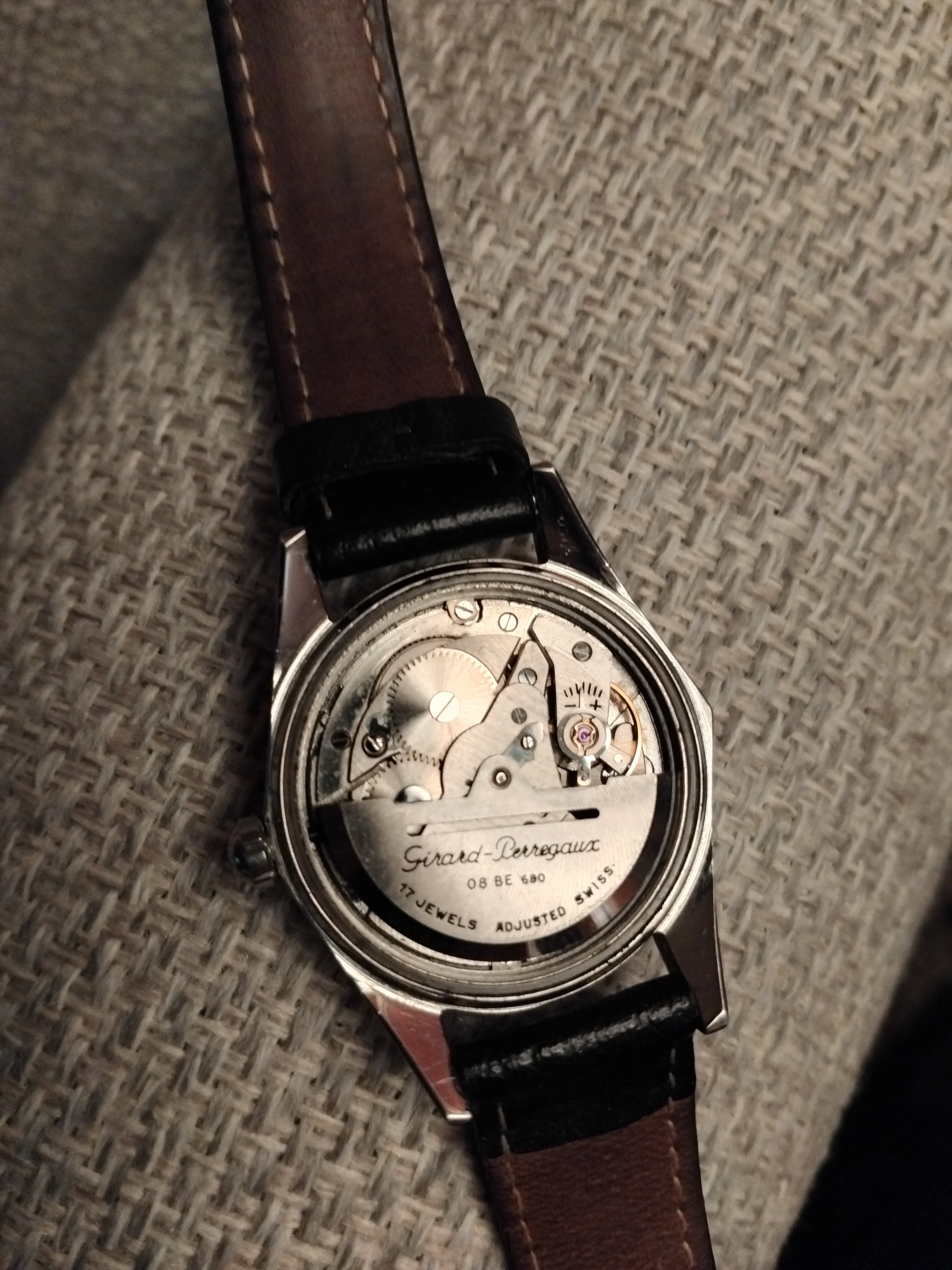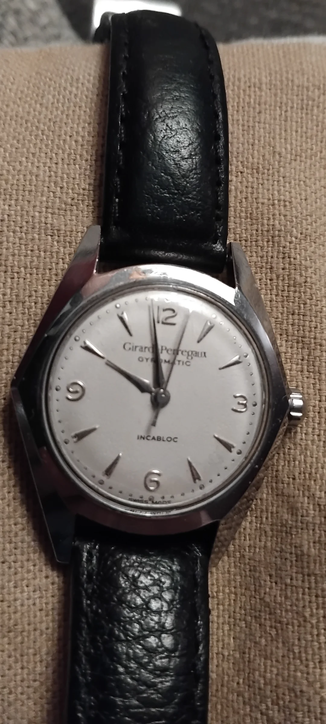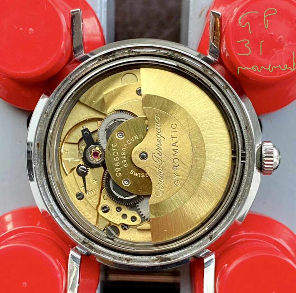 ·Here is my early 50s Gyromatic with the uncommon diamond shape? Case ...I've seen a old advert with a GP of this type with the heading Pour l'homme de action..so presumably it was a sports watch.Its typical Perregaux inside , another companies movement ( a Schild i think) with the makers logo milled out and thd movement blinged up a bit with better springs.