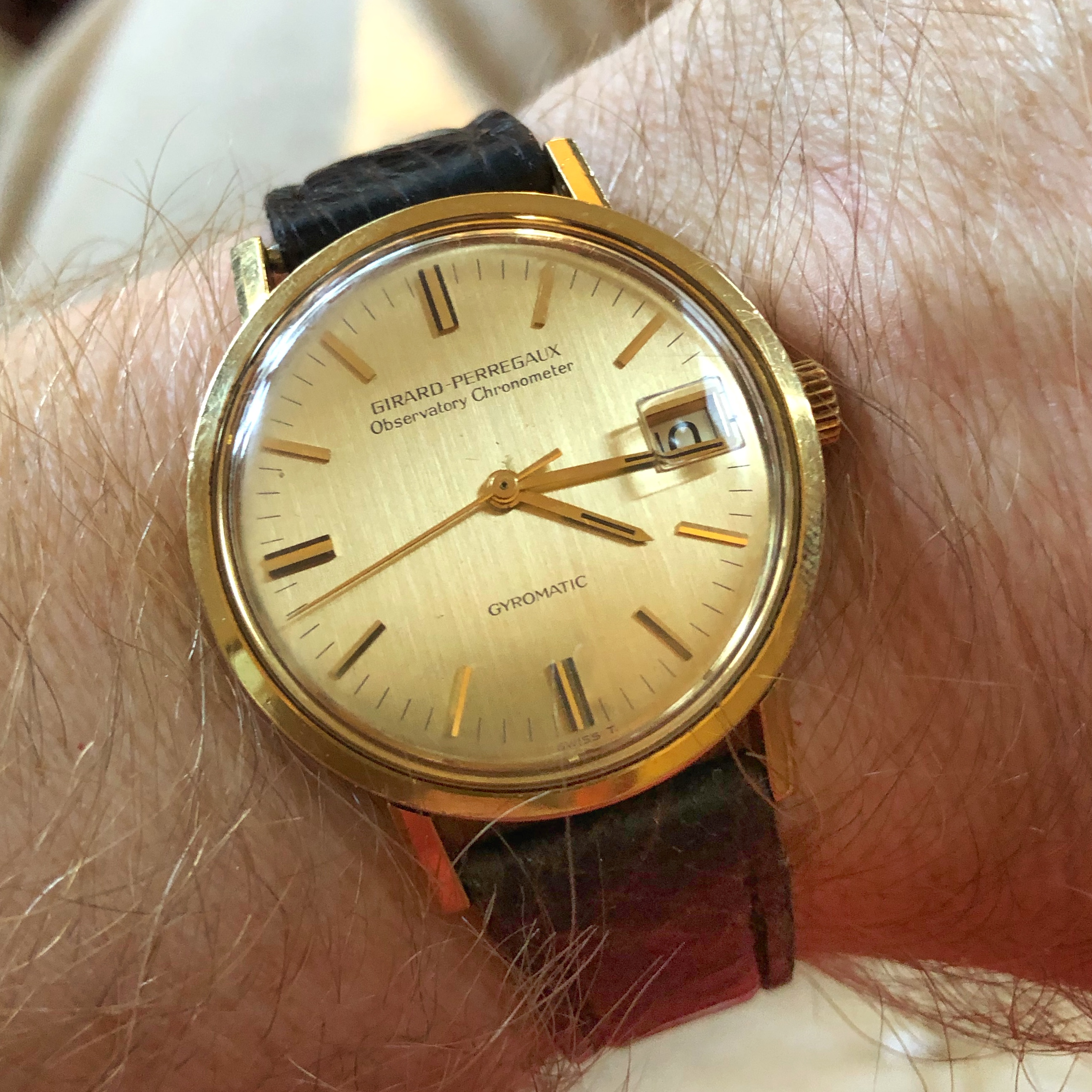 My watch is Chronometer number 15646 that was timed by P. Nicolet in 1967, receiving an N-Score of 21.45. It is cased in a 34mm 18kt yellow gold case with a brushed yellow gold dial and applied gold stick numerals.