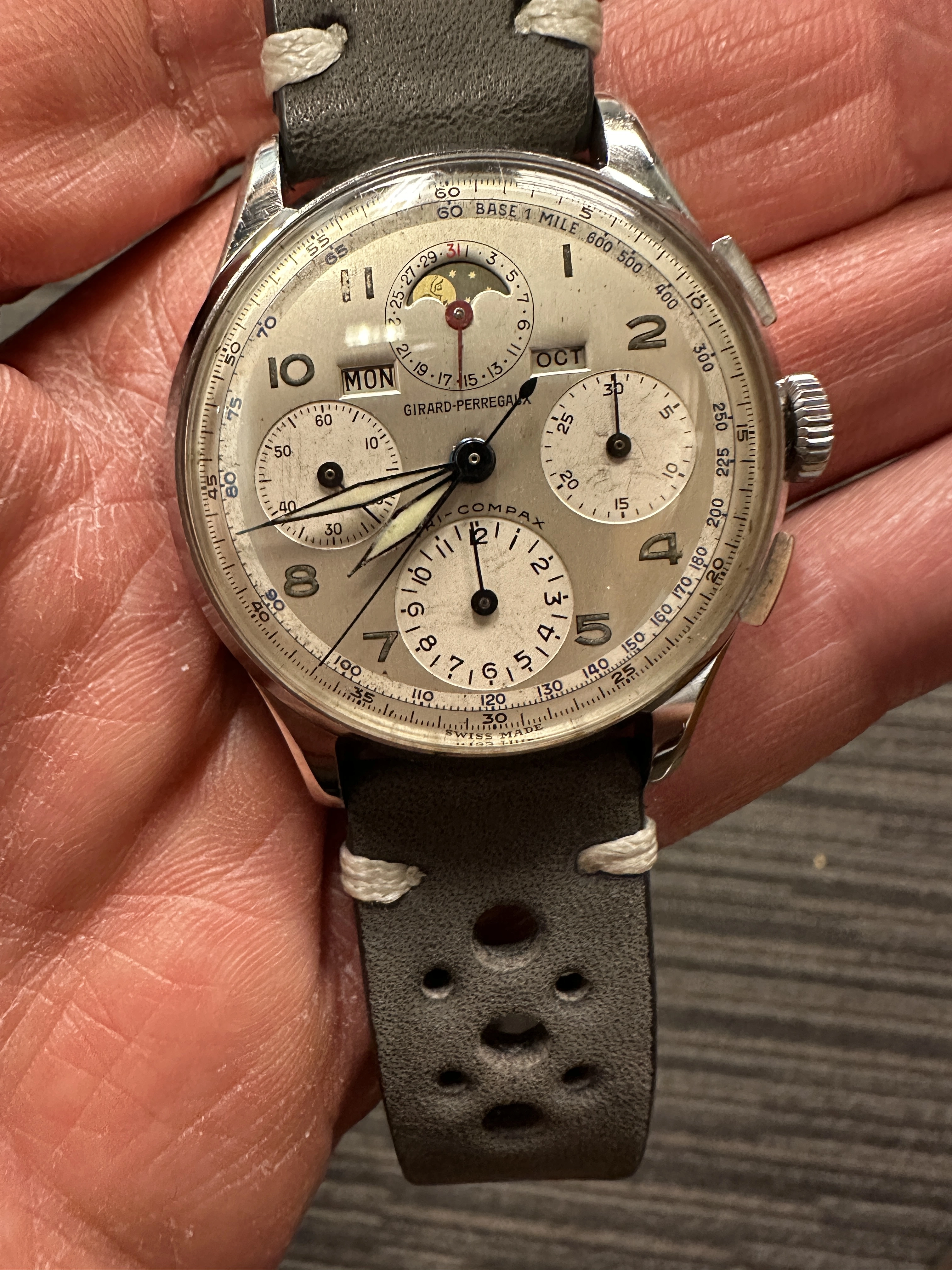 ·I’m wondering what folks think about this Girard-Perregaux Tri-Compax I saw at a local jewelry shop. It sure looks to be in decent shape to me, but I’ve been burned before. The sub-dials are significantly lighter than the main dial, but maybe that’s normal? It looks similar to this piece: https://www.ssongwatches.com/products/girard-perregaux-tri-compax. Thanks all.
