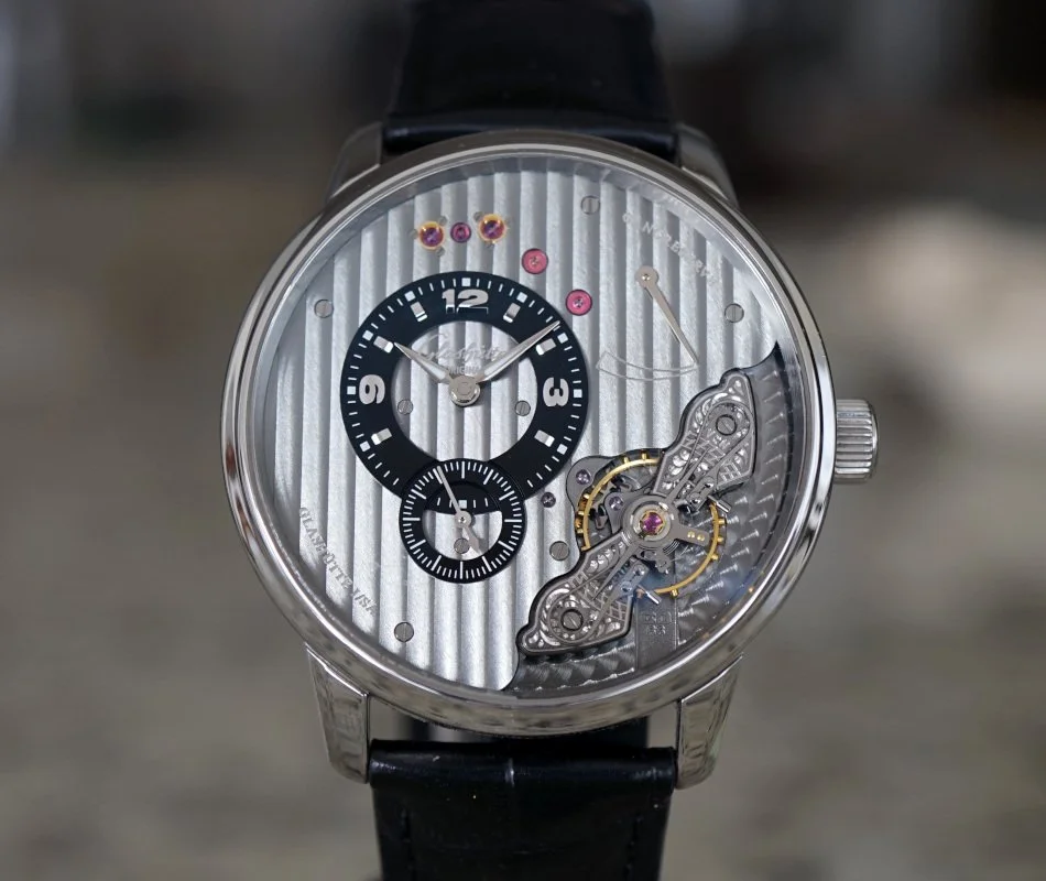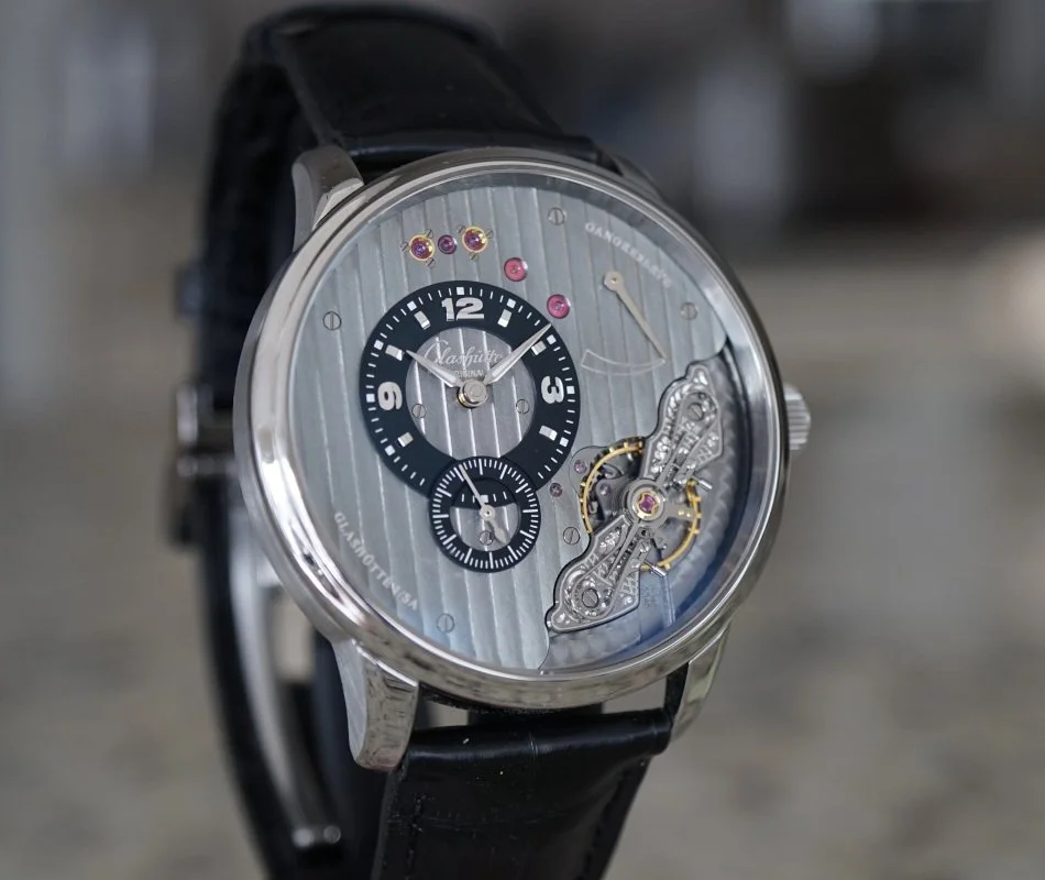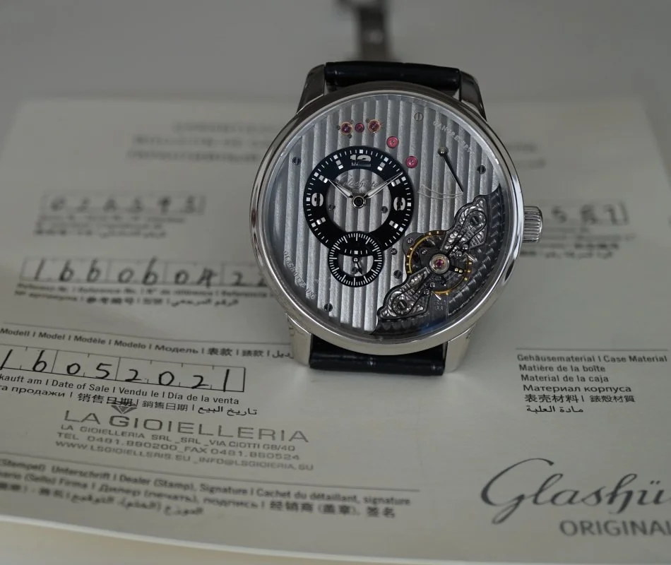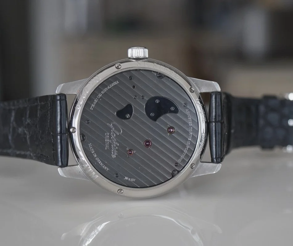 ·Glashutte Original PanoInverse XL 1-66-06-04-22-05, 16606042205, stainless steel case on a strap with a matching steel deployant clasp, manual wind Glashutte caliber 66-06 movement ("mirrored" movement design), 41-hour power reserve, gray three-quarter plate is used as dial, power reserve display, small seconds, sapphire crystal, display back, water resistant to 50 meters. Diameter: 42mm, Thickness: 11.8mm. Excellent conditionwith original warranty card