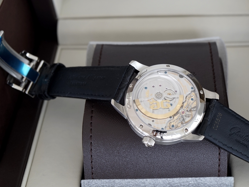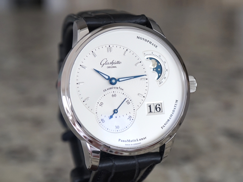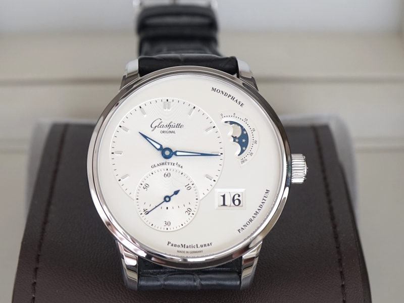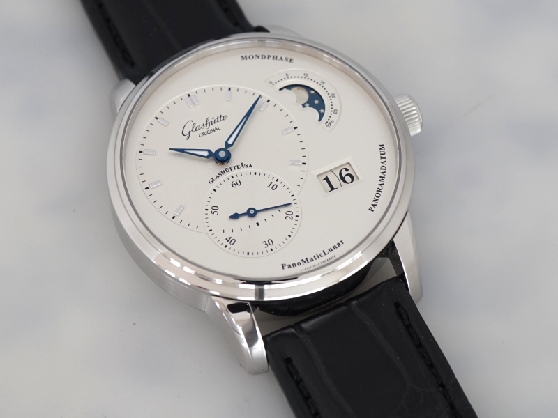 ·Glashutte Original PanoMaticLunar , Ref:1-90-02-42-32-05 , stainless steel on a strap with a stainless steel deployment buckle, automatic Glashutte Caliber 90-02 movement, big date indicator at 4 o'clock, moonphase indicator at 2 o'clock, display back, silver dial with applied white gold index and Arabic numerals, polished 18k white gold hands, time and date dials have fine guilloche texture, water resistant to 50m, Size 40mm, Thickness 12.5mm, Unworn with Original box and Papers