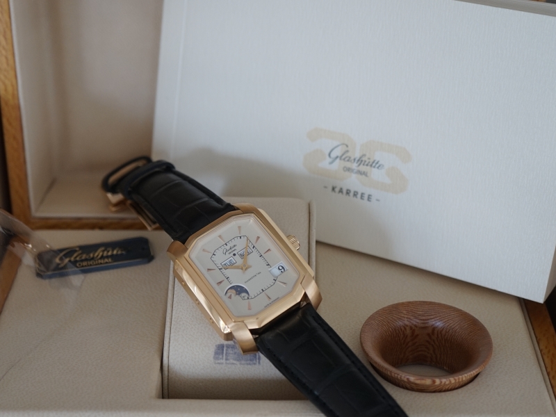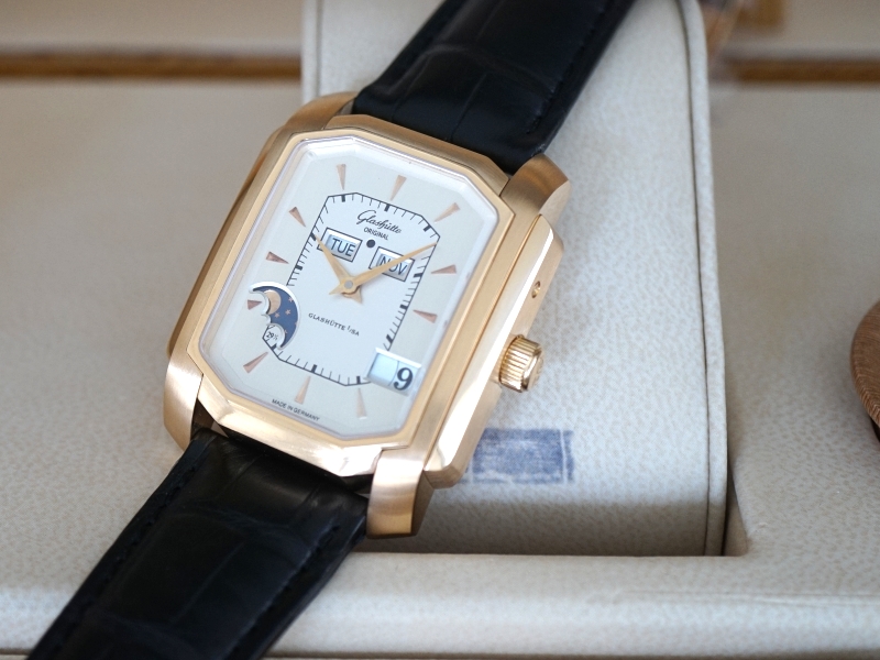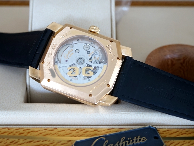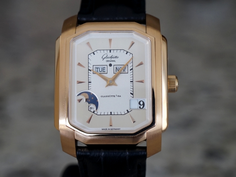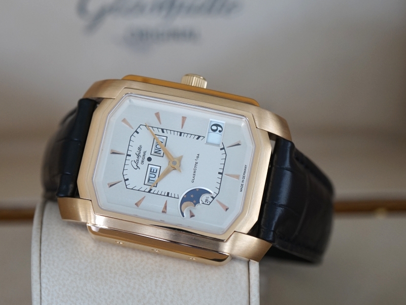 Ref. 39-51-01-01-04, 18K Gold, silver toned dial, perpetual calendar function, on a Glashutte Original strap and deployant buckle, Big Date function, Display Back, Mint with box and papers