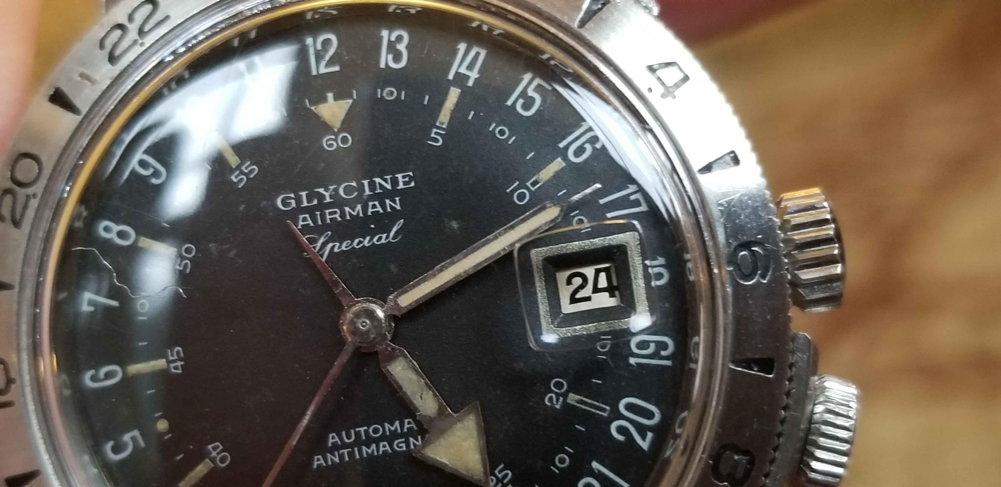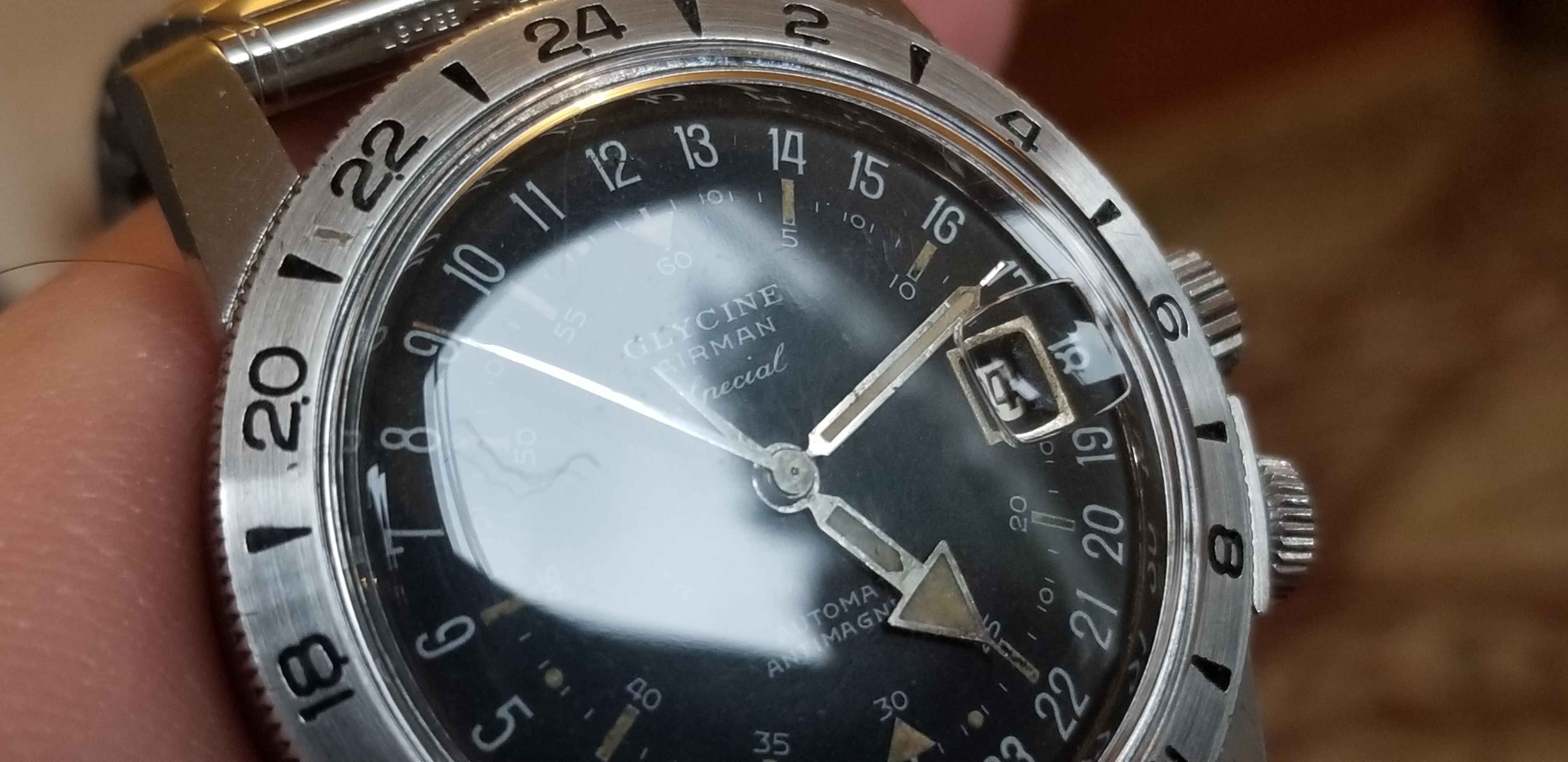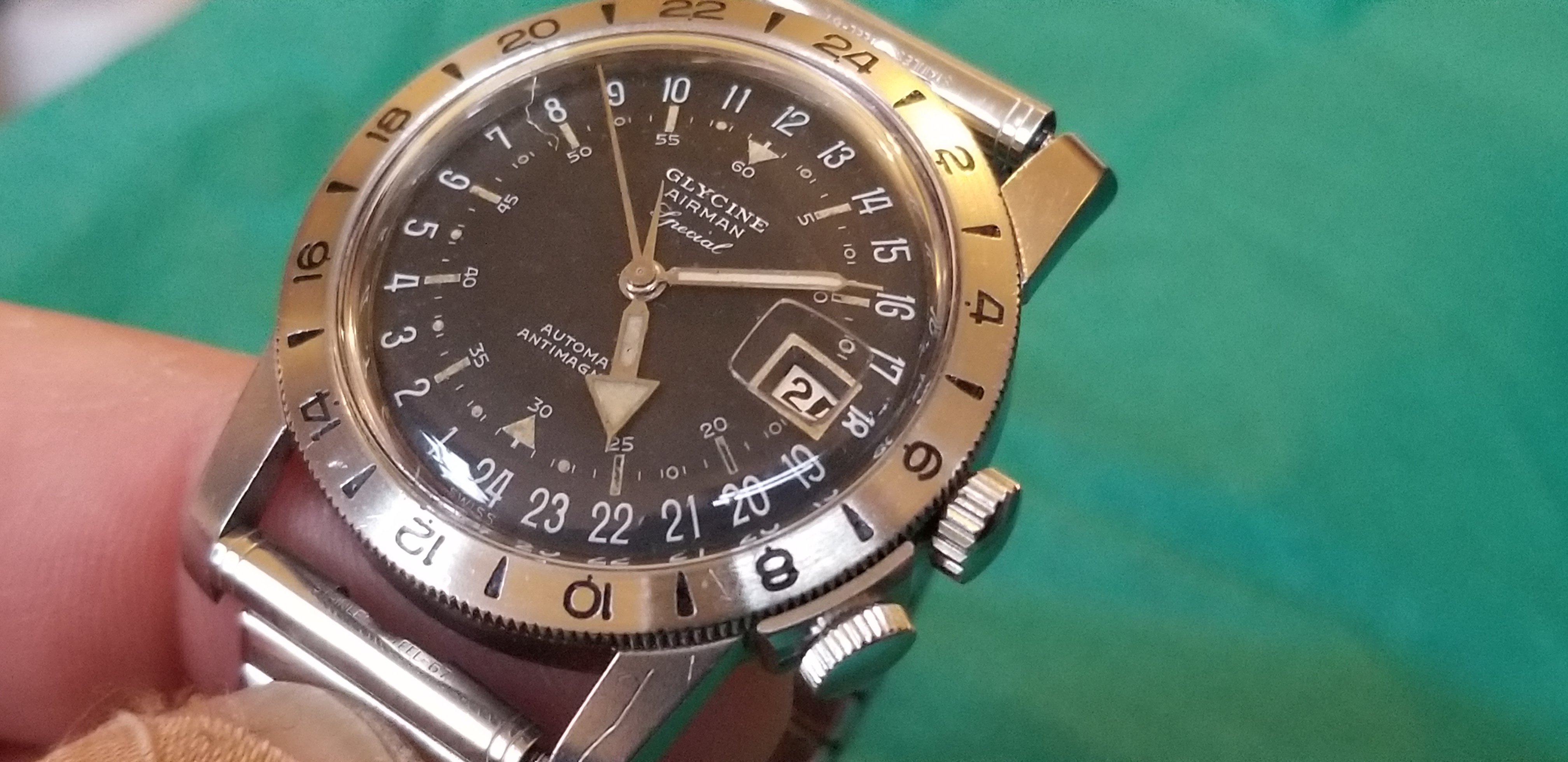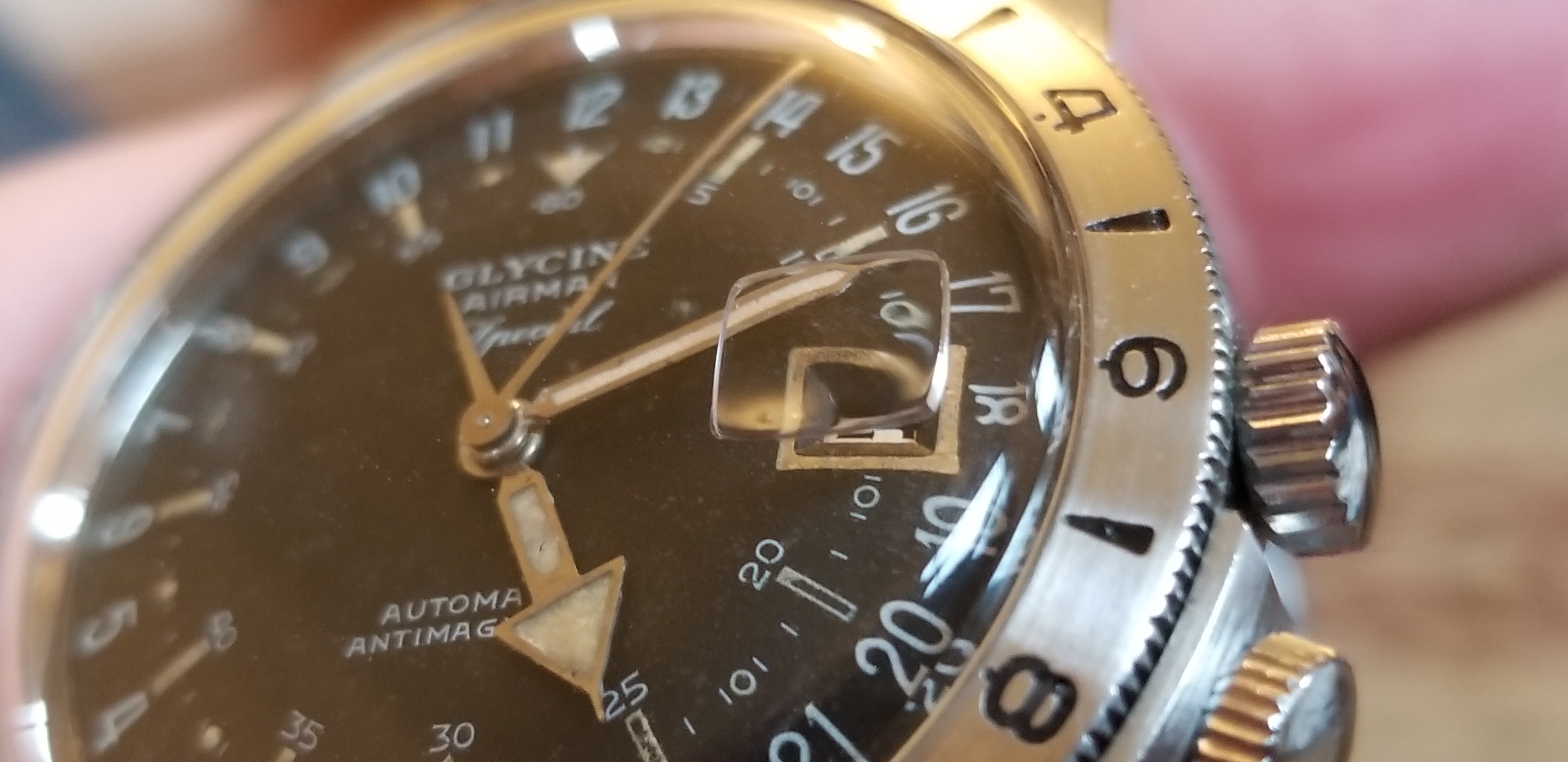 It's a fun and attractive watch. The sweeping small lollipop is mesmerizing. I also like the pre-Glycine crown dials. This particular watch is a bit unusual as it does not include the automatic writing on the dial and has a nice splash of red in the date, along with the metal surrounding the window. It's in great condition, having been serviced by @James Sadilek.