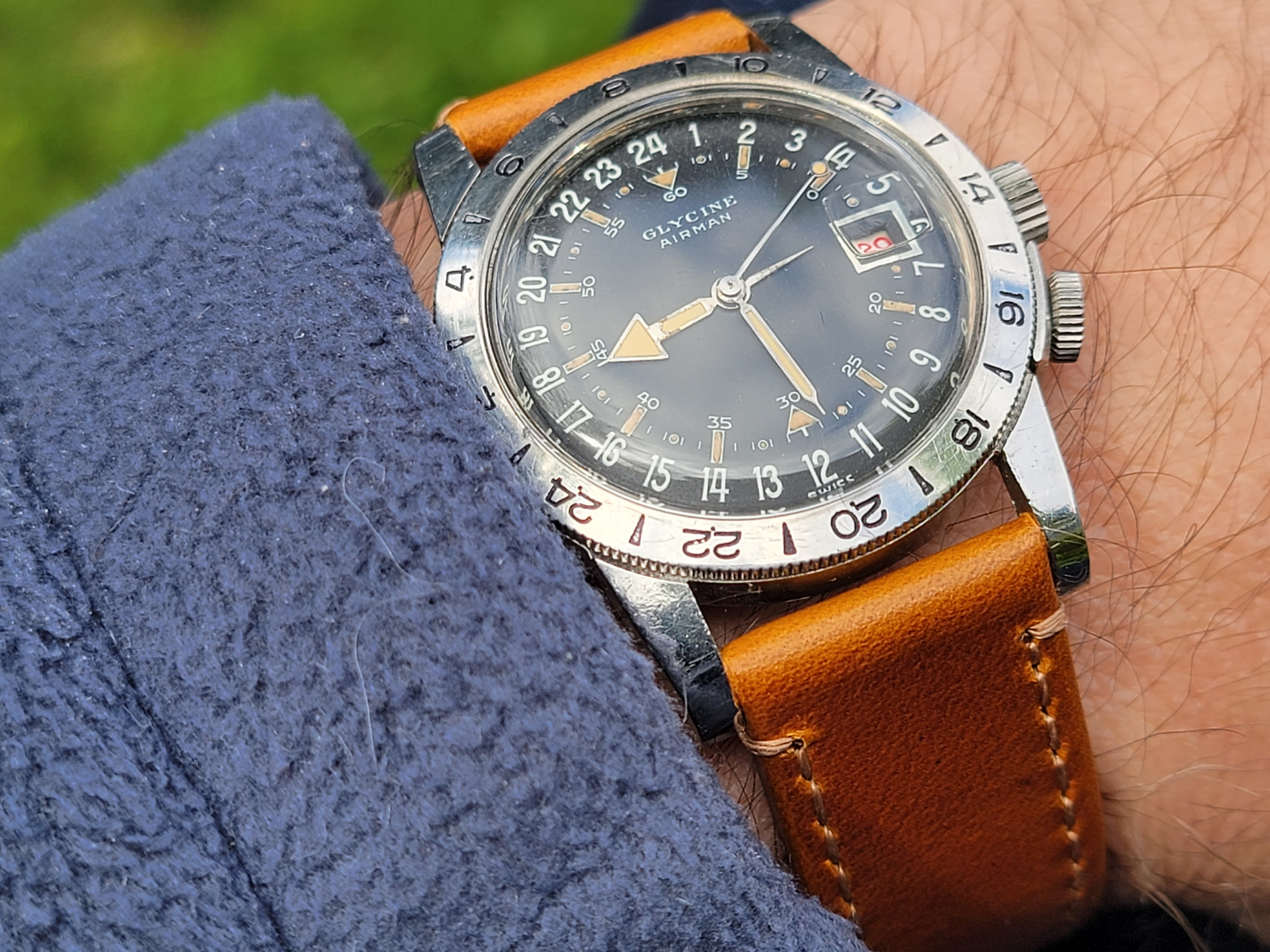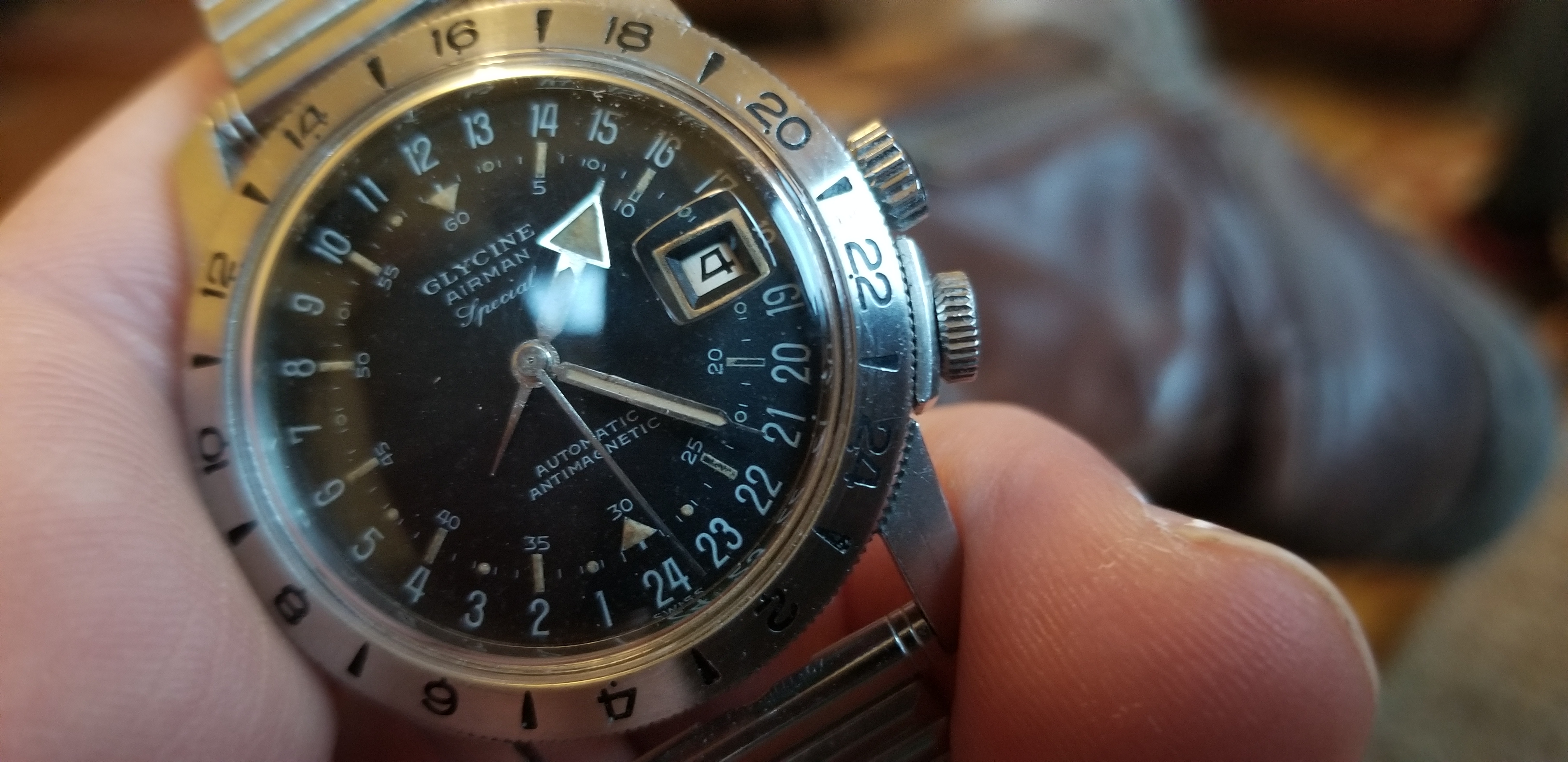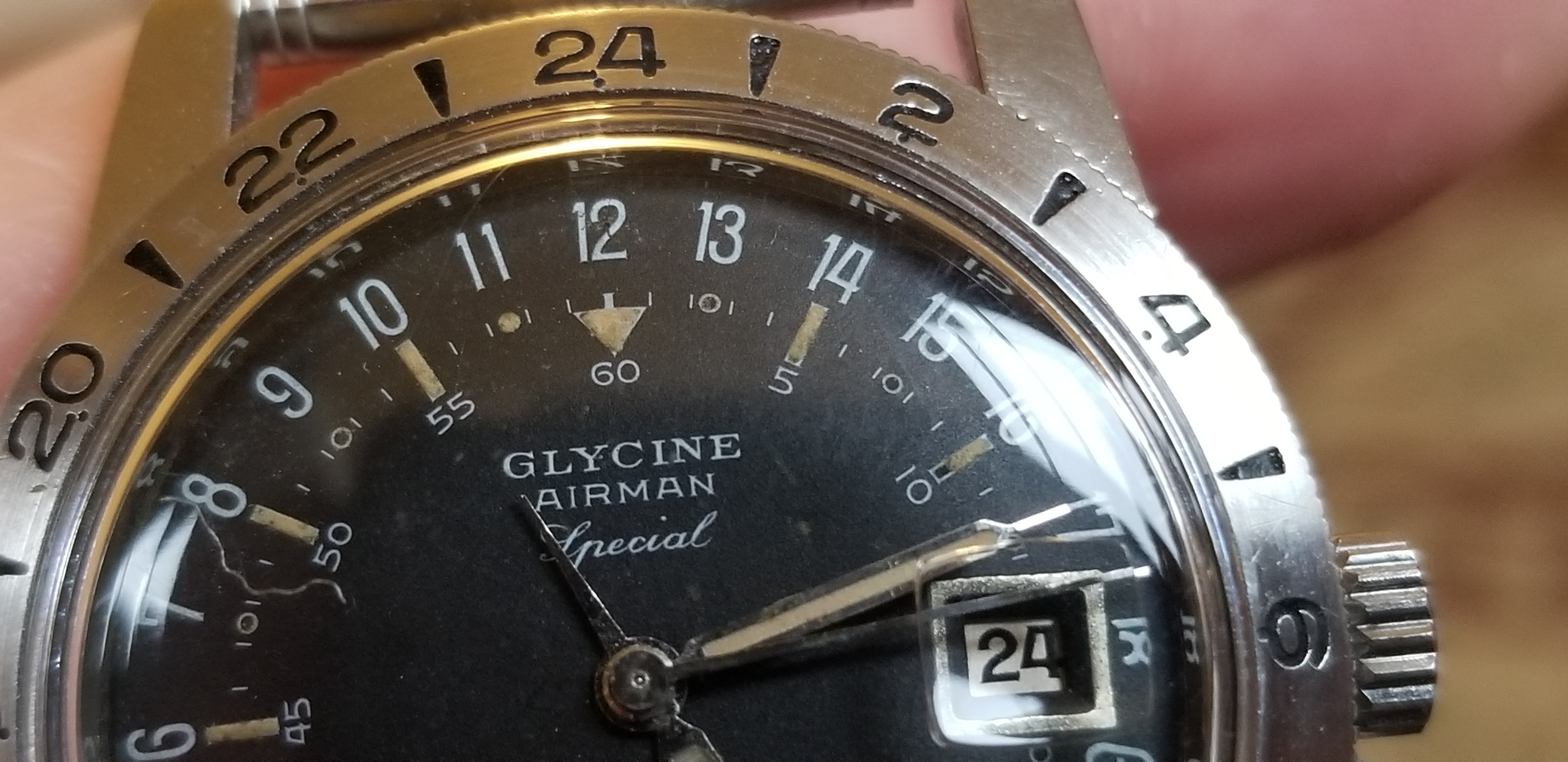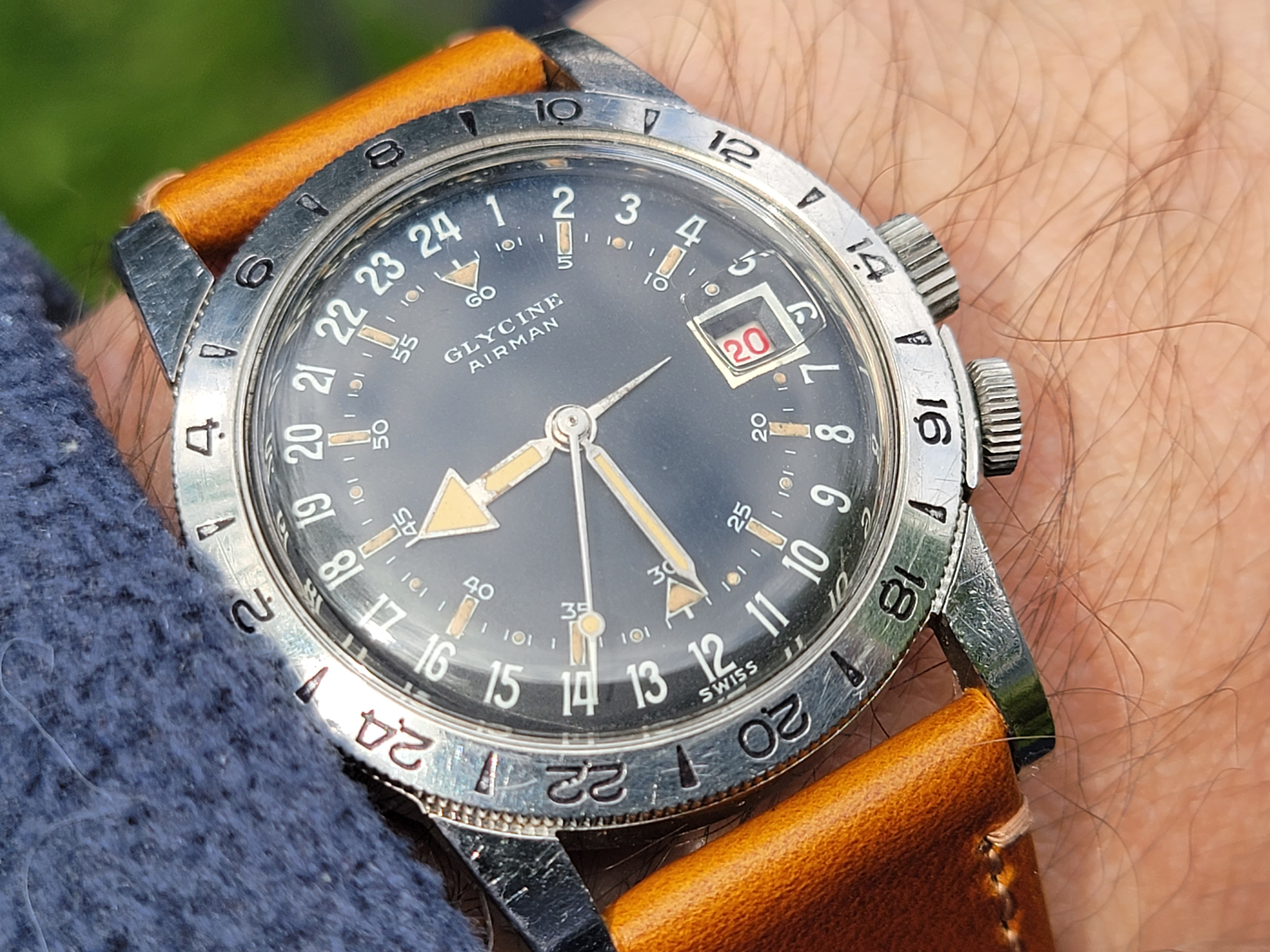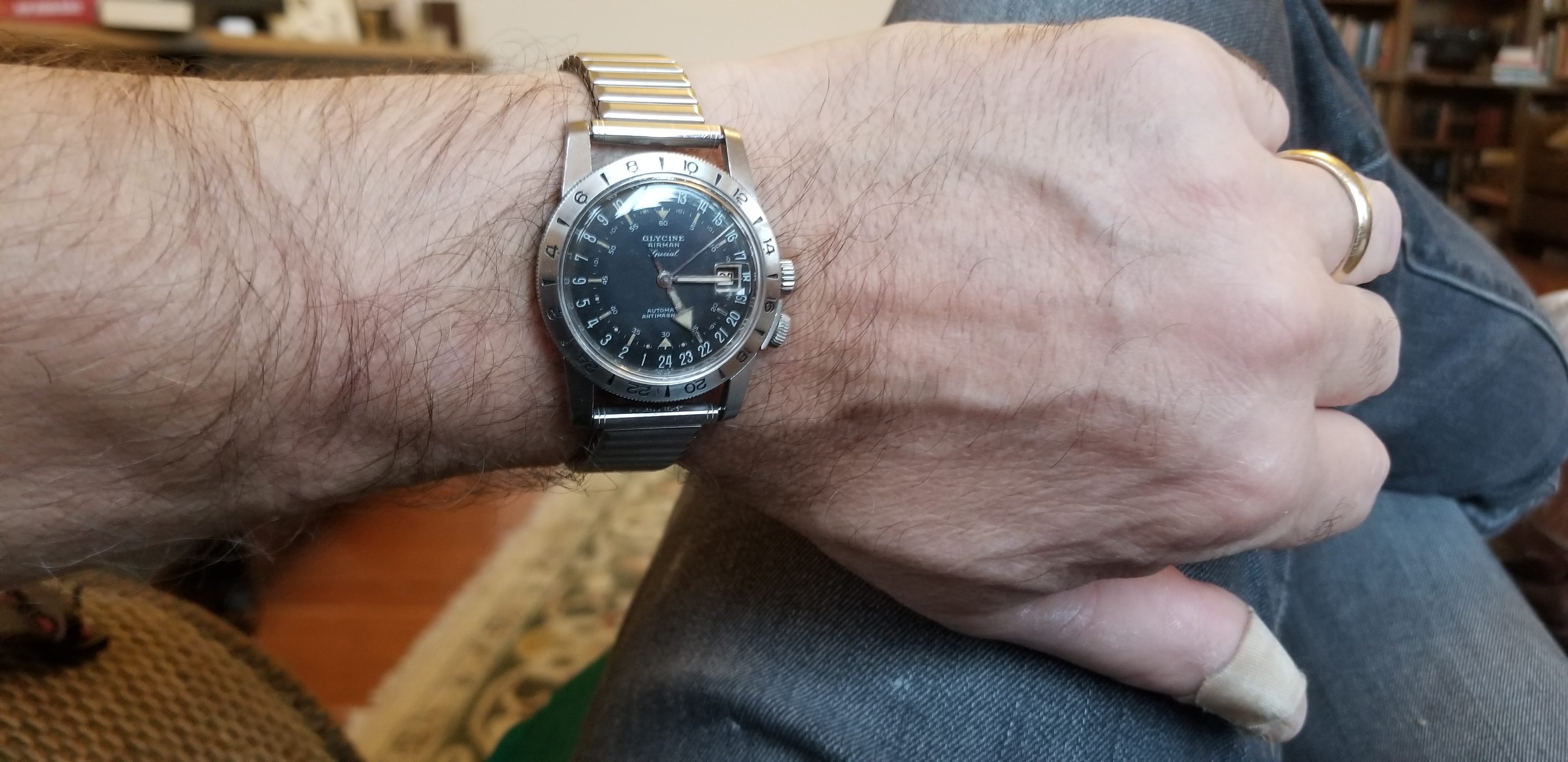 It's a fun and attractive watch. The sweeping small lollipop is mesmerizing. I also like the pre-Glycine crown dials. This particular watch is a bit unusual as it does not include the automatic writing on the dial and has a nice splash of red in the date, along with the metal surrounding the window. It's in great condition, having been serviced by @James Sadilek.