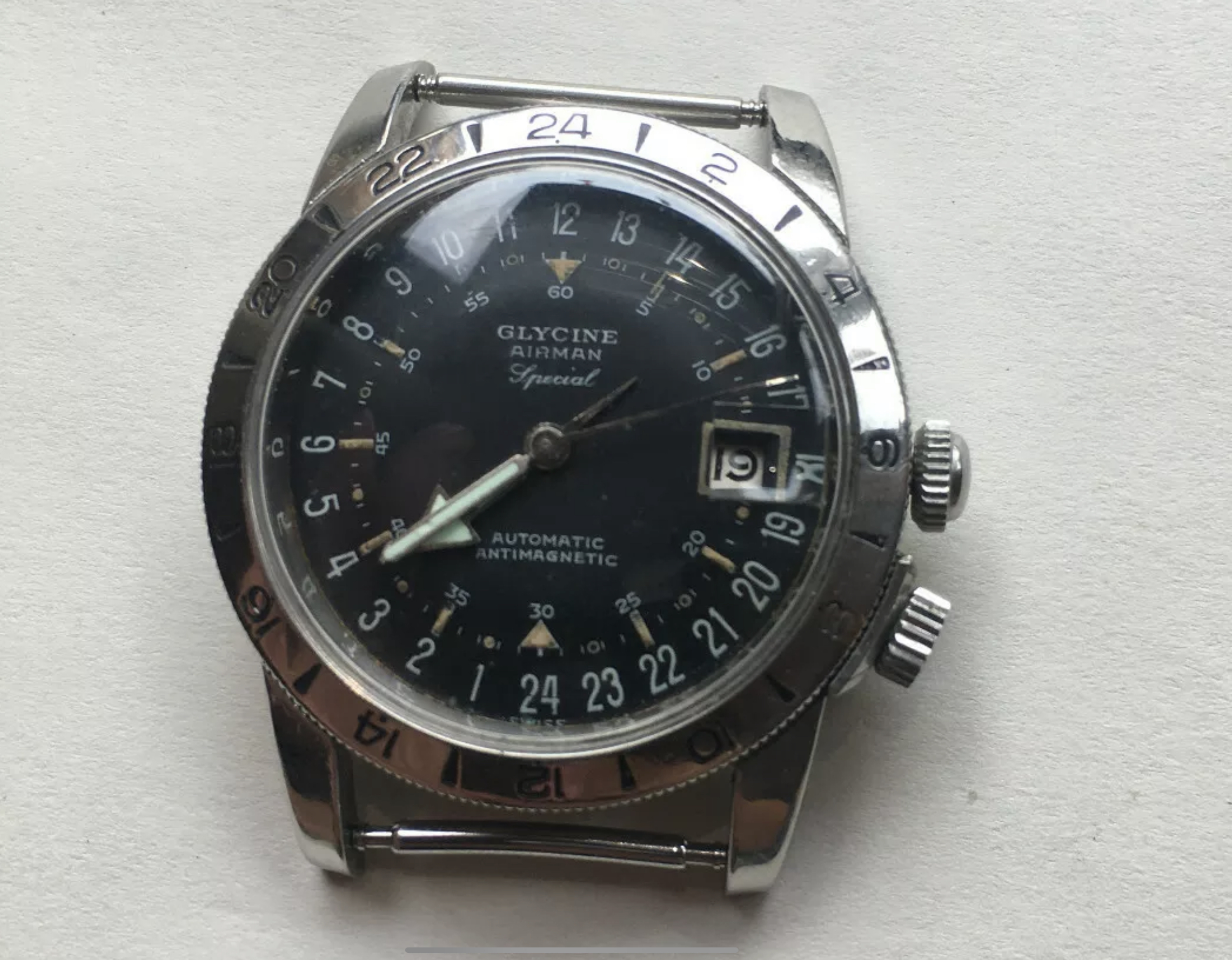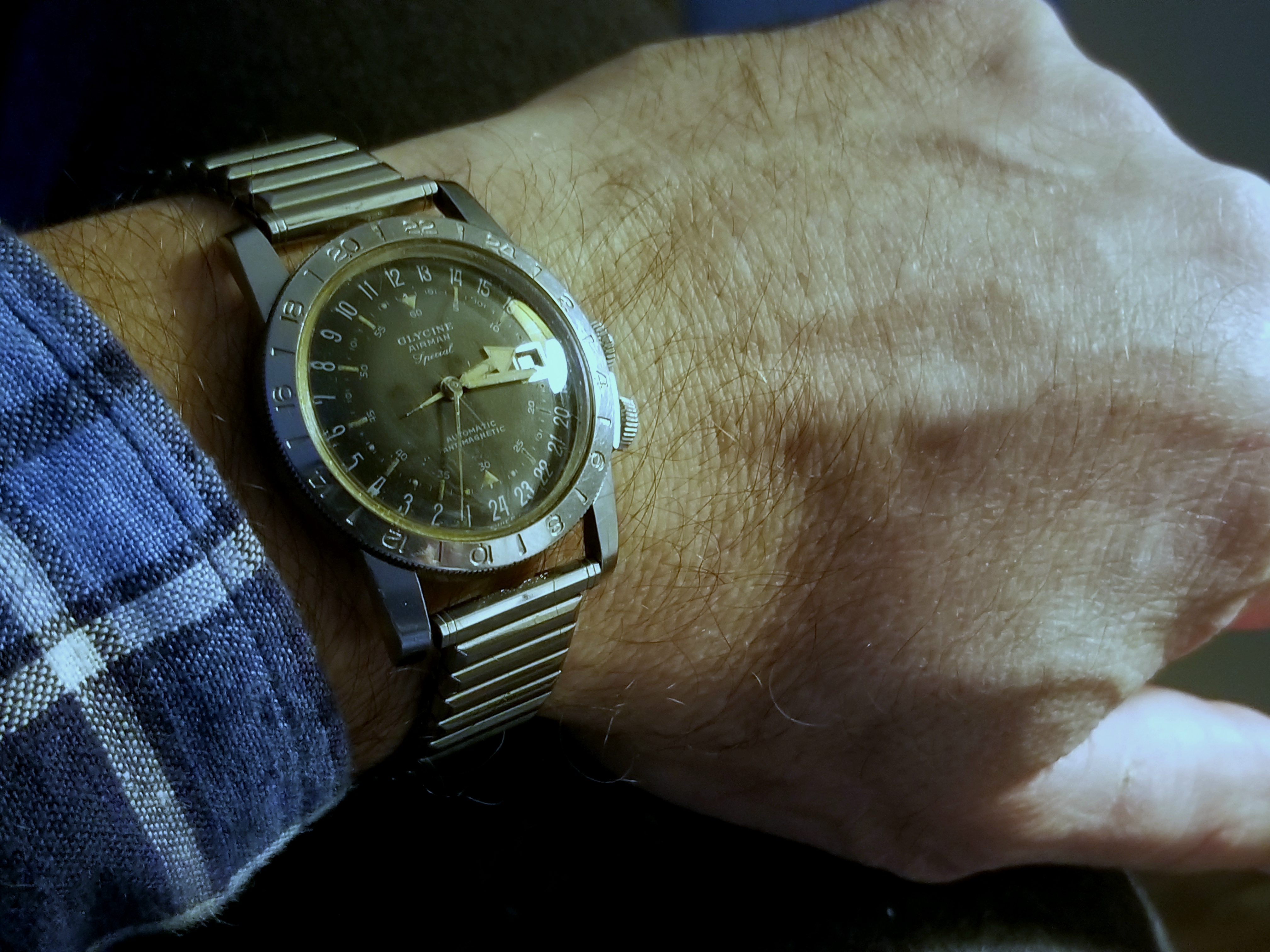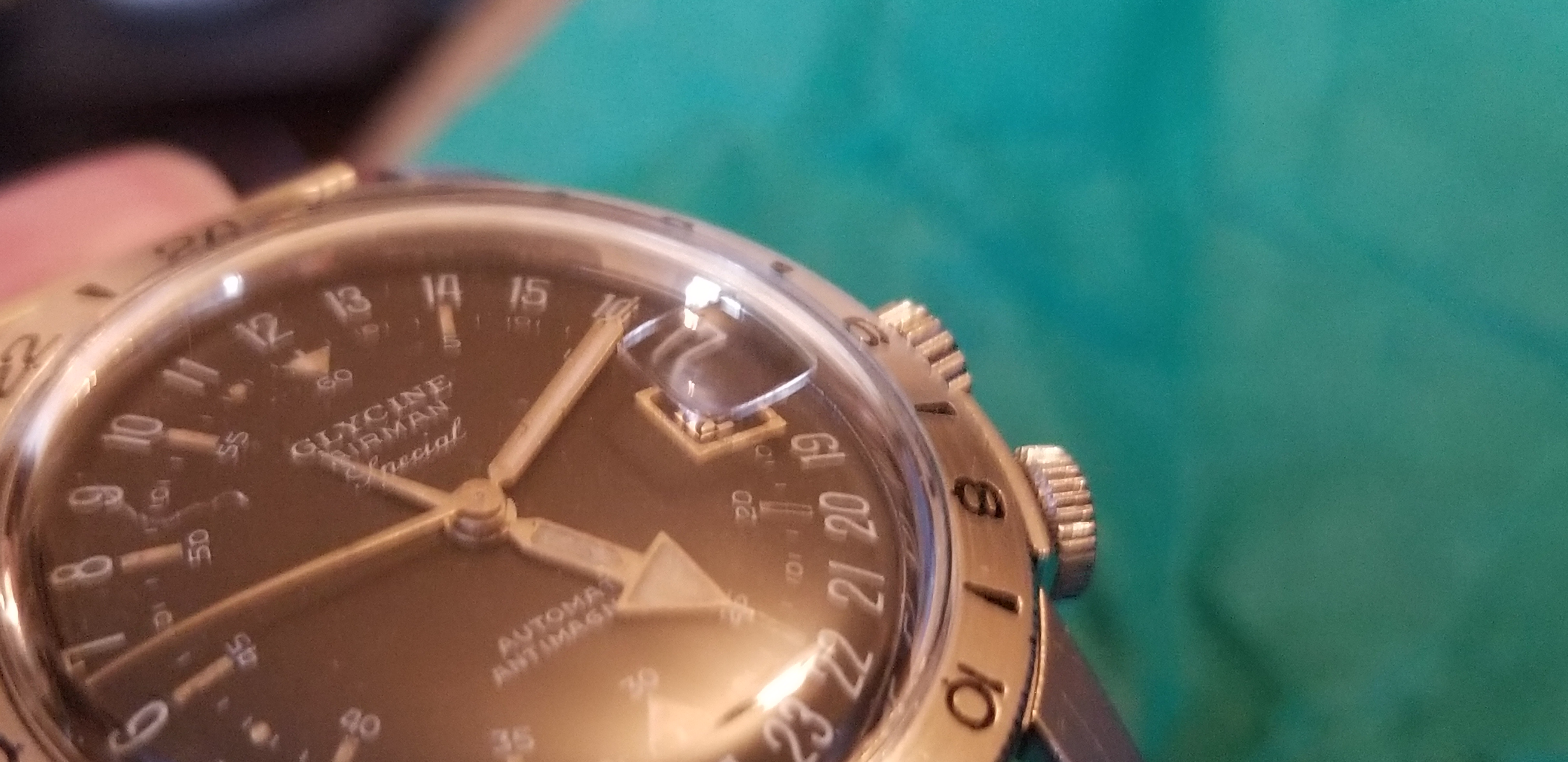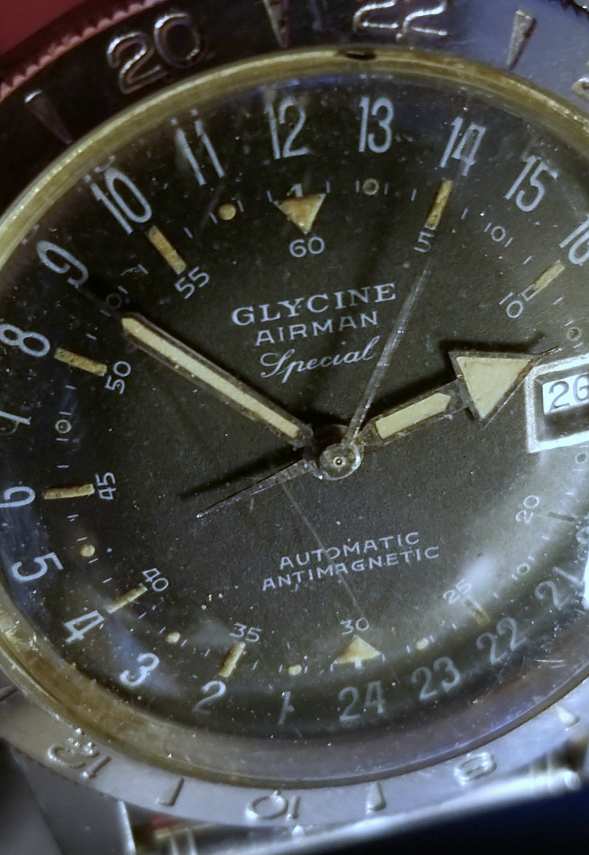 It's a fun and attractive watch. The sweeping small lollipop is mesmerizing. I also like the pre-Glycine crown dials. This particular watch is a bit unusual as it does not include the automatic writing on the dial and has a nice splash of red in the date, along with the metal surrounding the window. It's in great condition, having been serviced by @James Sadilek.