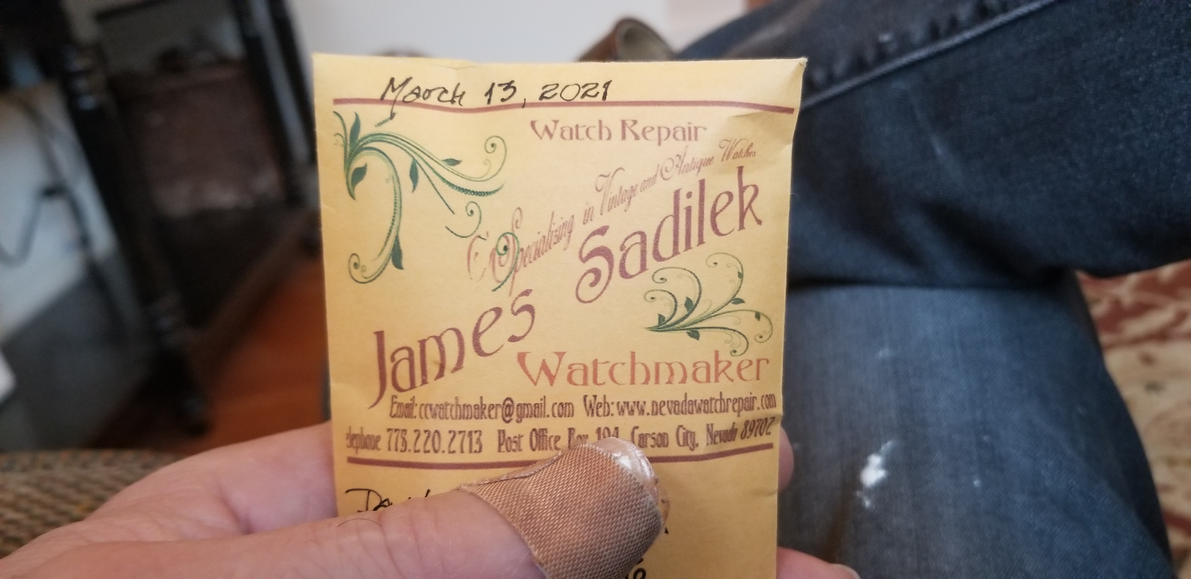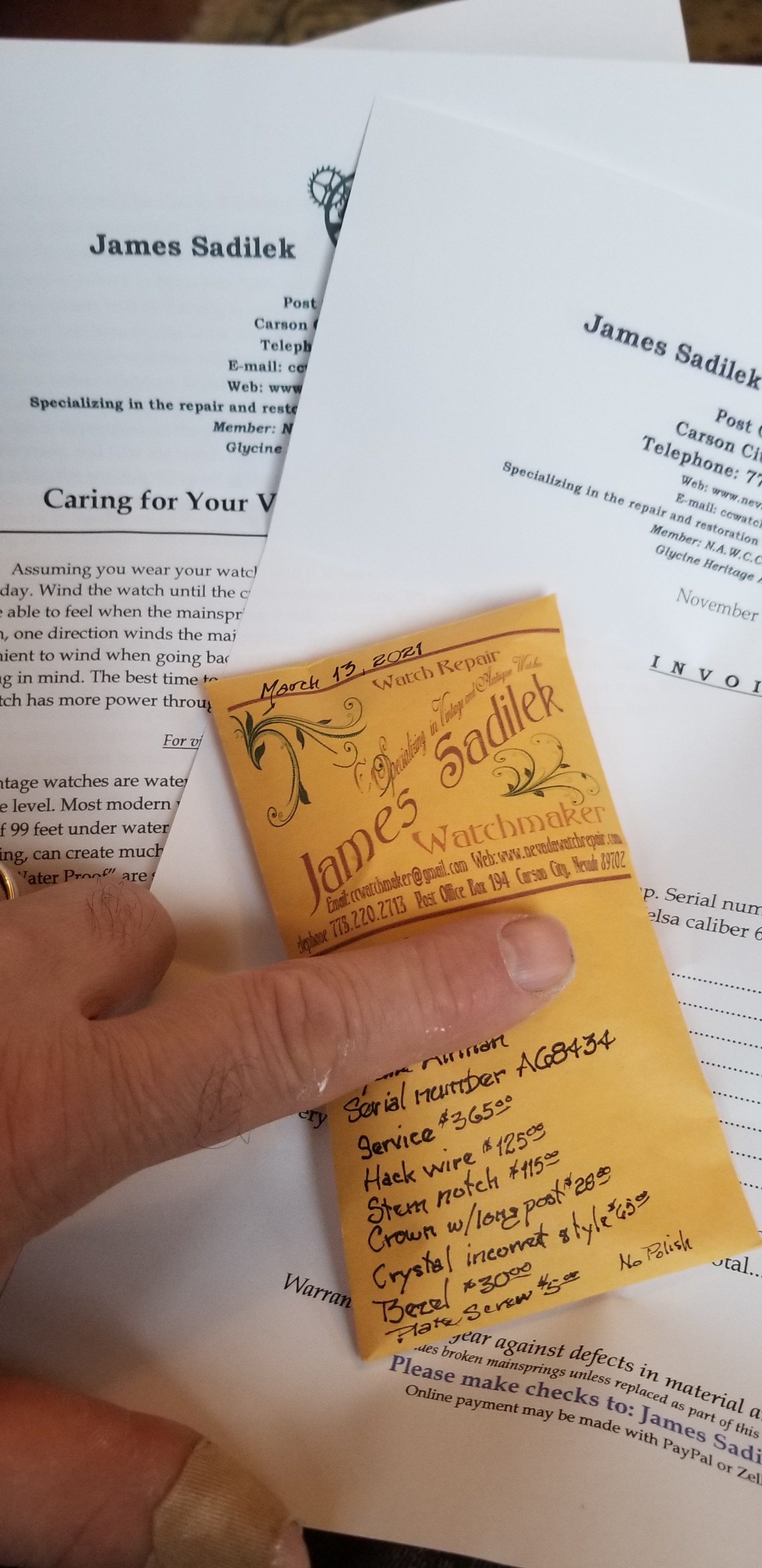 So here's what happened. I sent the watch back to Jim to reset the date change. He sent it back USPS signature required. The mail carrier tried to deliver yesterday but no one was home so left a note. While he was out on the rest of his route, someone (ie meth head) broke the glass on the truck and stole all the packages. I found this out after I went to pick it up this morning. A bit of a queasy feeling. (Ironic that if it wasn't signature required it would have been delivered and not in the truck.)