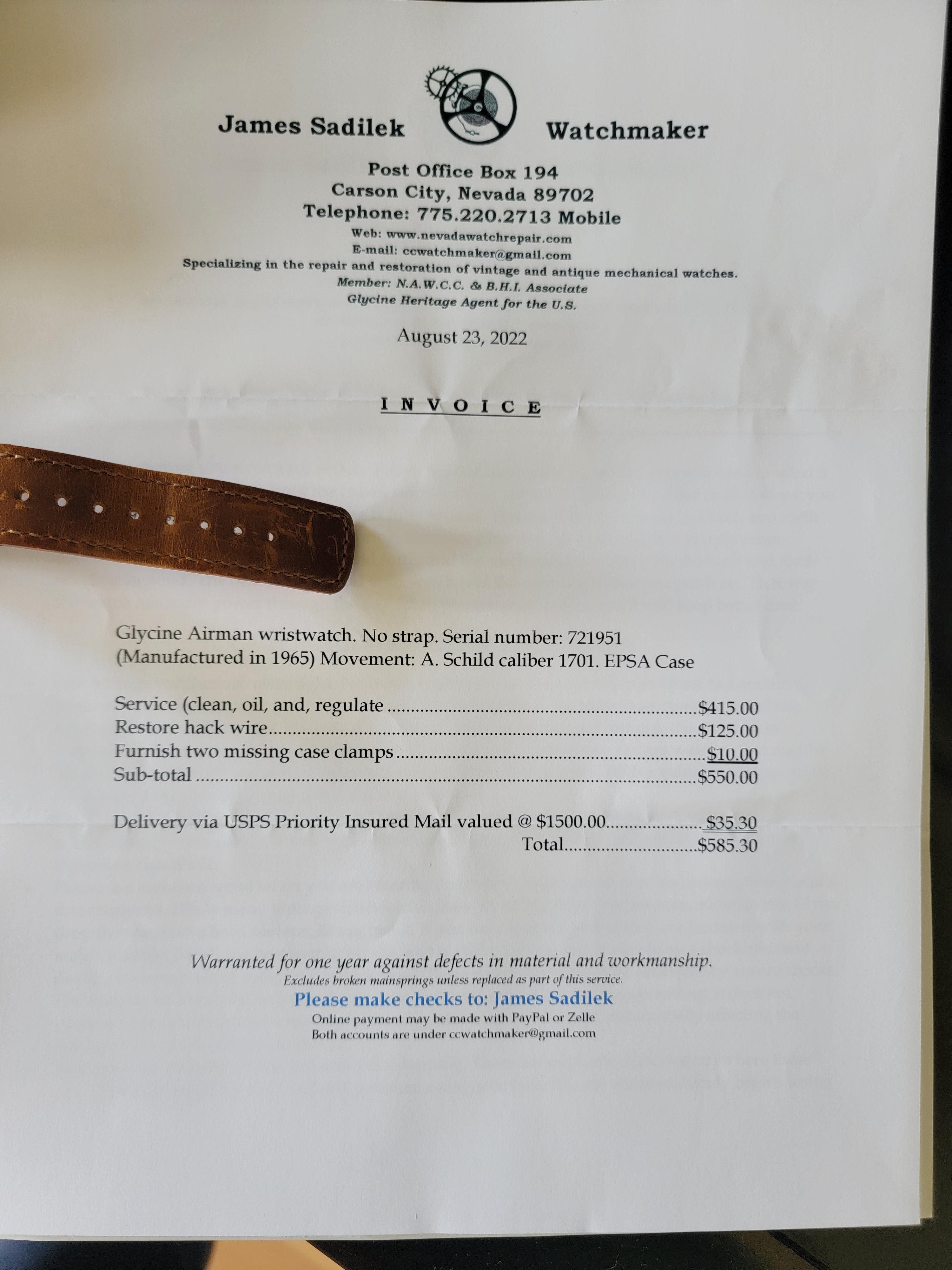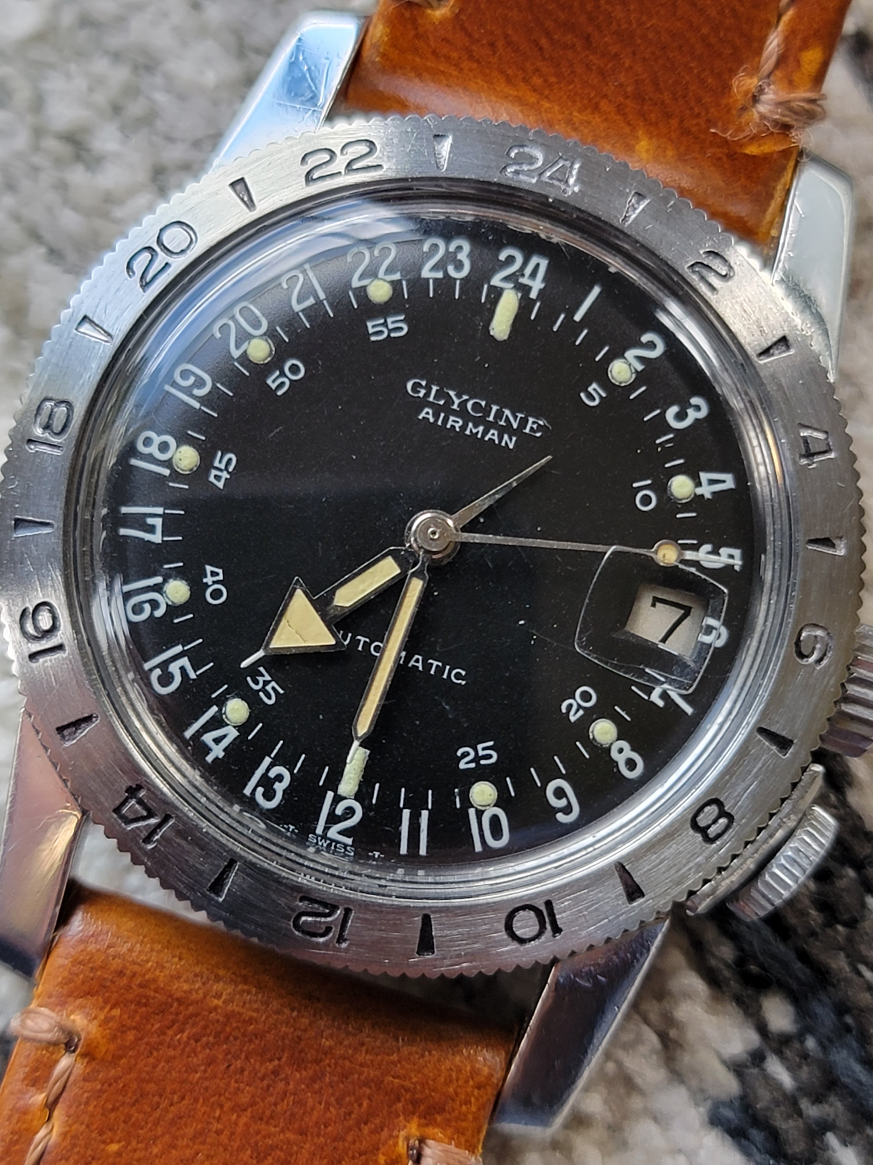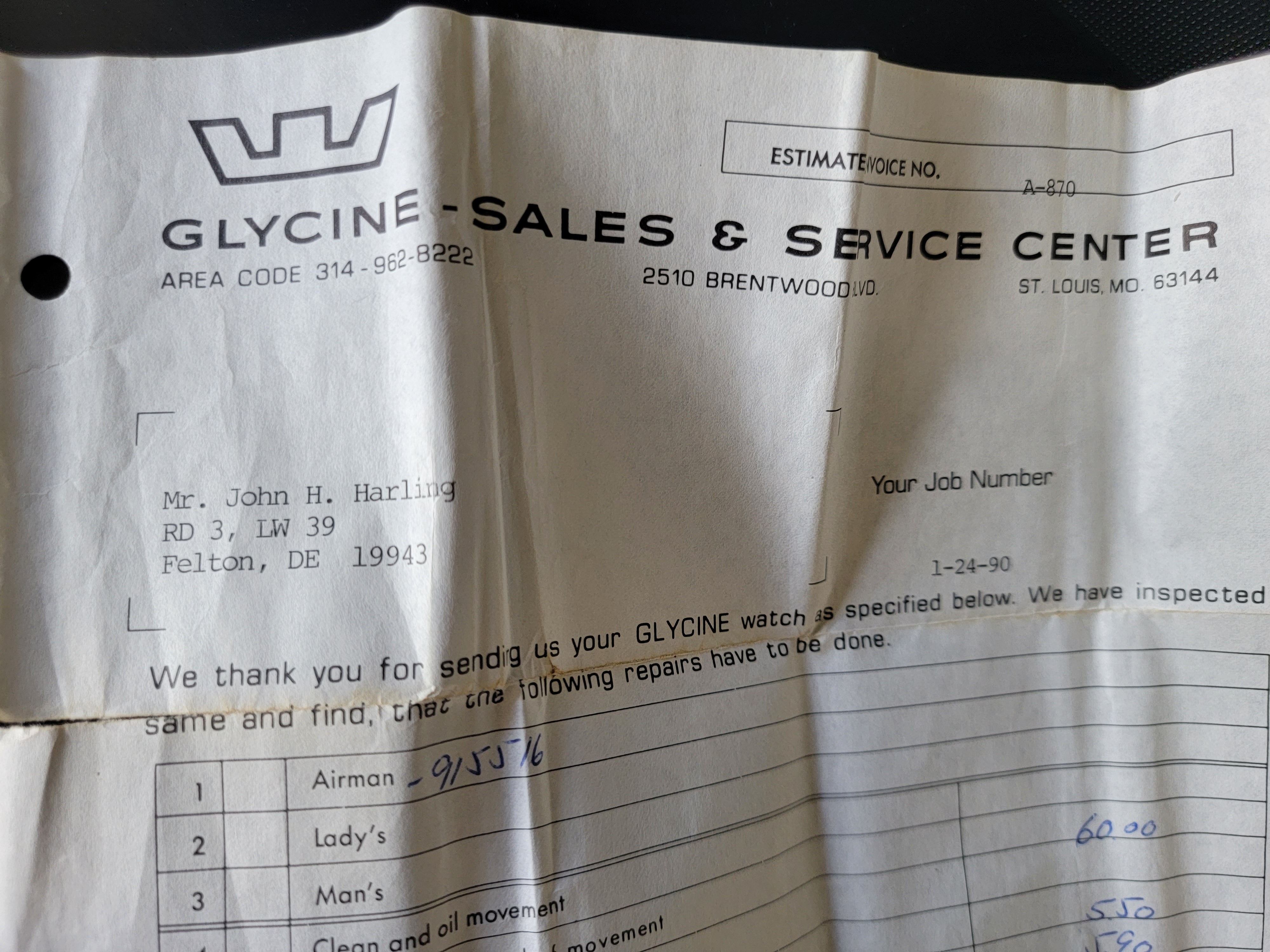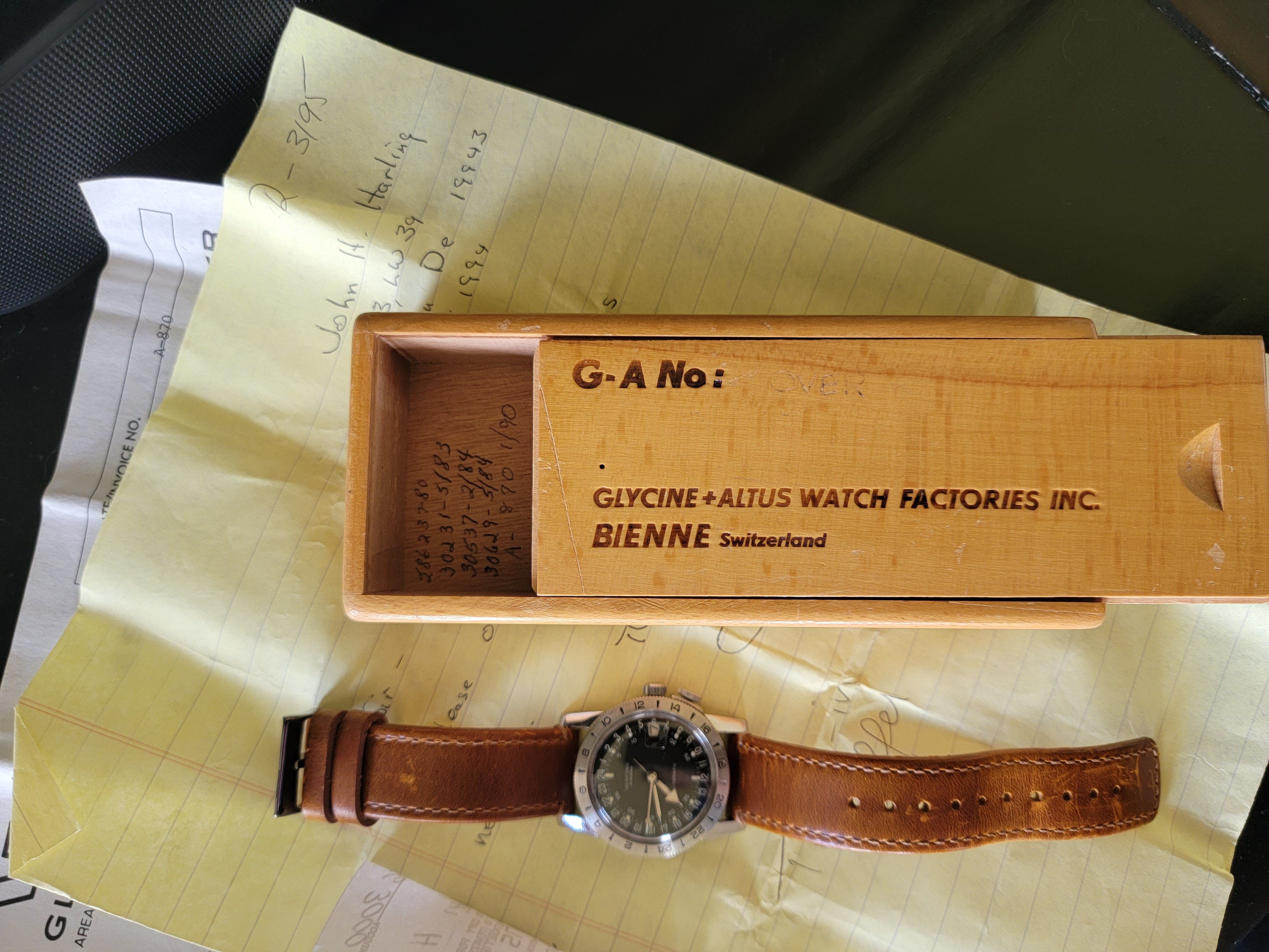 One last thing to note. The pilot who owned this watch may have traded his old one for this. What makes me think this is that the serial number of the watch is different from the one written on the box. He also has a letter he wrote to Glycine asking for service with "trade in offer" noted on it. The watch here has a circa 1965 serial number so is the correct era. It's not clear if this was his original watch or one he traded for later. But he clearly wore and was attached to Glycine Airman based on the service history. I can't imagine finding a better vintage Glycine Airman.