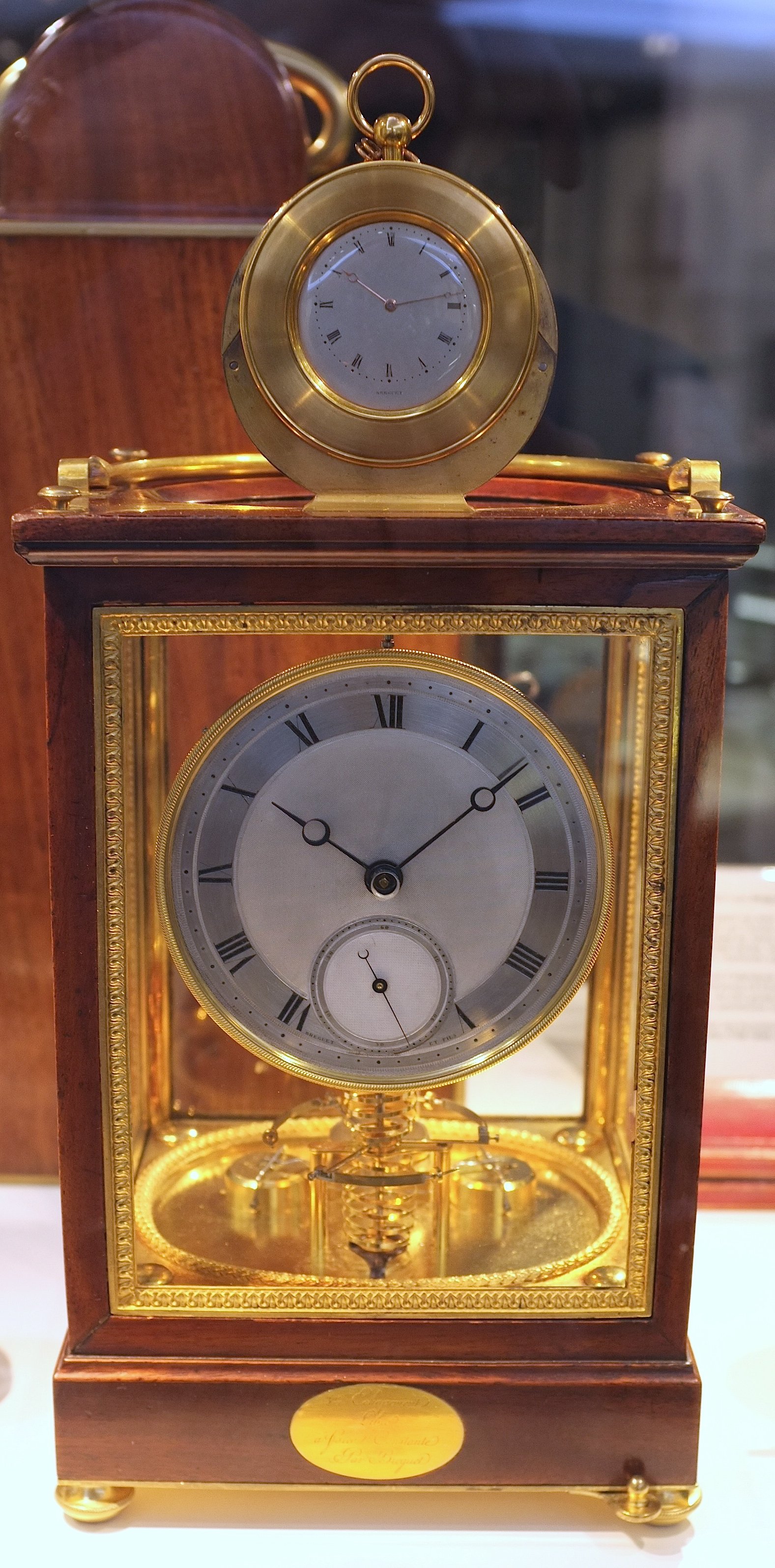 Pendule Sympathique that was made for the brother of Napoleon. It consists of a highly precise table clock and a removable portable watch that shown on top of the table clock. Twice a day the table clock synchronizes the pocket watch via a rod. Very clever!