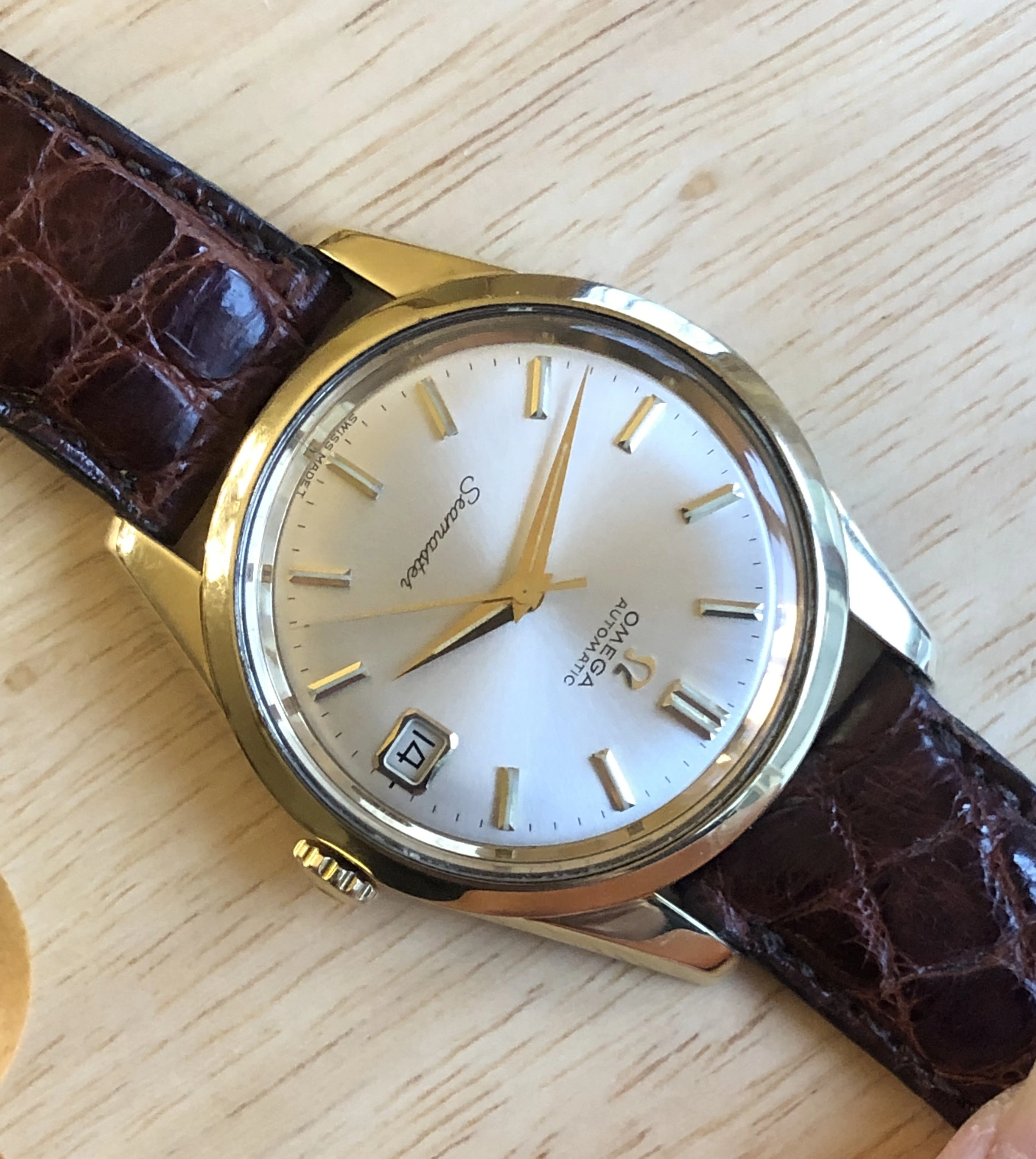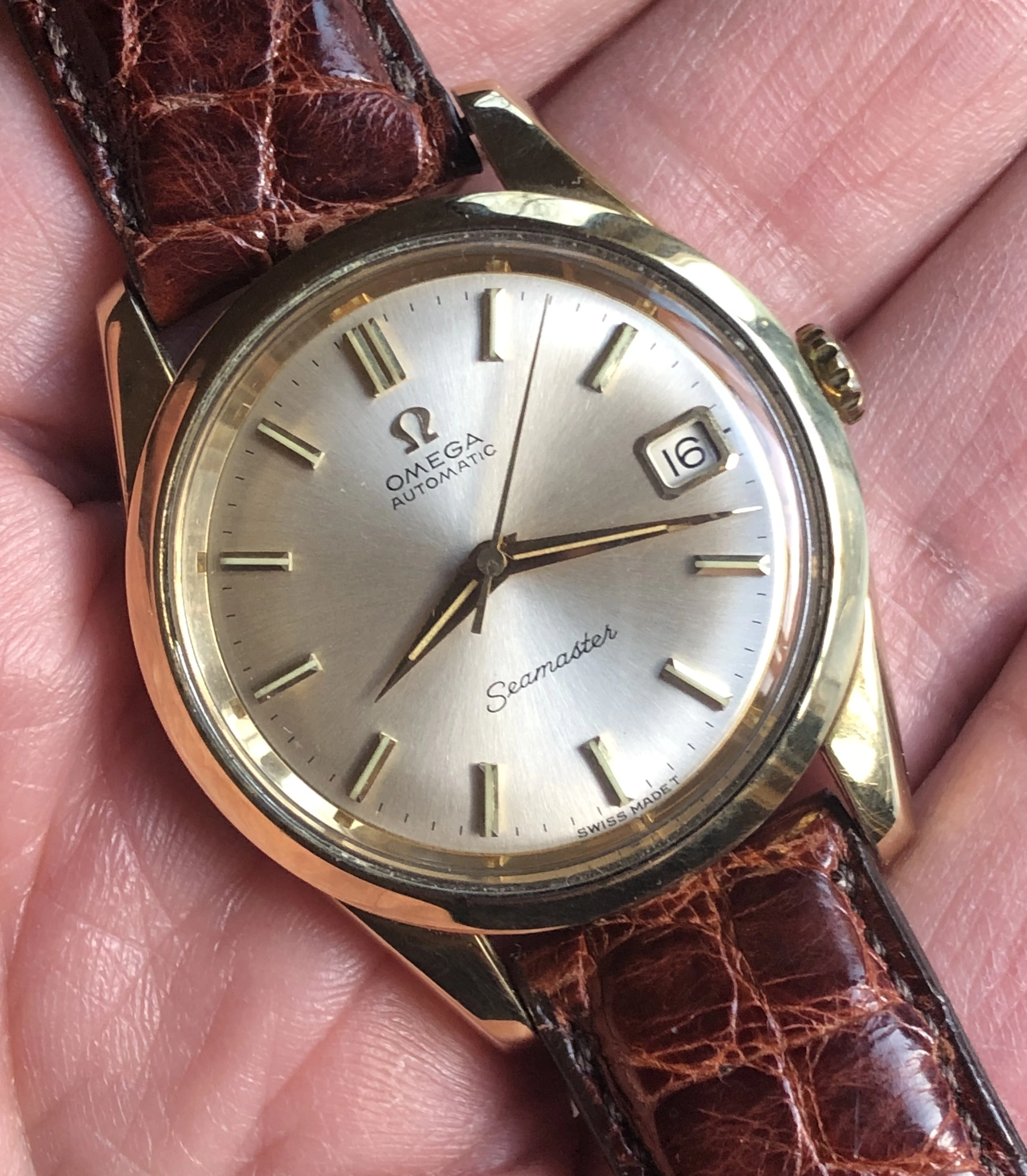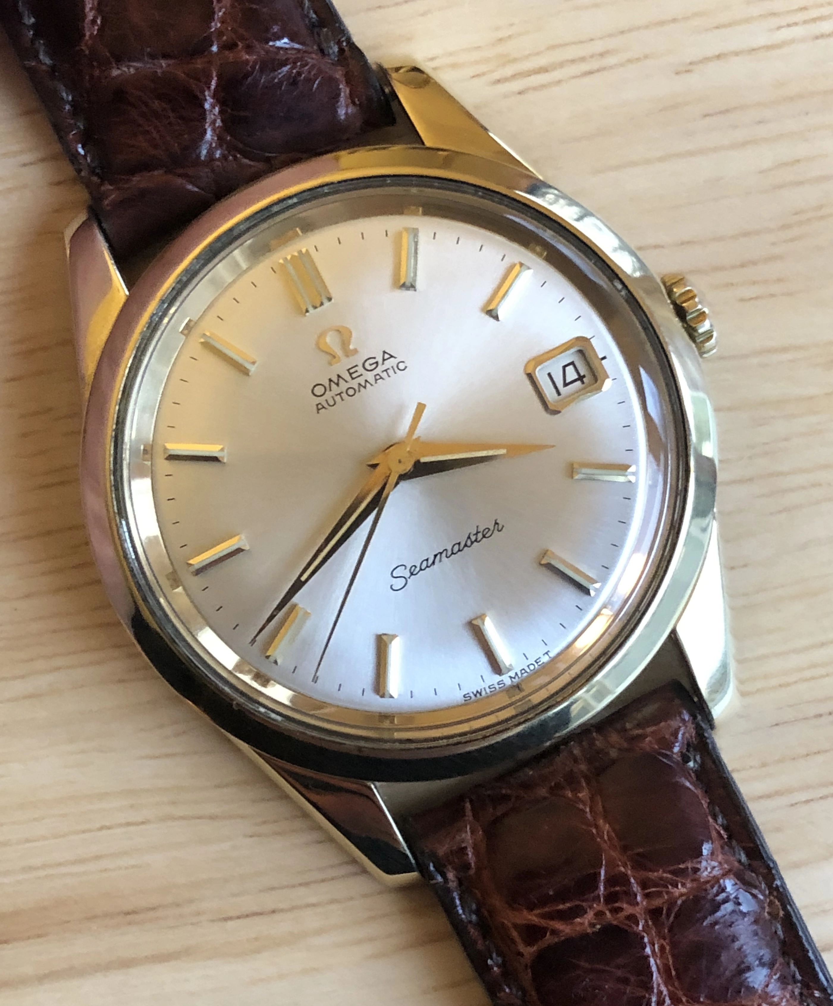 ·Here is a beautiful Omega Seamaster (ref 166.010) from the mid-1960s with a clean silver sunburst dial and a 35mm gold-capped over stainless case. The watch has not been serviced in my possession, but is winding, setting, and running properly. Comes with a lightly worn crocodile strap