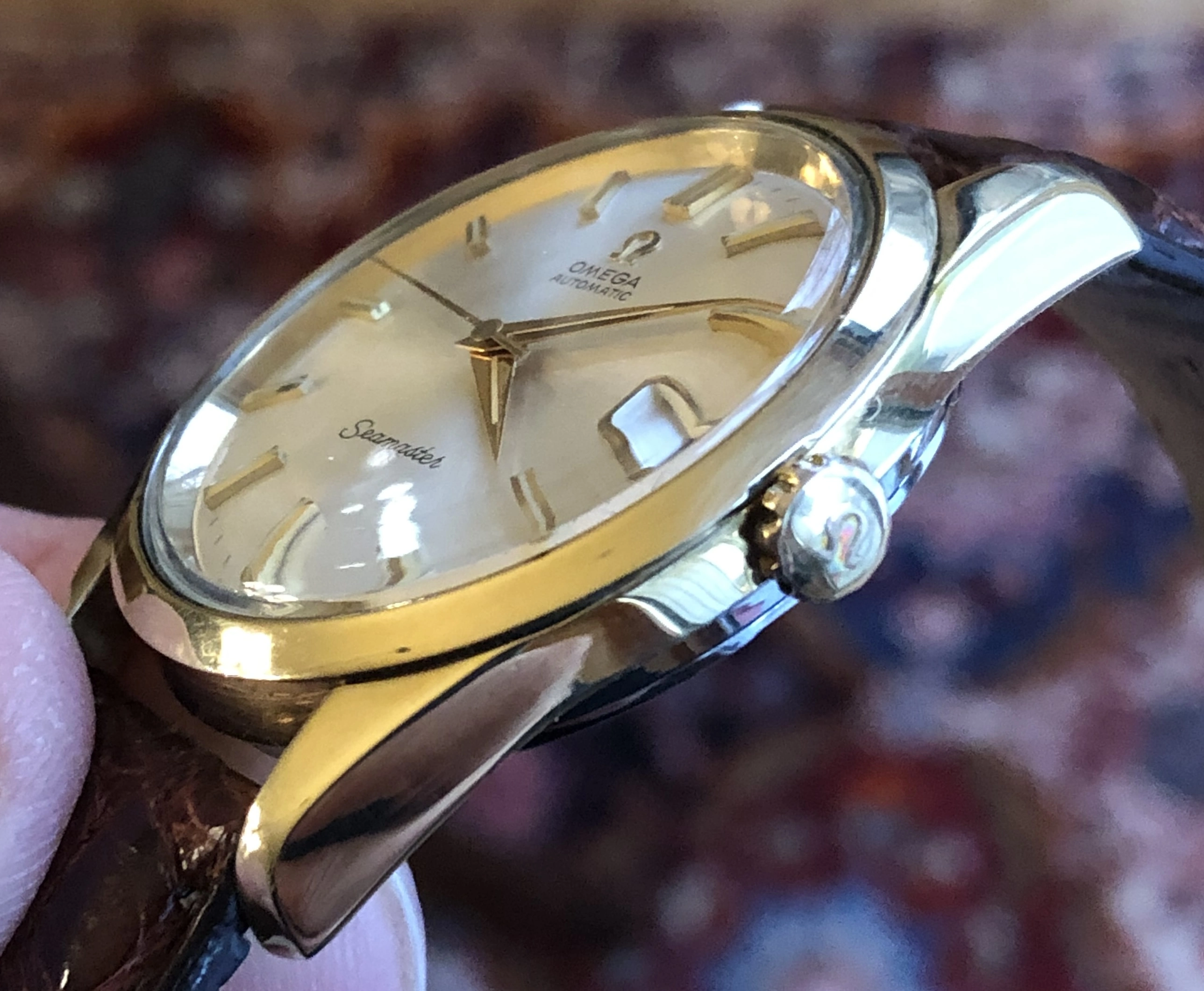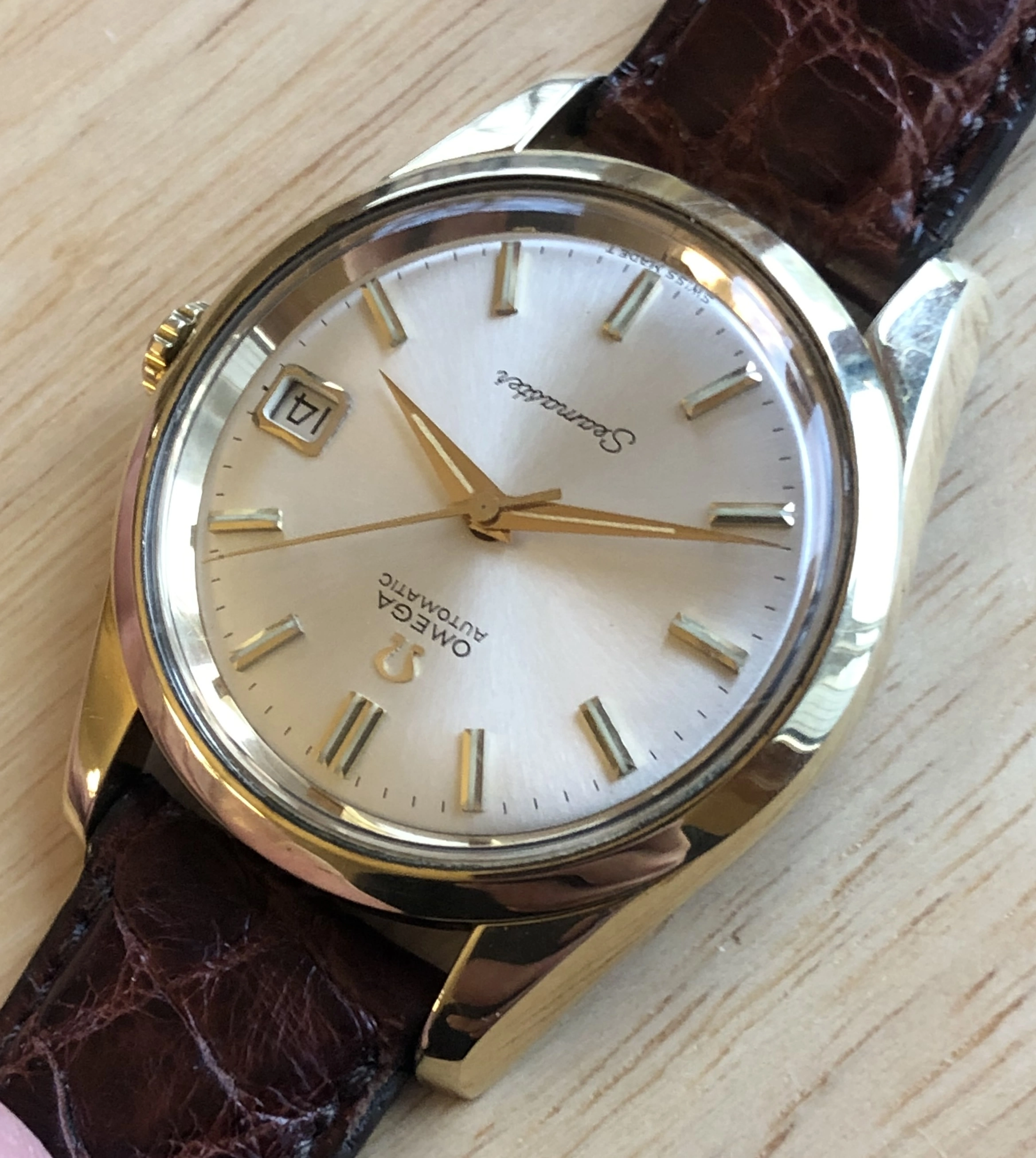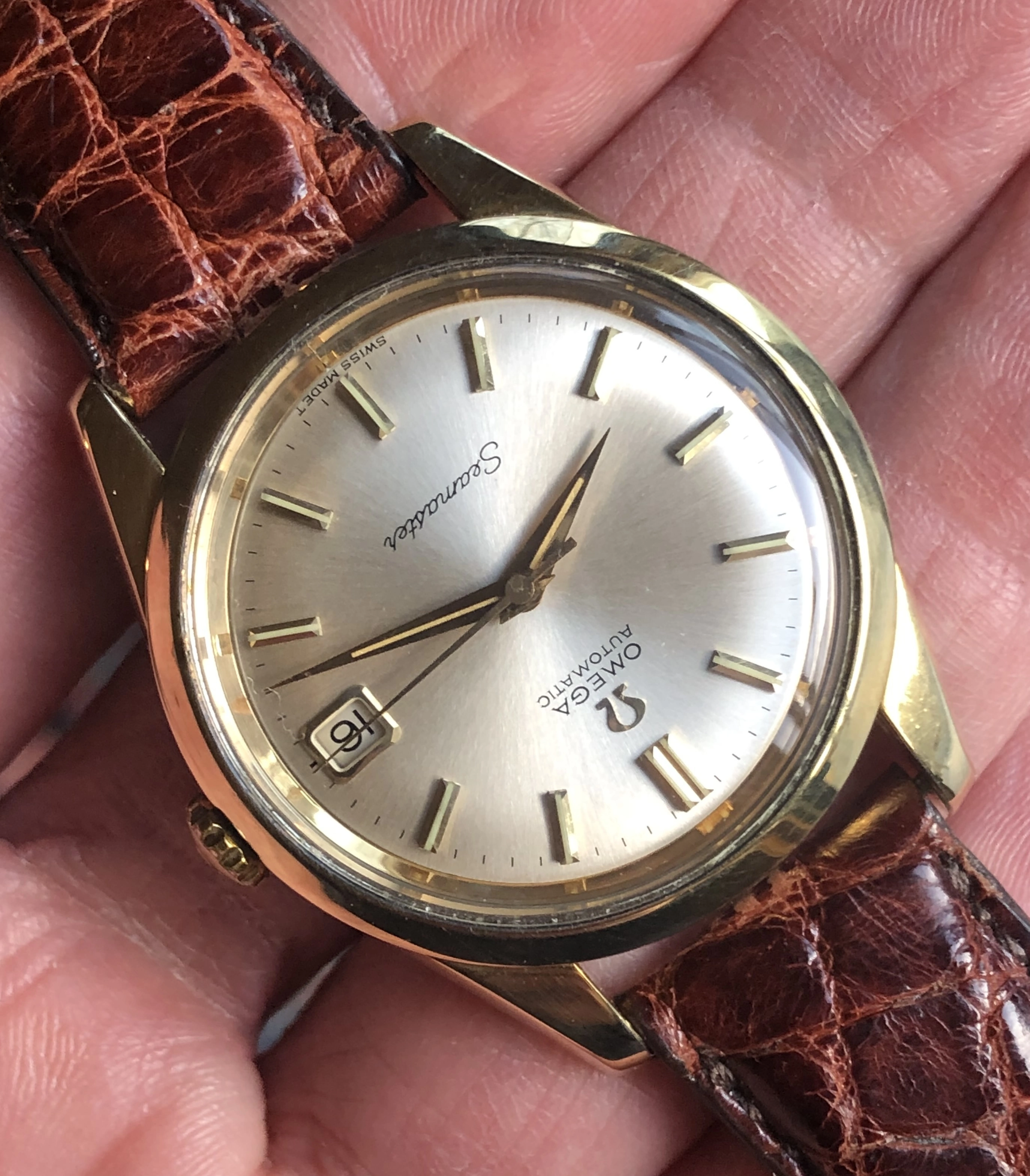 ·Here is a beautiful Omega Seamaster (ref 166.010) from the mid-1960s with a clean silver sunburst dial and a 35mm gold-capped over stainless case. The watch has not been serviced in my possession, but is winding, setting, and running properly. Comes with a lightly worn crocodile strap