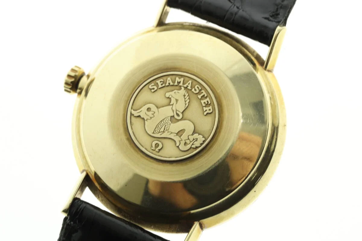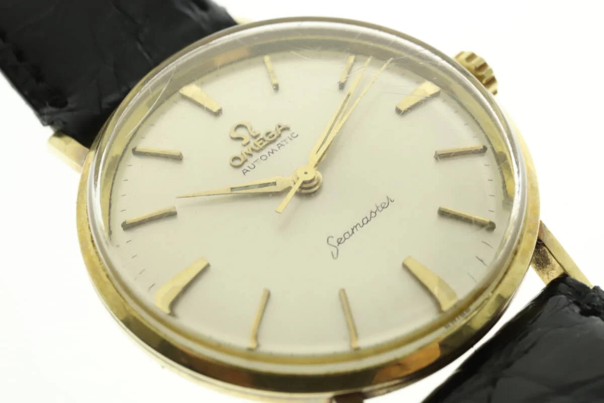 Most likely gold-filled, this is sort of an early Seamaster De Ville or pre-De Ville with the coat hanger S dial, nice watches, decent water resistance, some are gold-filled, some 14K solid gold, and you’ll typically find the words “14K Gold” or “14K Gold Filled” between the lugs on one end.
