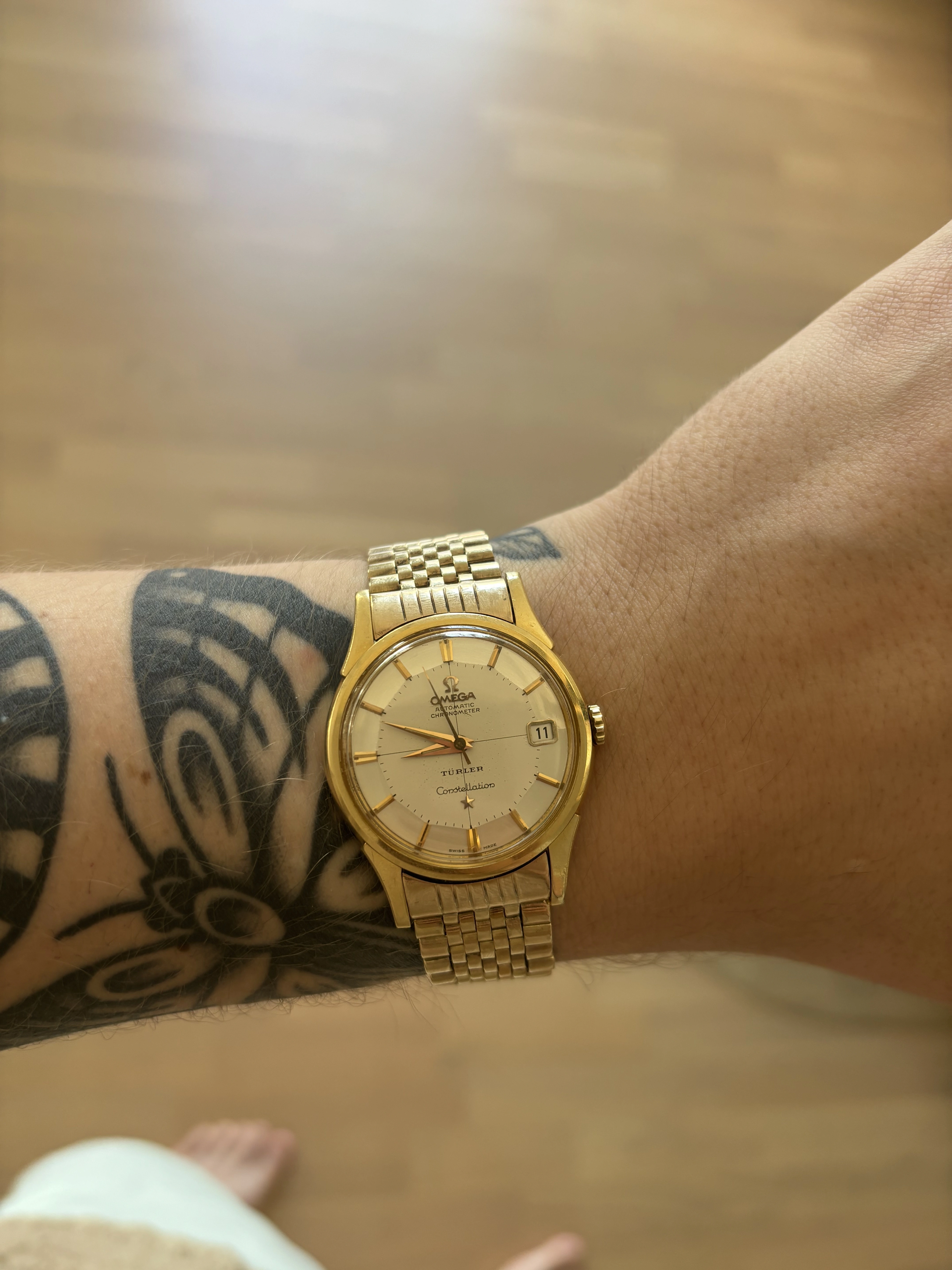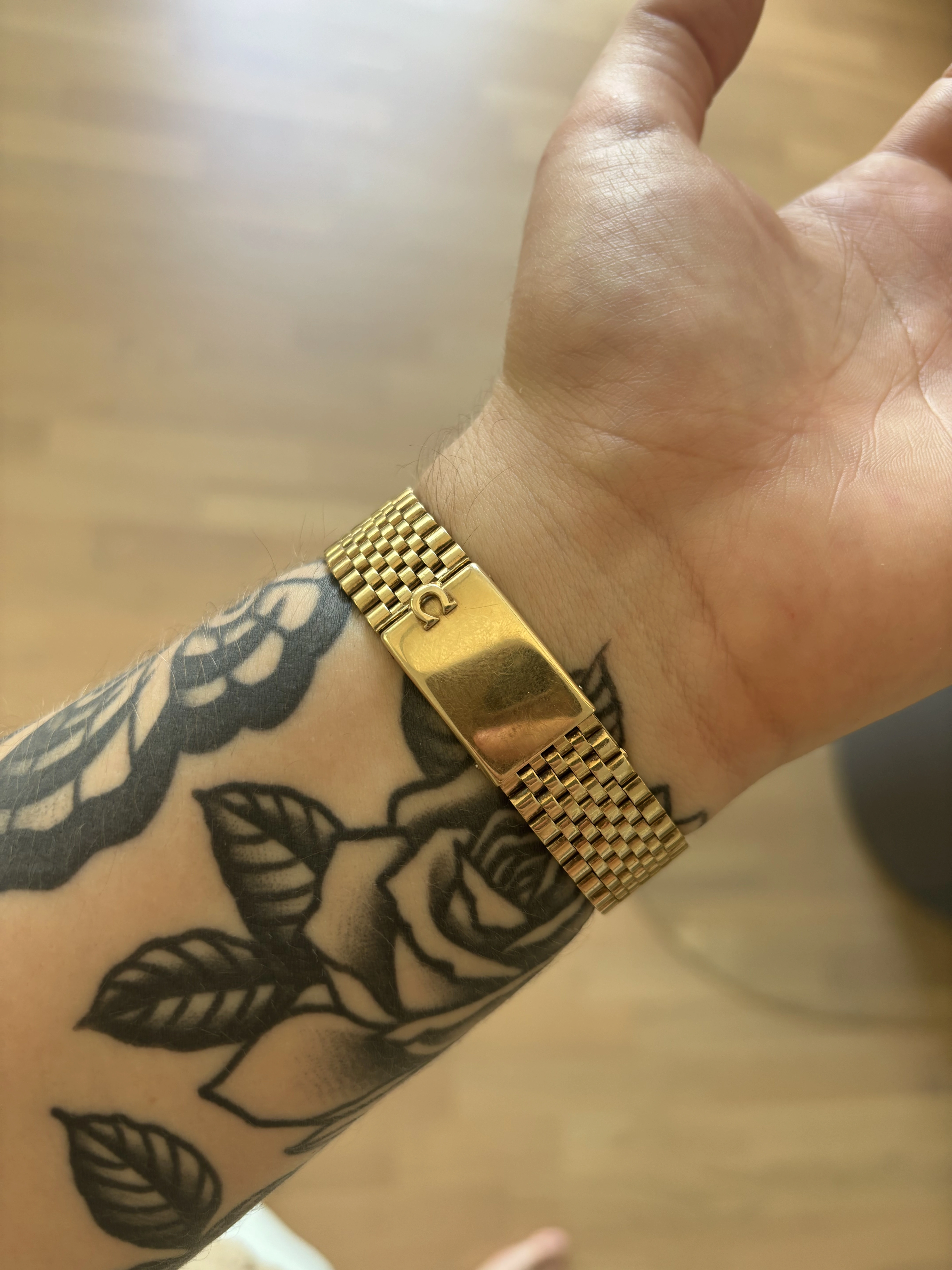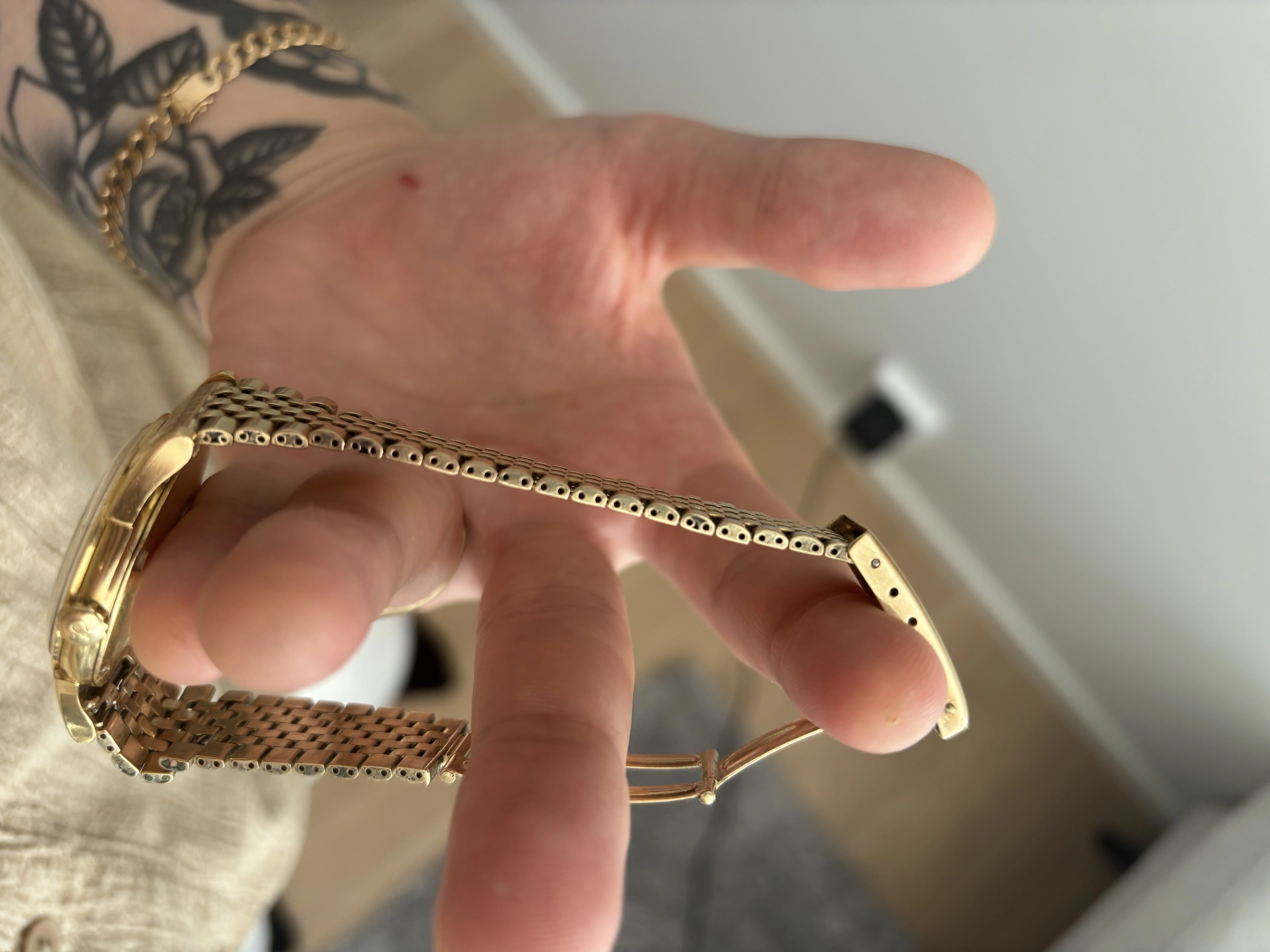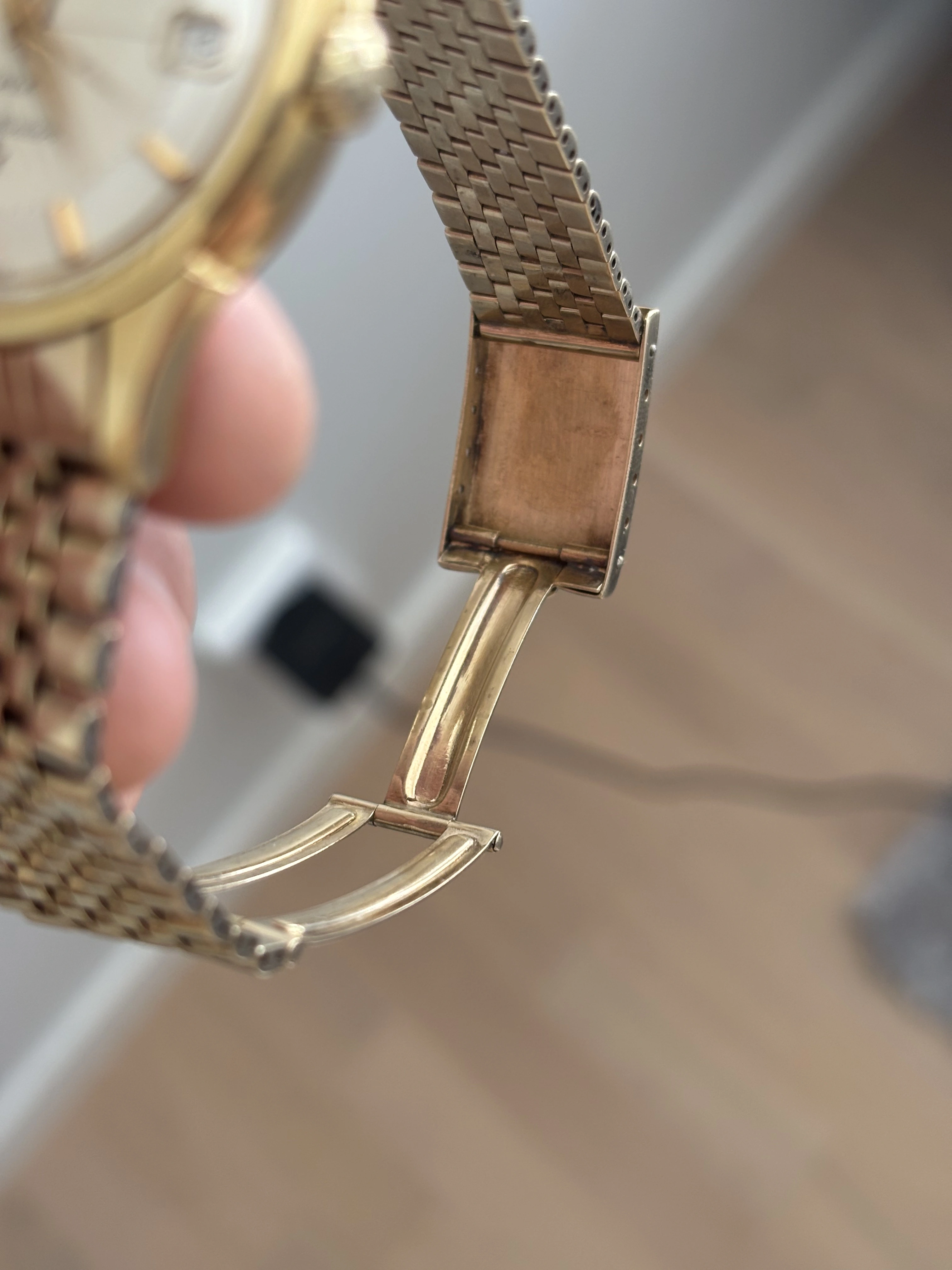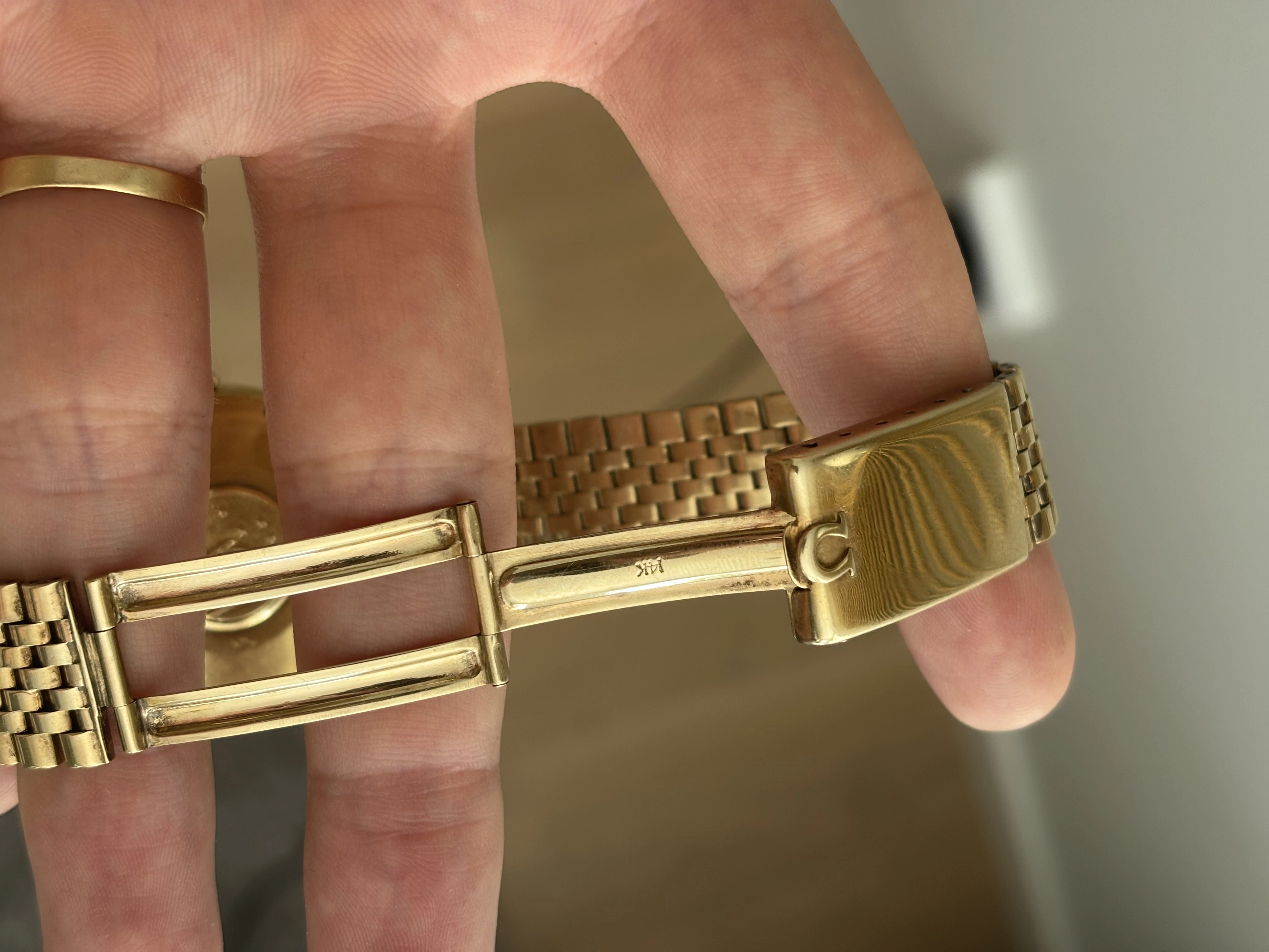 Nice piece, can you post some more photos of the bracelet and clasp? That's one I haven't seen before, somewhere between beads of rice and Milanese mesh, I'm guessing its a US production bracelet variant