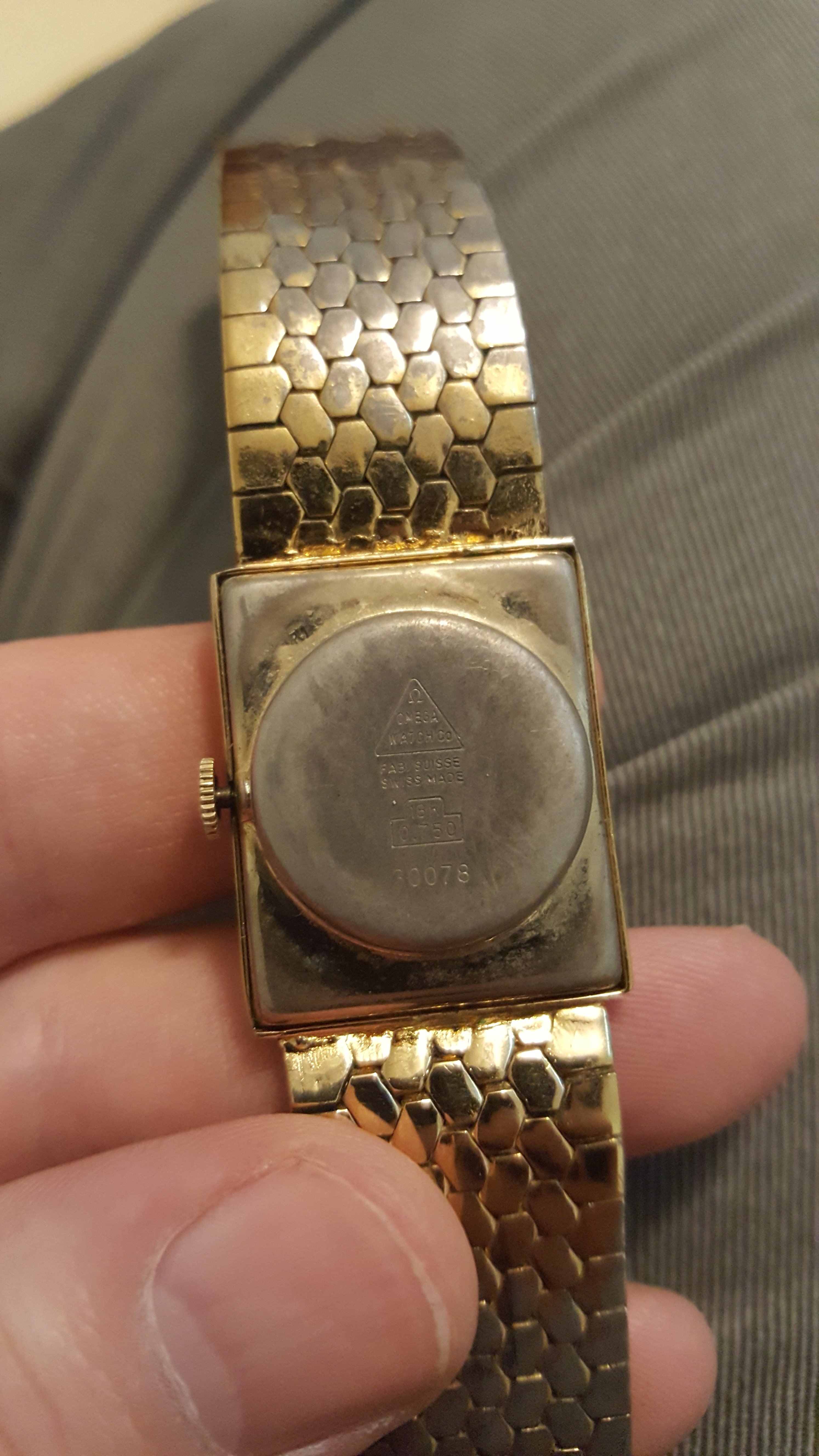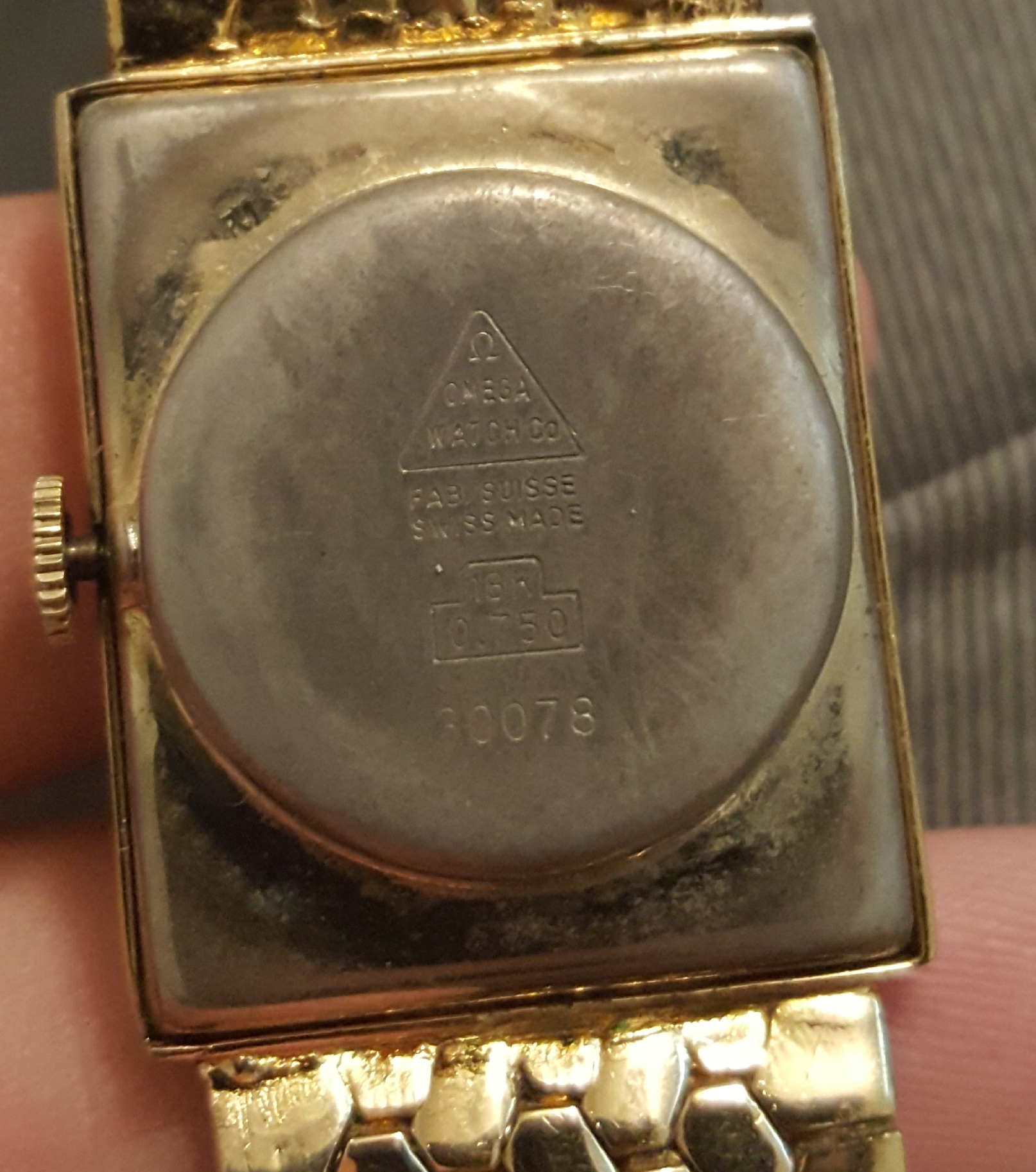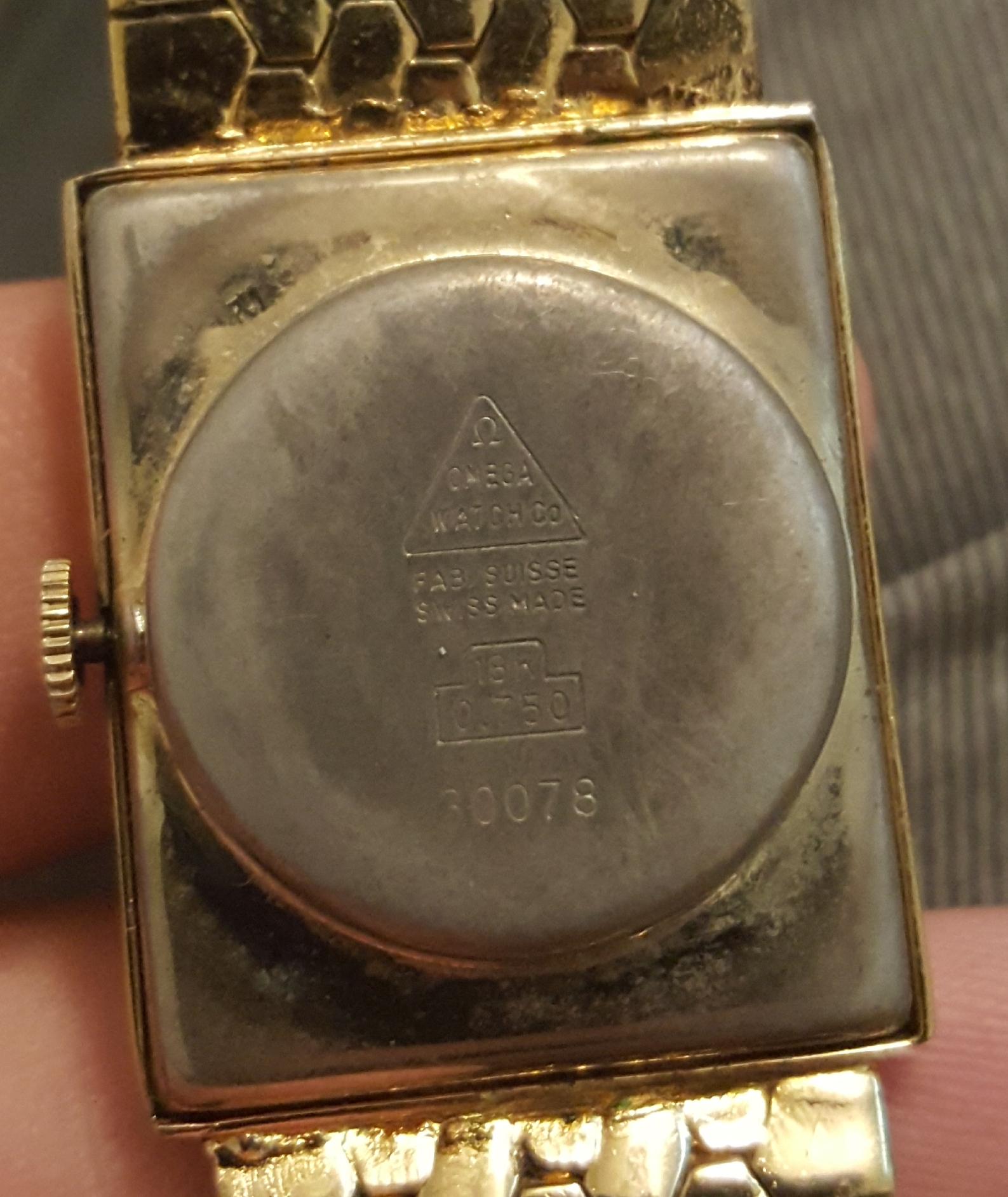 -Case back has a triangle with rounded edges Omega symbol at the top and says, "Omega Watch Co" inside the triangle and "Fab Suisse Swiss Made." Below that it says "18K 0.750" which I am assuming is the thickness of the gold platting. Let me know if I am wrong. Below that it says "30078" Is that a model number, serial number, or something else. Nothing good comes up in a quick Google search