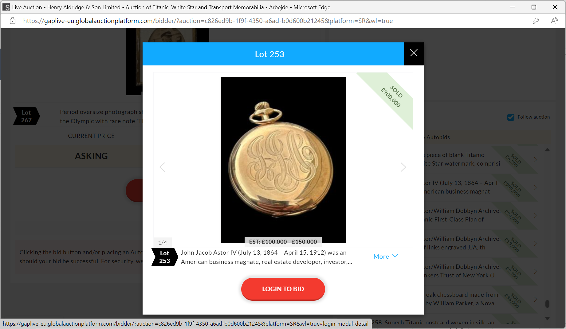 “The auction for John Jacob Astor IV's 14-carat gold Waltham pocket watch begins Saturday, with a starting bid of 60,000 pounds, according to auction house Henry Aldridge & Son. The watch, engraved with the initials JJA, was found along with Astor's body when his remains were recovered several days after the Titanic sank. He was also found with a diamond ring, gold and diamond cufflinks, 225 pounds in English notes, and $2,440.”