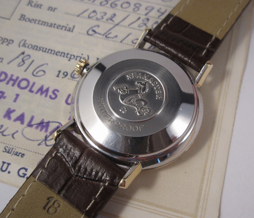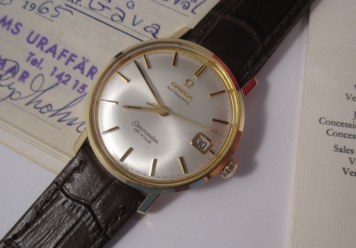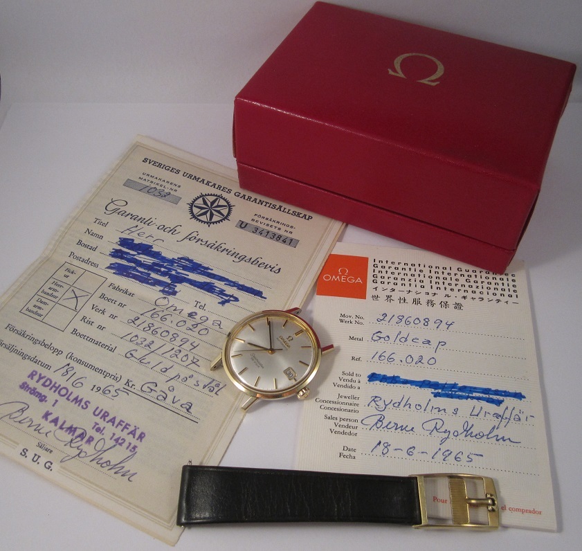 For sale here is this very nice Omega Seamaster DE VILLE from the mid 60ies, sold in Kalmar, Sweden in June 1965. Complete with its original paperwork, box, and buckle, where the watch itself is in excellent condition, not far from NOS (= cannot have been worn much at all), and the box is in OK condition.