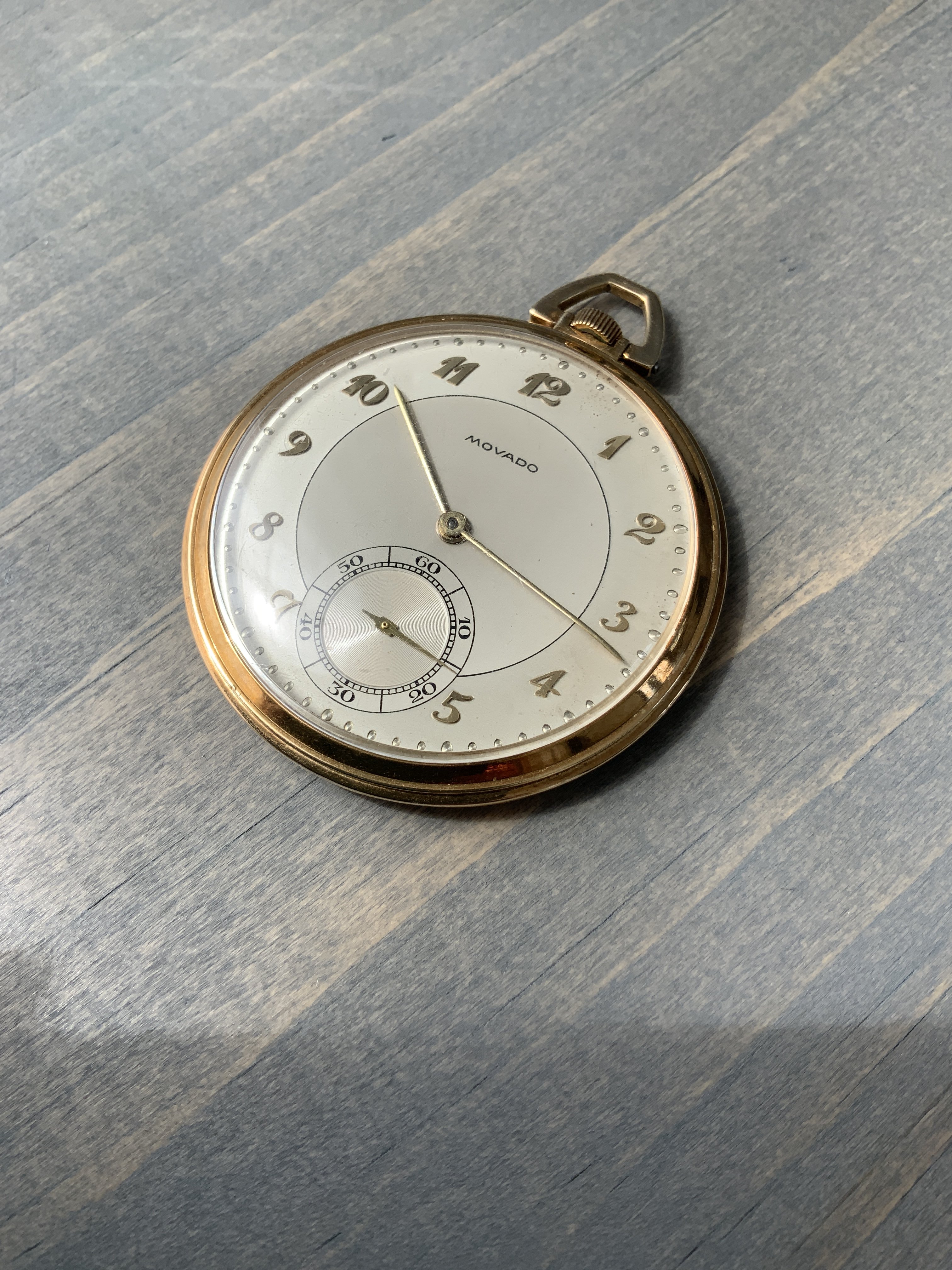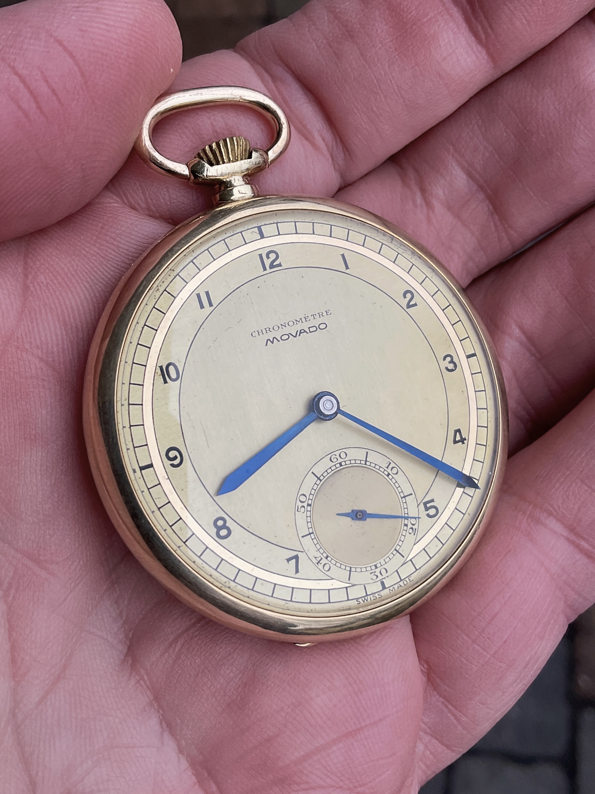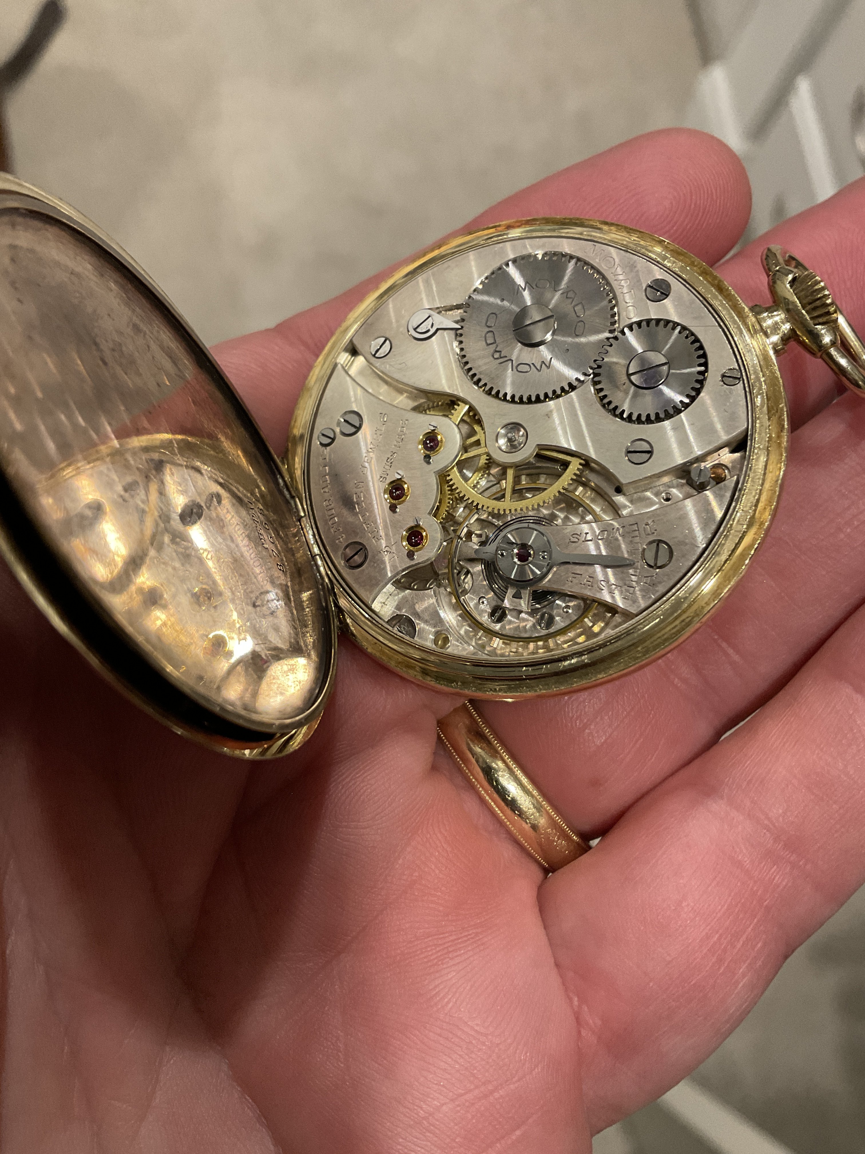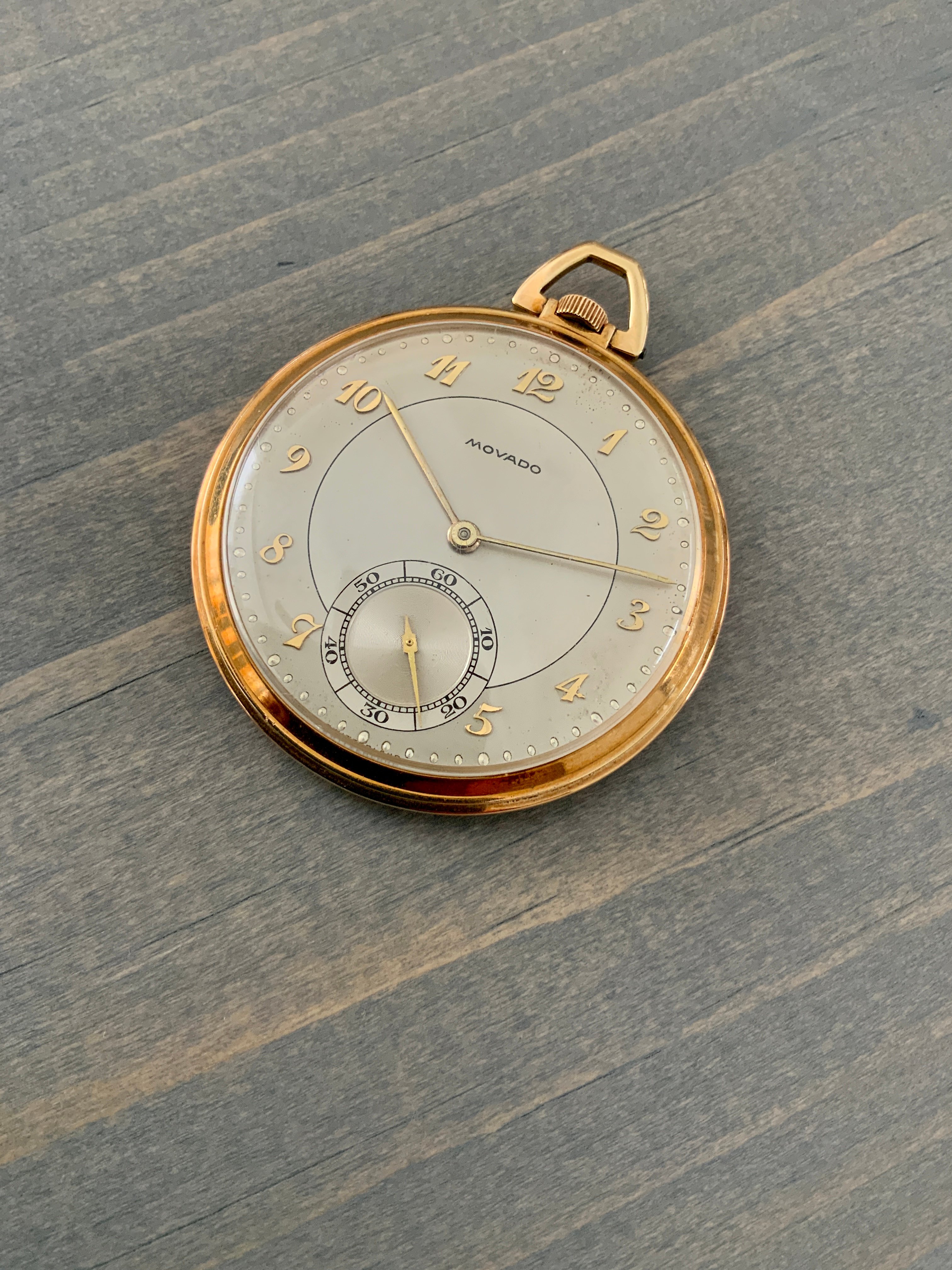 ·Hi gang, thrilled to have just landed this gorgeous Movado pocket watch with Breguet numerals. I know from the inside of the caseback that it’s 14k gold, and the casemaker (hammer 115) is Favre & Perret SA of Switzerland. I also believe that the reference number (42511) confirms the 14k (“4”) and model (2511) but I’m having a heck of a time finding much out in terms of dating the piece (1930s, I suspect, based on the serial number - but not certain) or finding other examples of the same reference, either in photos or old catalogs/advertisements. Most photos I’ve seen of Movado pocket watches from the era also have “church key” or cathedral style hands, not slim/straight like these. Can anyone shed some additional light on the age/history of this wonderful piece? Or other examples I can compare to? I believe the caliber is 250N. Thanks in advance!