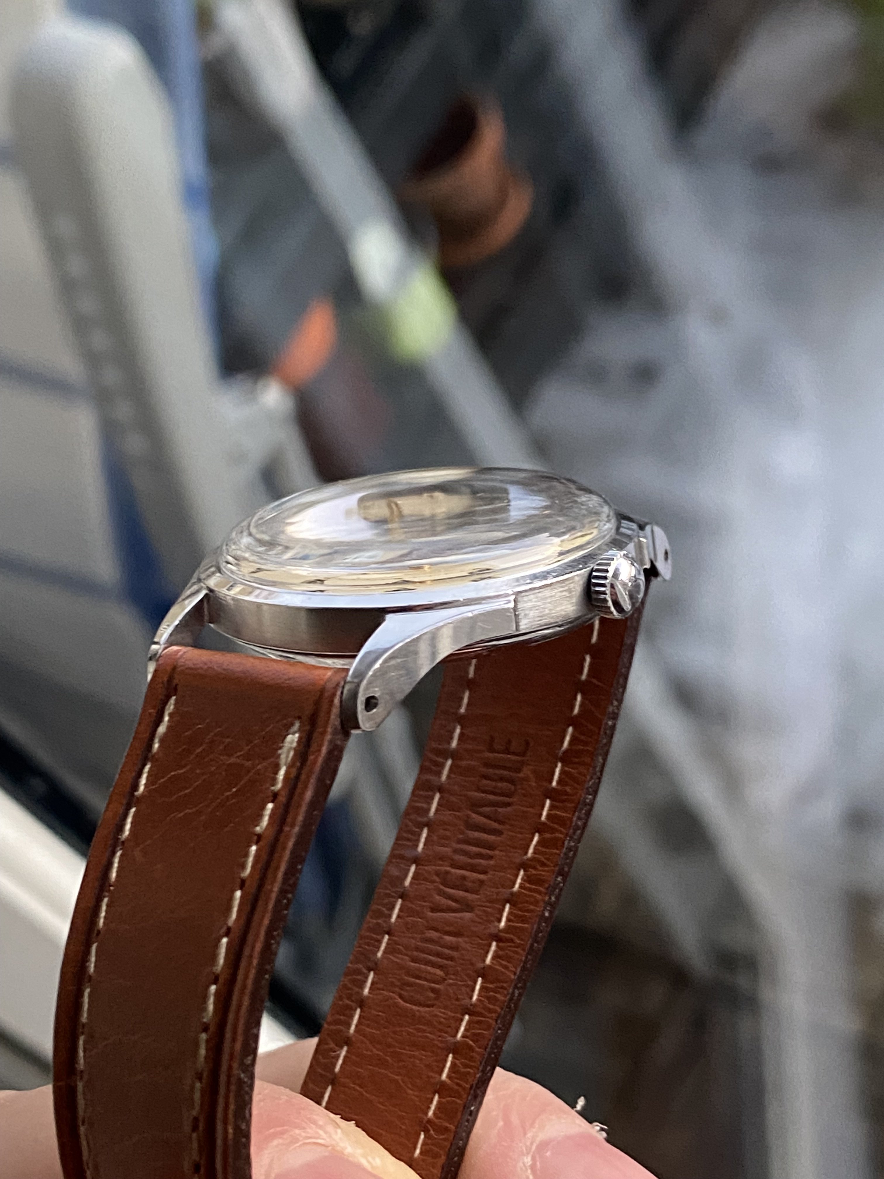Dial: The two-tone dial is stunning and has an even and appealing patina. The radium lume on the numerals has patinated nicely as well. The dial has syringe hands, sub seconds and a brand new crystal.
