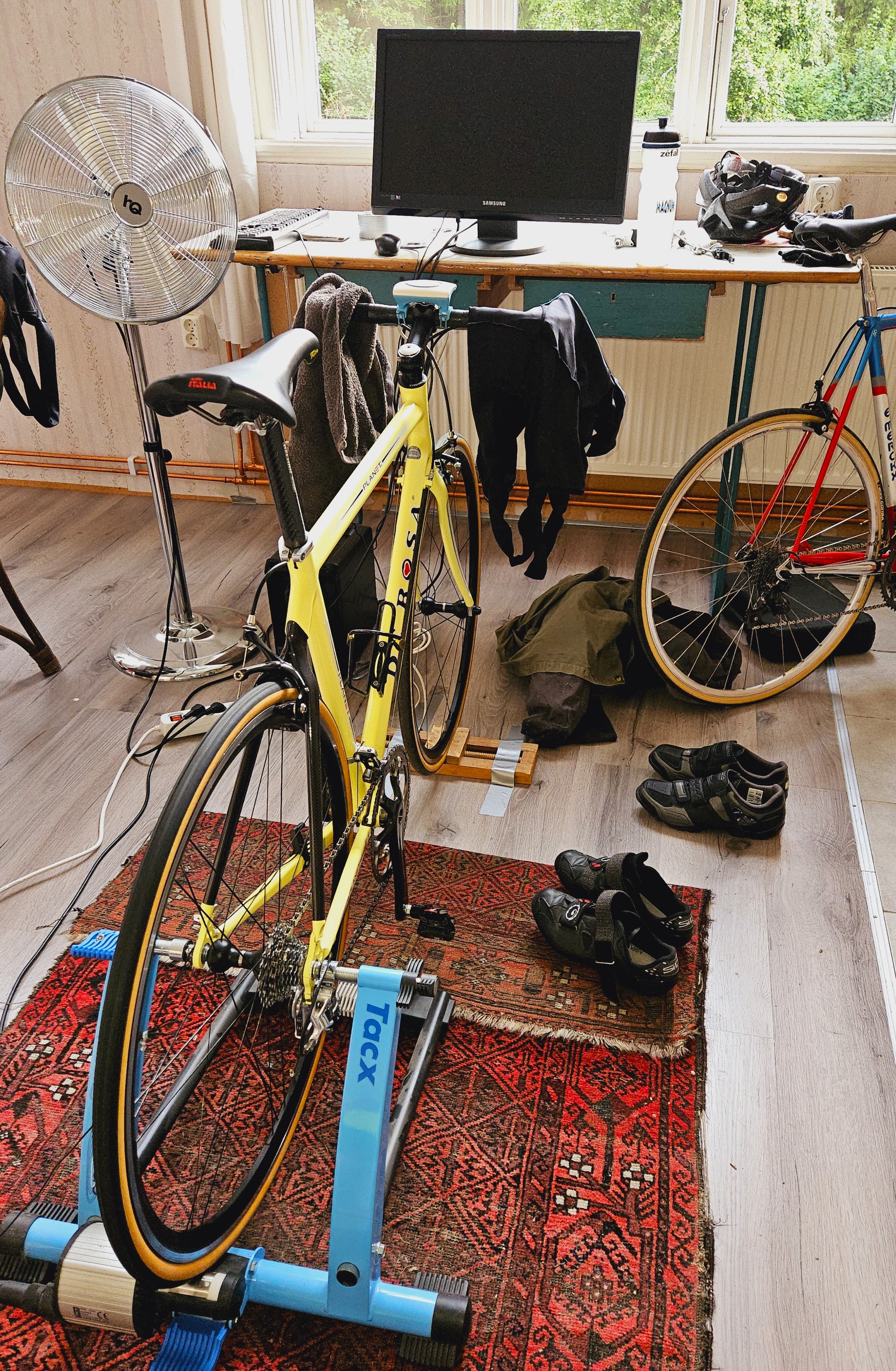 Bicycling 40-60 minutes, 2-4 days a week. Indoors when dark or wet, outdoors when manageable. Weightlifting free weights, basic movements/large muscle groups 4x12 - at home the same days as bicycling. Three meals a day (no special diet). "Pig out" once or twice a month (social events). Micro-fasting (eating nothing at all for 12h) between 19.00 to 07.00.