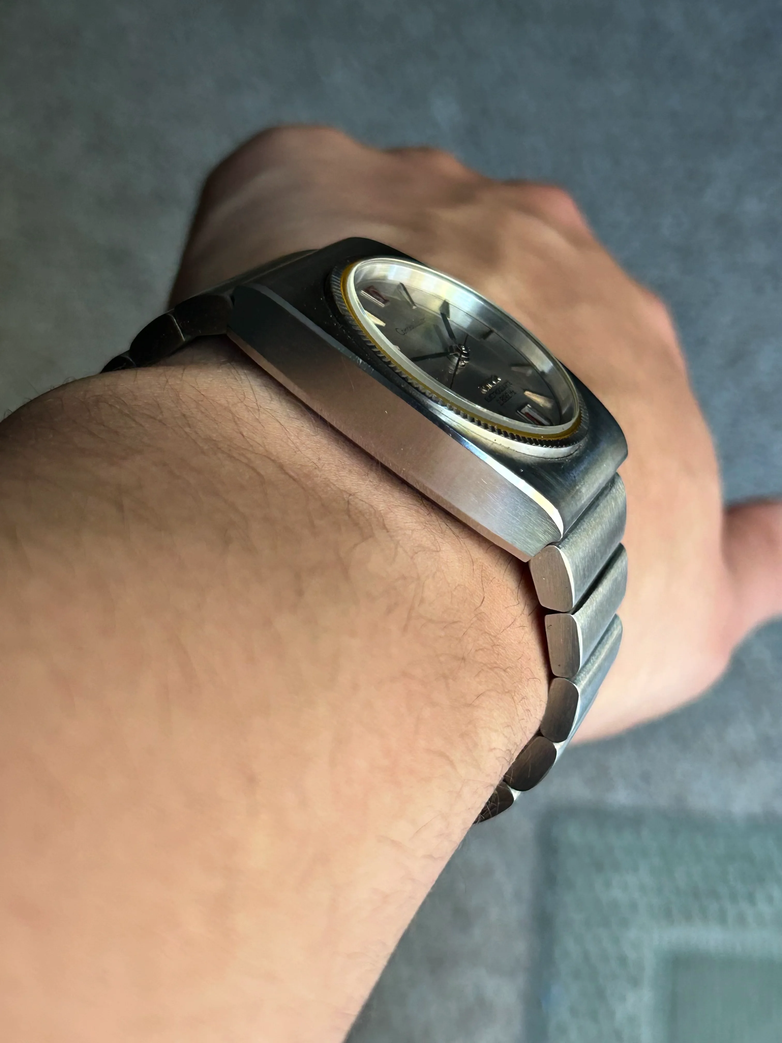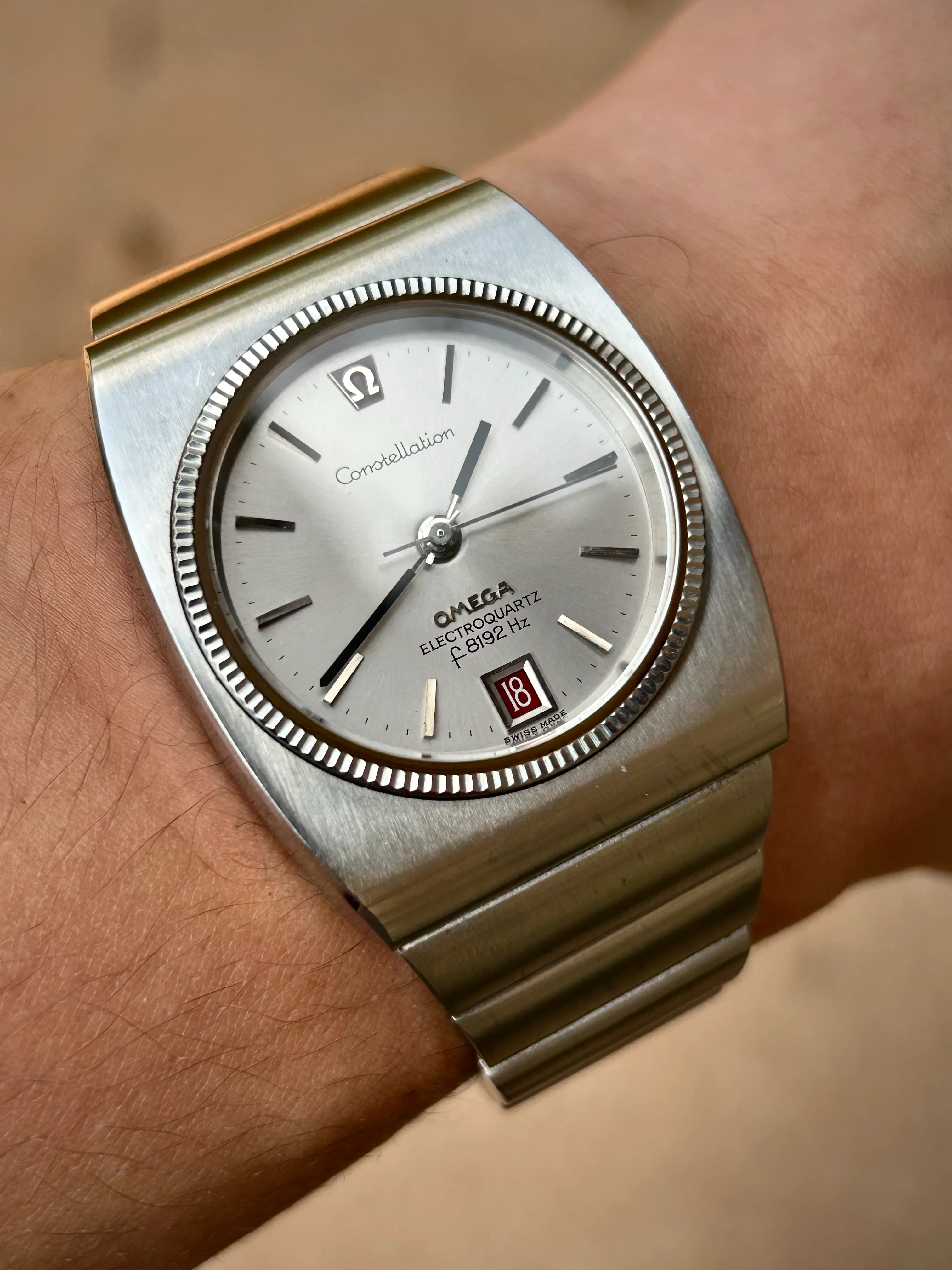 ·I've been pining after a watch housing the Beta 21 caliber for a while now, and I've recently added a SS Omega Electroquartz from 1972 to the collection, featuring the 1301 caliber (Beta 21, second version from the 1300 with improved electronic module). These were definitely cool early quartz watches and were pretty expensive for their time. These slab/Pupitre cases sit quite proud on the wrist, but actually wear very comfortably considering how thick the Beta 21 movement is. I love the buttery smooth sweep of the seconds hand that's put out by the vibrating motor module. The bracelet is very hefty but comfortable - and I love the red surrounding the Omega logo mirrored with the red date window.