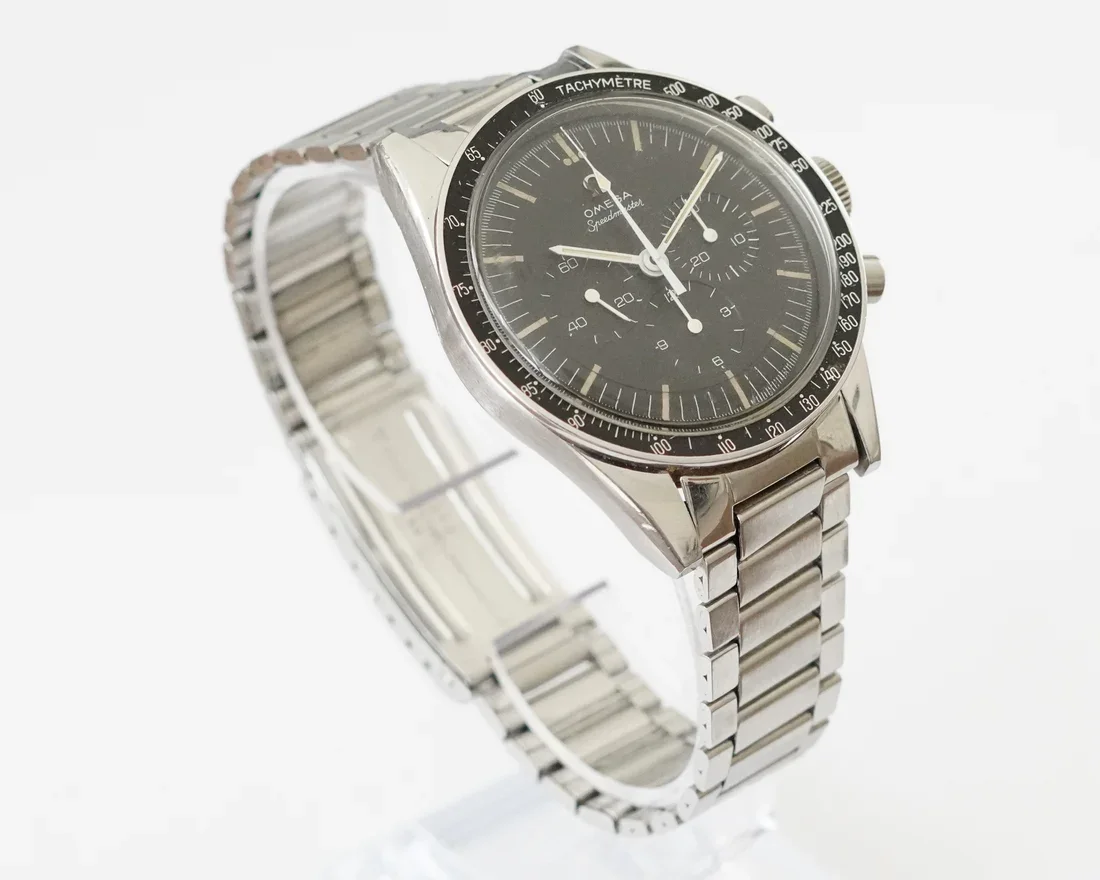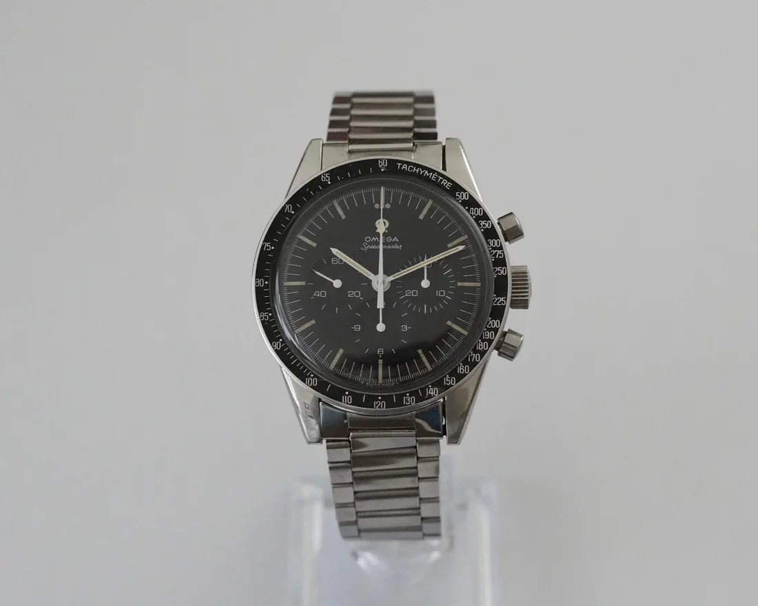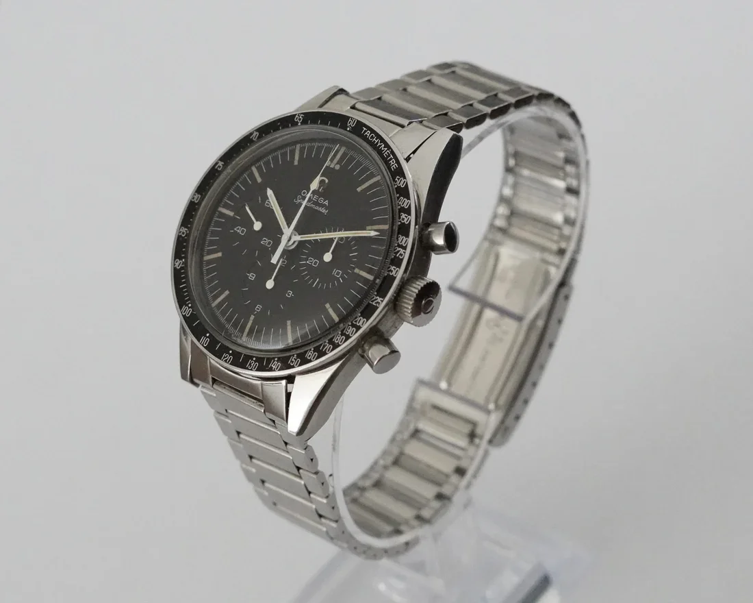 ·I just purchased this Ed White 105.003-65 after some research on Speedmaster 101. I love the NASA testing story, and I looked at the new Ed White 321 (which I think is a beautiful watch, and scanning Gene Cernan's watch to make it is a great detail), but my last Speedmaster sapphire sandwich was a bit heavy for my small wrist and sloshed around more than I like, particularly when on a leather strap. So I decided to get closer to the NASA story and hopefully a little lighter. I'm not looking to resell this one (it's going into the safe to be a 60th birthday present to myself in a few years), but I'd be interested in comments on whether I judged it correctly. I paid between Good and Very Good on the Speedmaster 101 price chart (a little to the Very Good side of middle). I haven't received the watch yet, but these are the pics with which it was marketed. No box or papers. #6 end links and #7912 bracelet. The outside of the case back isn't very clear in the pics, but the hippocampus logo looks like the most worn part of the watch from what I can see. The crown has 32 teeth (ridges?); I think an original crown may have only had 24. A few scuffs on the hesalite. That brings up an another question for the forum: If I have Omega service this, will they honor my requests to not polish it or replace anything visible (other than the hesalite), so not mess with the case, dial, hands, crown or pushers, or do I need to go to an independent watchmaker for that instruction to not get lost in a more corporate process?