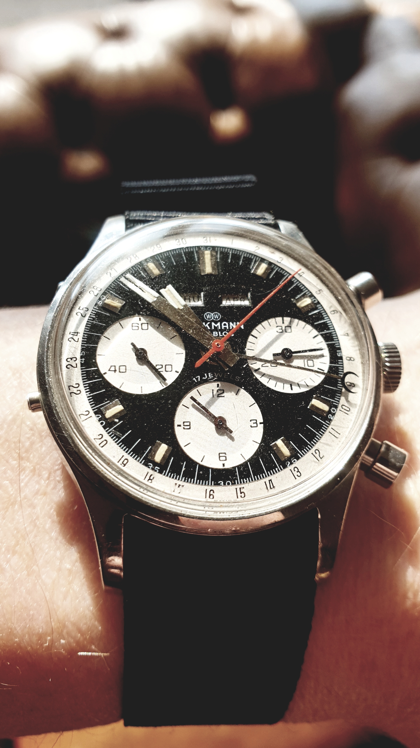 I entertained a few candidates in the past, but they all had disqualifications. Most were chrome-on-steel cases (I wanted more uncommon all-steel model), others lacked the orange sweep-second (it's white on some models), others were overpriced (above my $2500 limit), and others lacked the Valjoux 7730 movement I was after. I am happy to say that I finally found what I was looking for. It took a little TLC from Brendan Hoey to bring the movement back to fine fettle, but a worthwhile investment, I should think!