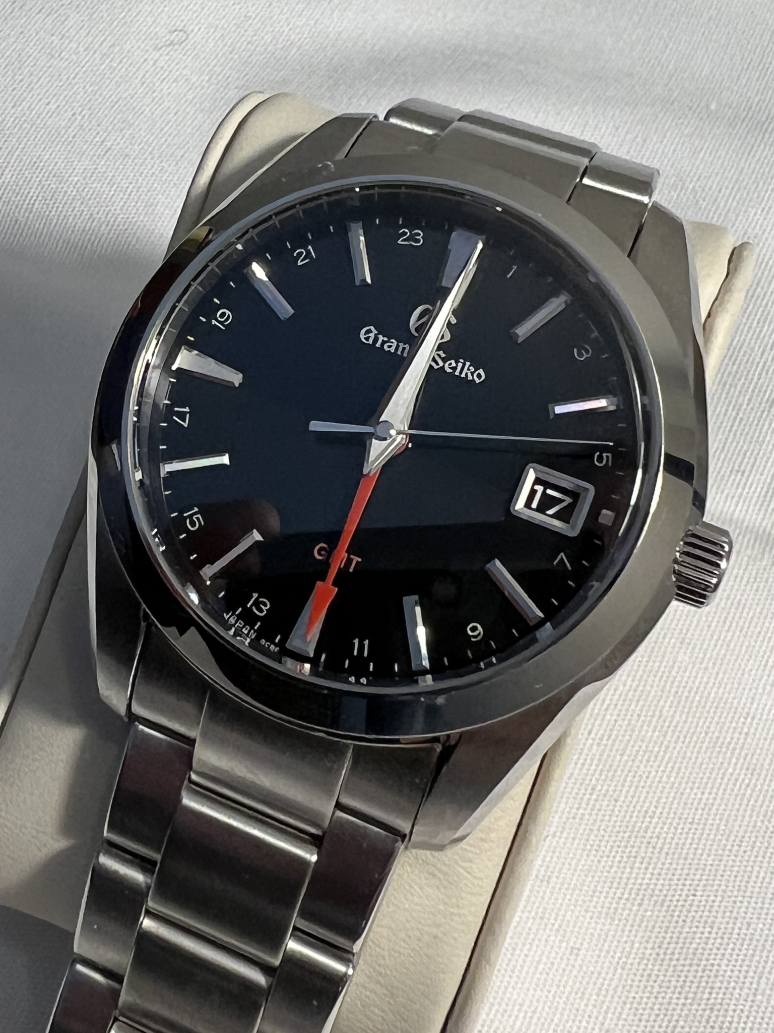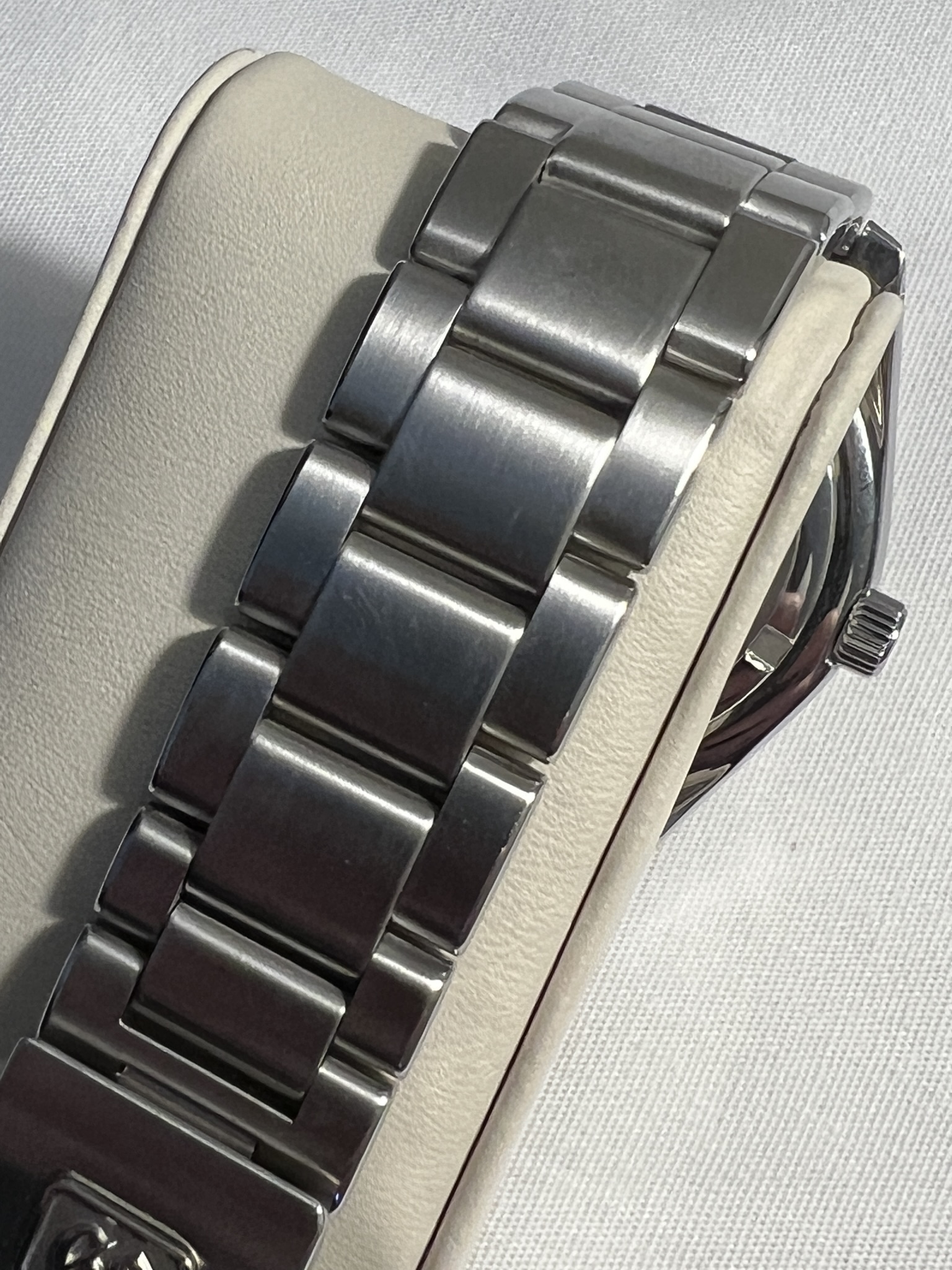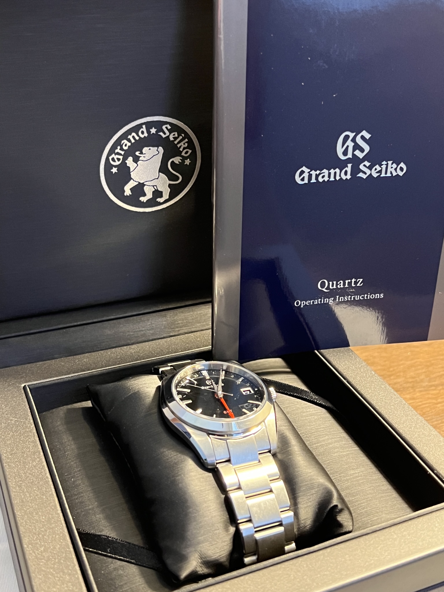 Continuing the purge, I'm offering a Grand Seiko Heritage GMT (ref. SBNG013) in excellent condition with case-back sticker and original box. The watch features the outstanding 9F86 GMT movement - a true GMT with independent hour hand - with accuracy +/-10 seconds per year. The case is stainless steel, is only 12.1 mm thick, and features Grand Seiko's famed Zaratsu polishing. Fratello has an excellent review of this model here.