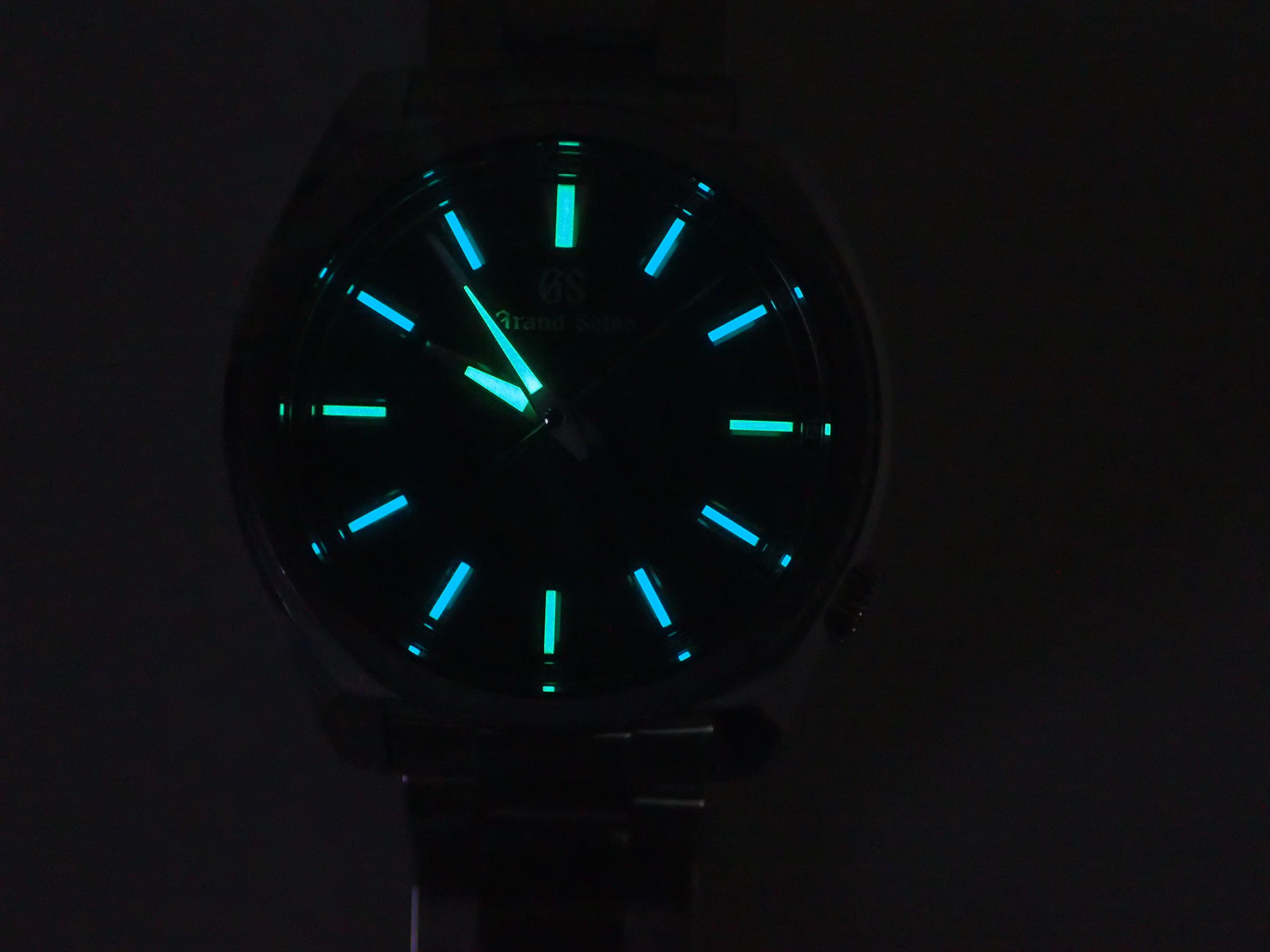 The dial uses two tones of Lumibrite, green and blue, which gives a very pleasing appearance in low light or dark conditions.