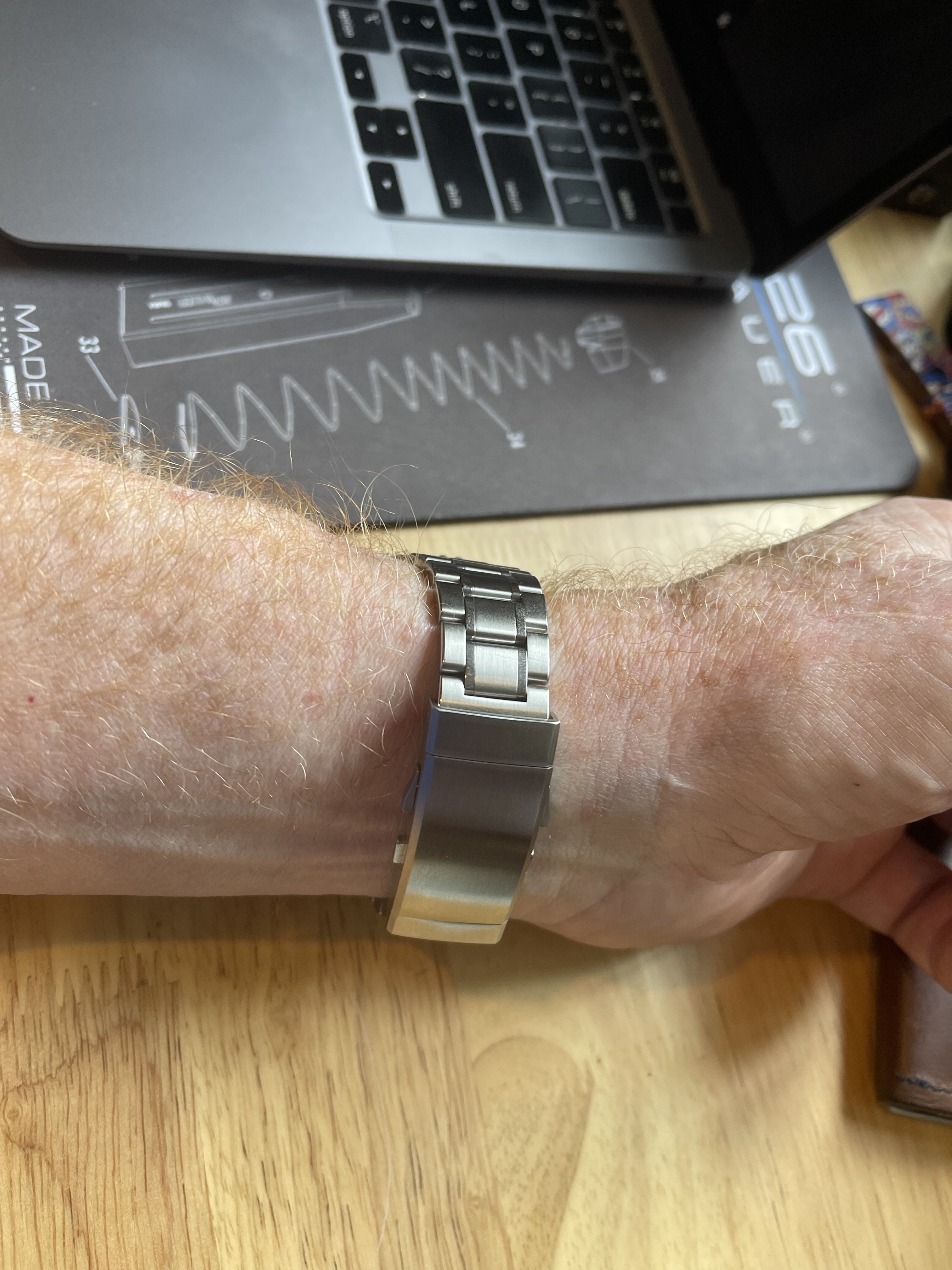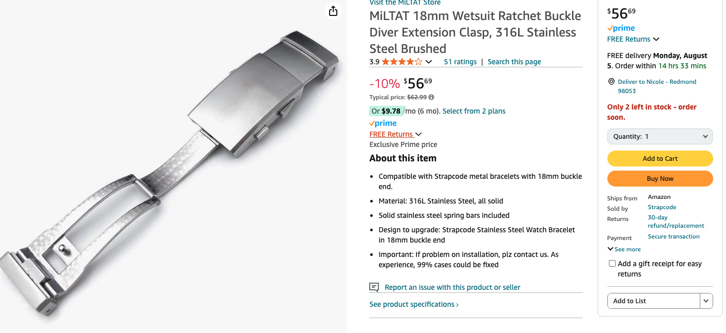 But the one thing I knew I probably would not like is the GS Clasp. I was right when I got it - it just feels cheap. So I ordered up this Strapcode clasp from Amazon. Ordered last night and it was on my porch before 7am. That's just amazing... Before work, I switched clasps and this turns out to be an upgrade. This clasp is not cheap and not pressed like the GS clasp. The description says it's 316 steel with a really nice glide lock type extension to fine tune the wearing experience.