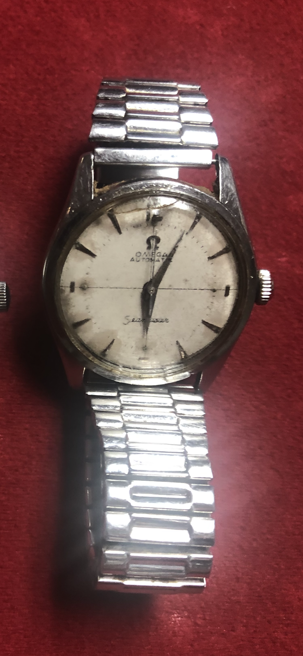For Father’s Day last year I tried to get my grandfather’s watch repaired. With my mothers help I snuck it from my Dad and sent it off to Omega via a local jeweler. Hindsight, not the best idea. It went to Omega and we got a quote for repair. During the time I got the quote and decided to pay the $1200 to get it fixed, Omega shipped the watch back. Apparently it came back with another watch and the jeweler threw it away after taking the other watch out. It was lost. I don’t know the model of it, or anything. Could you guys help me identify it, and possibly find a replacement. I have one crappy picture of it.