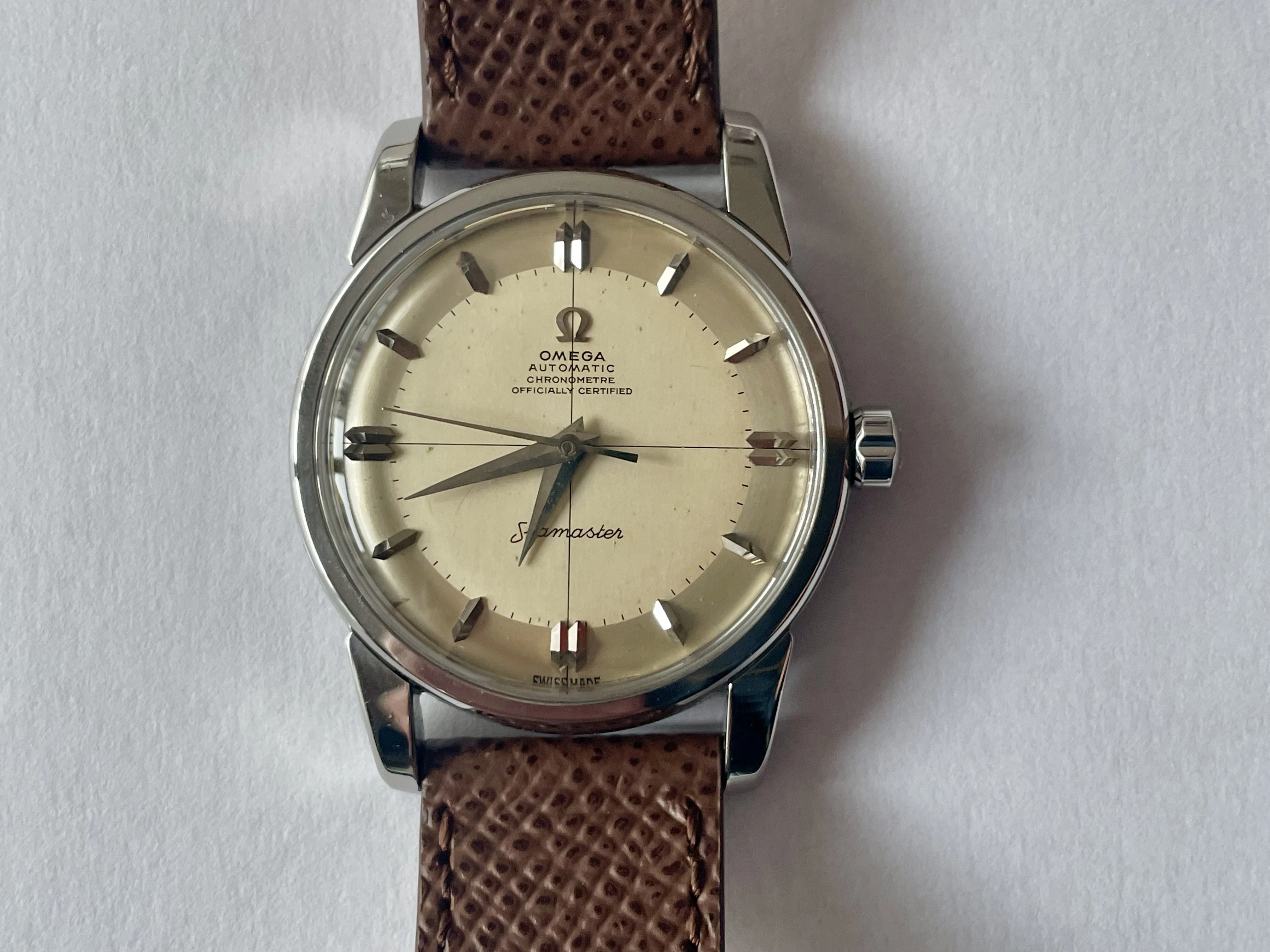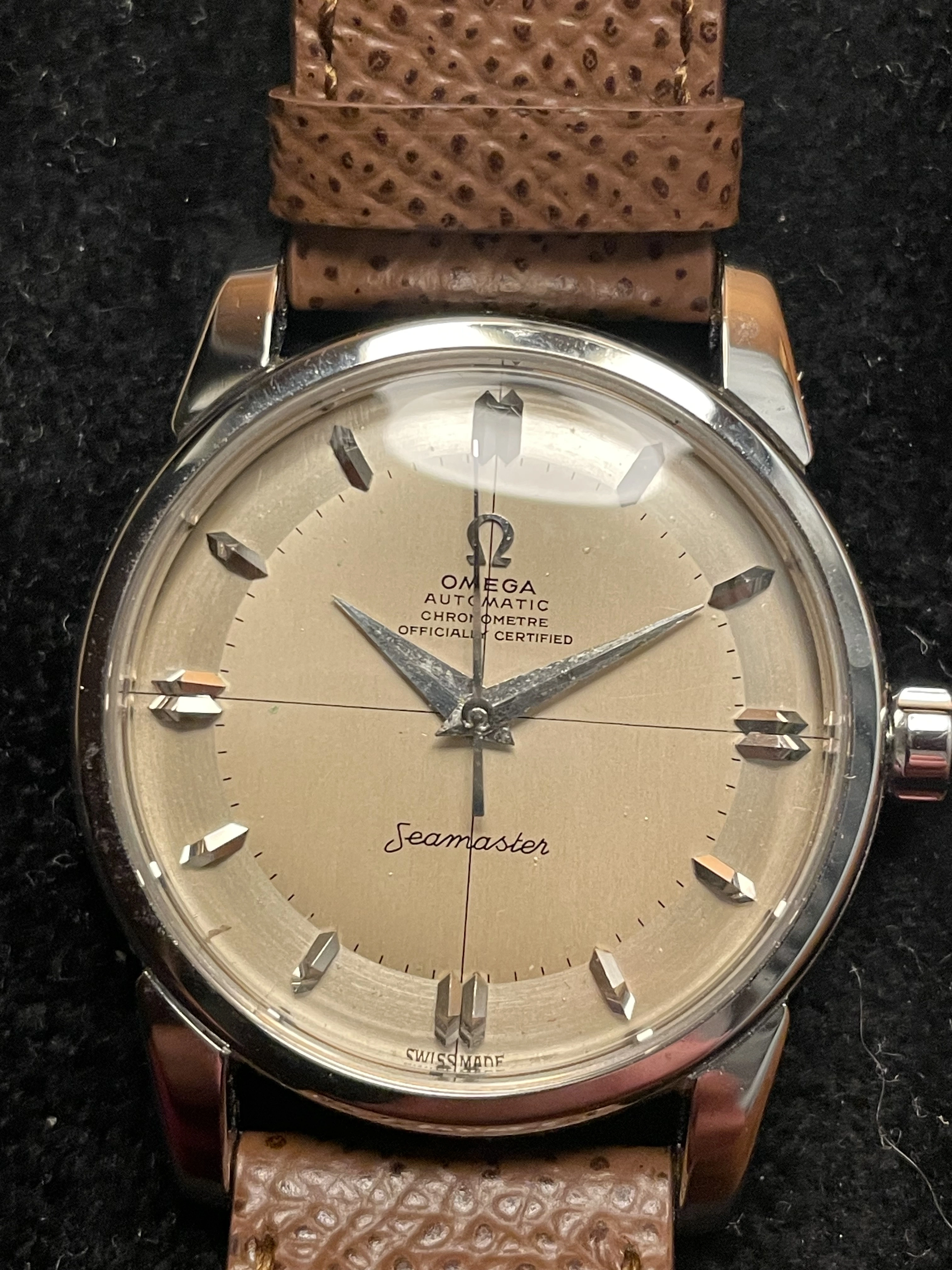 It is my first post so please forgive my lack of specific language. I inherited this watch almost thirty years ago when my grandfather died. At age 20, I had no special interest in watches so I kept it in the drawer ever since only to have it finally serviced four months ago. The watchmaker’s bill tells me it‘s a caliber 354 (bumper). The serial number is 1297xxx and the ref. 2767-4. I have done some research in the past few weeks and learned a little bit about crosshair dials and two tone dials. But I have nowhere found a similar Seamaster that has comparable hour markers (crystal? glass?). Also the shape of the first „S“ in Seamaster seems quite unique. I have no reason to believe that the dial is not original. But is