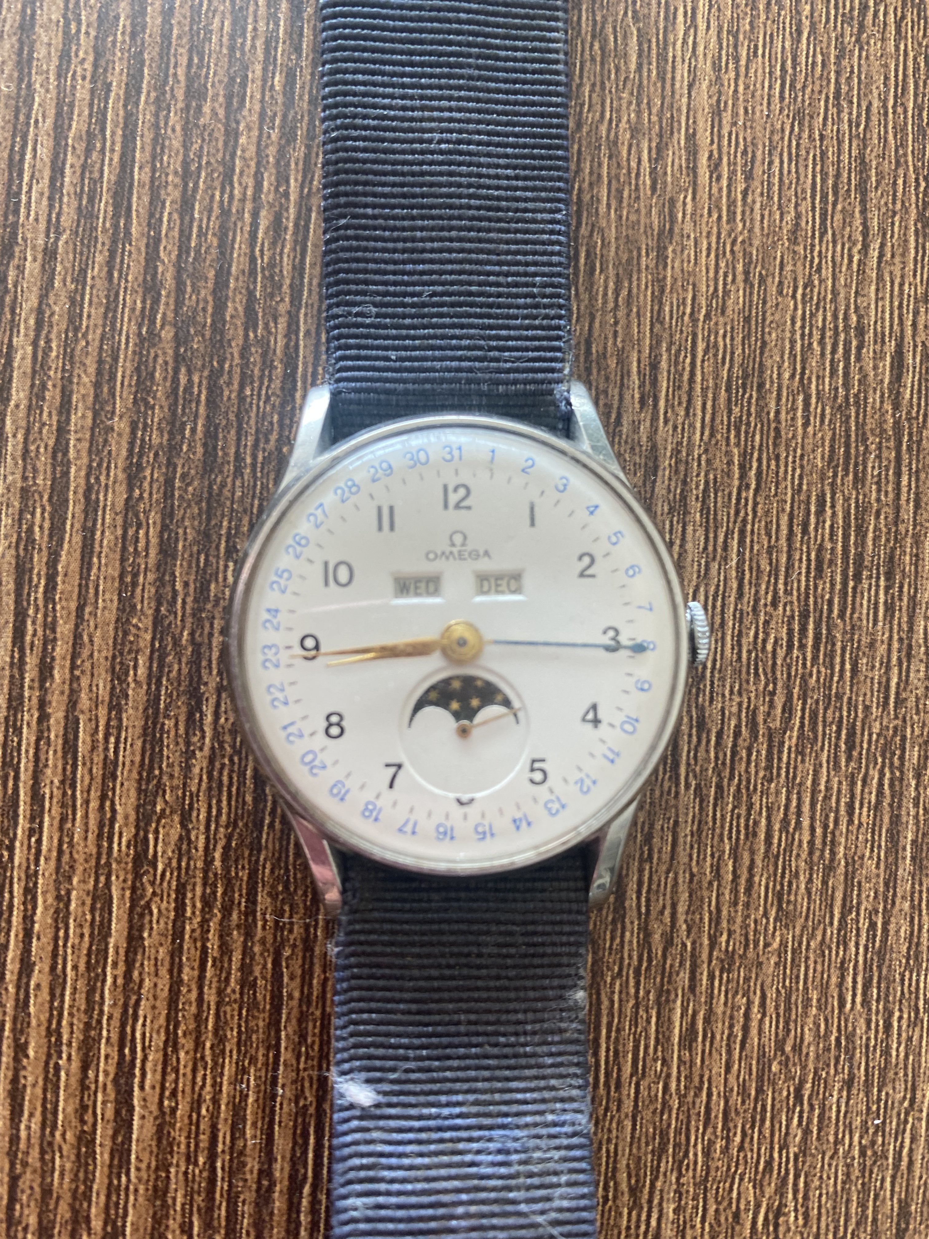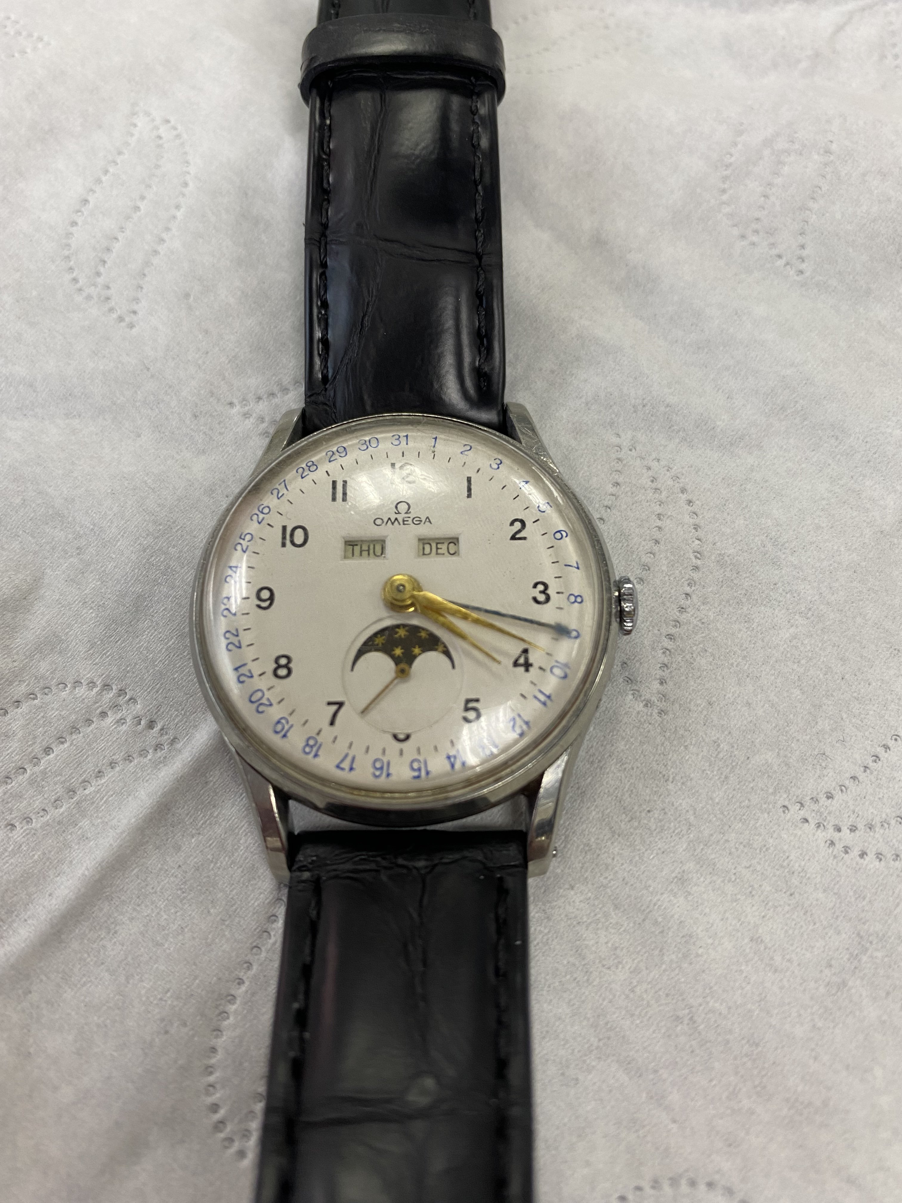 It did not take much digging to determine I was in possession of an Omega Triple Date Moonphase. A quick image search on Chrono24 revealed as much. According to various sources the earliest models were released in either 1946 or 1947 and ran up to some time in the early to mid 1950s depending on who you ask.