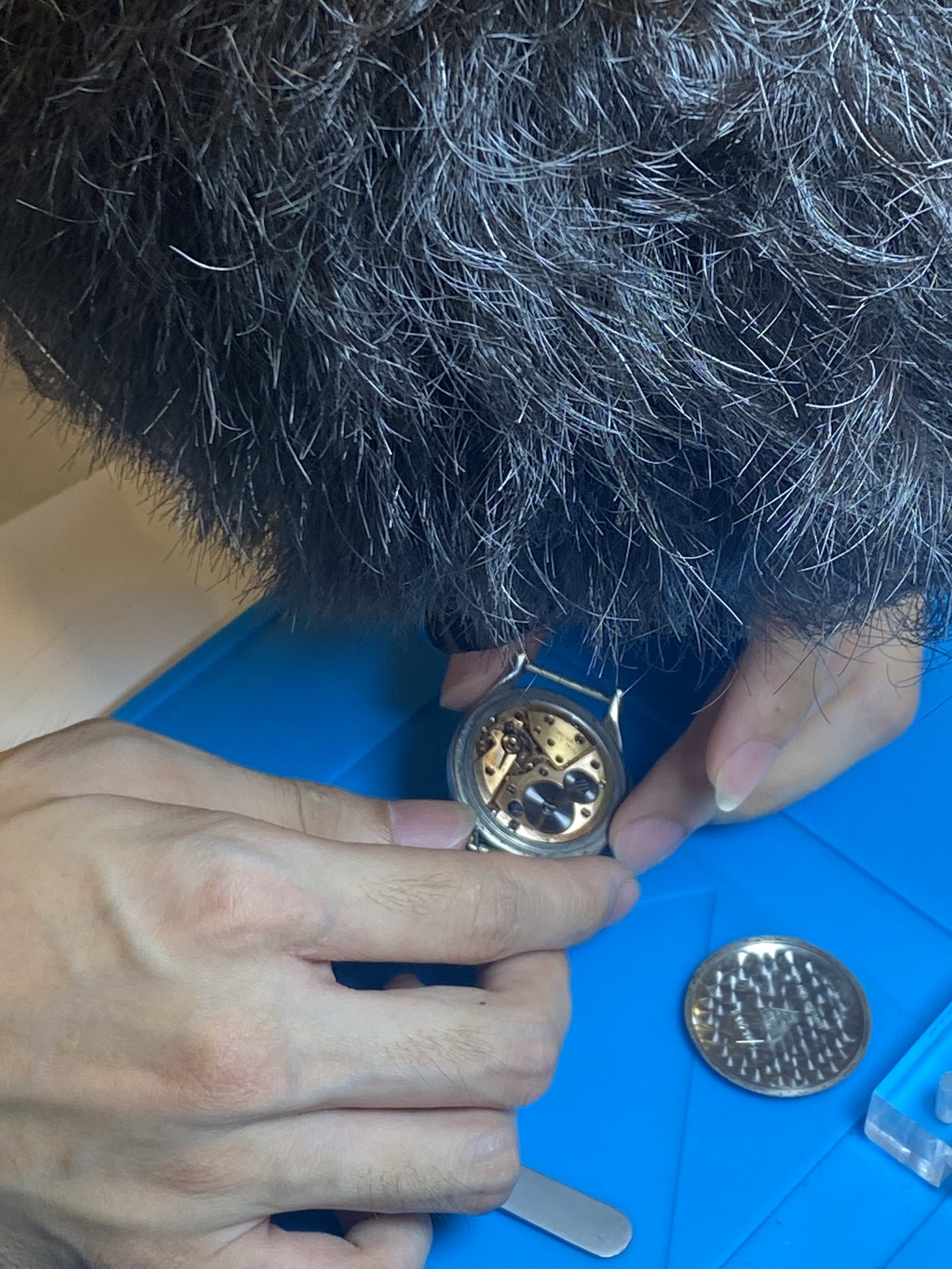 I neglected to get information on the movement reference while I had the watch repaired and so today while I was having a black crocodile skin band put on it I had the young watch repairman open the back up so I could inspect the case back and get some pictures. He could see I wasn’t getting good pictures with my phone and handed me his loupe instructing me to hold it over the lens of my camera phone. You can see the results