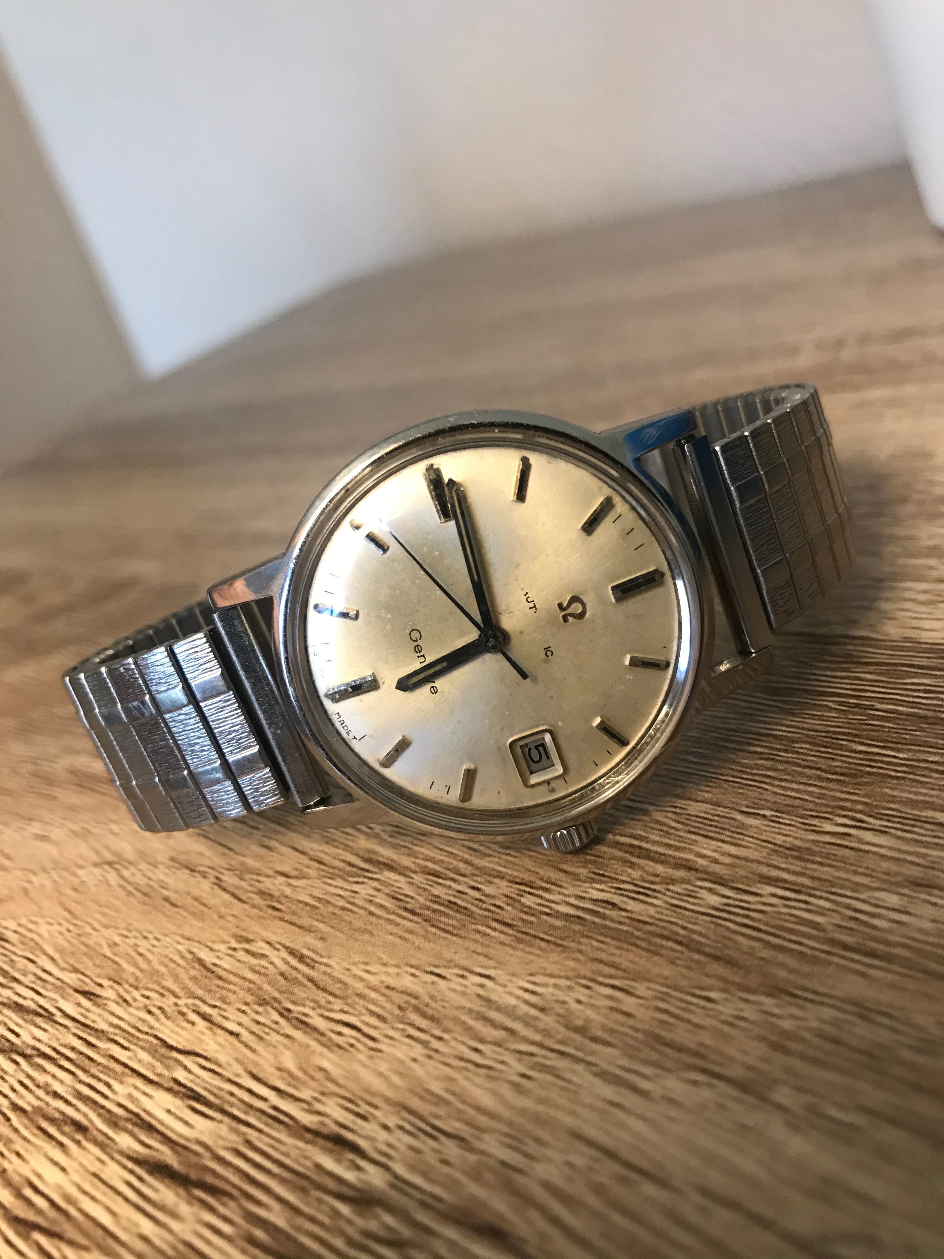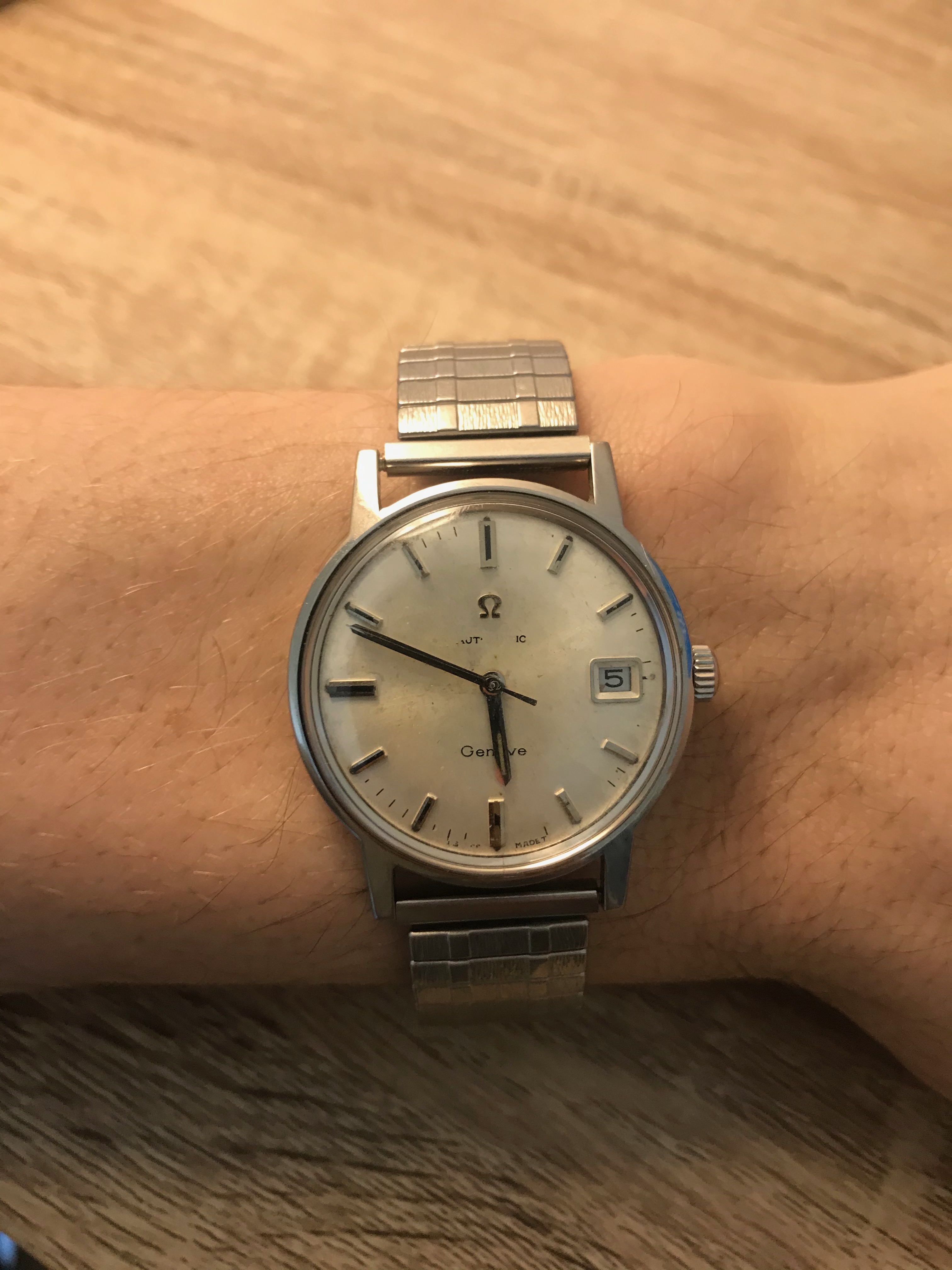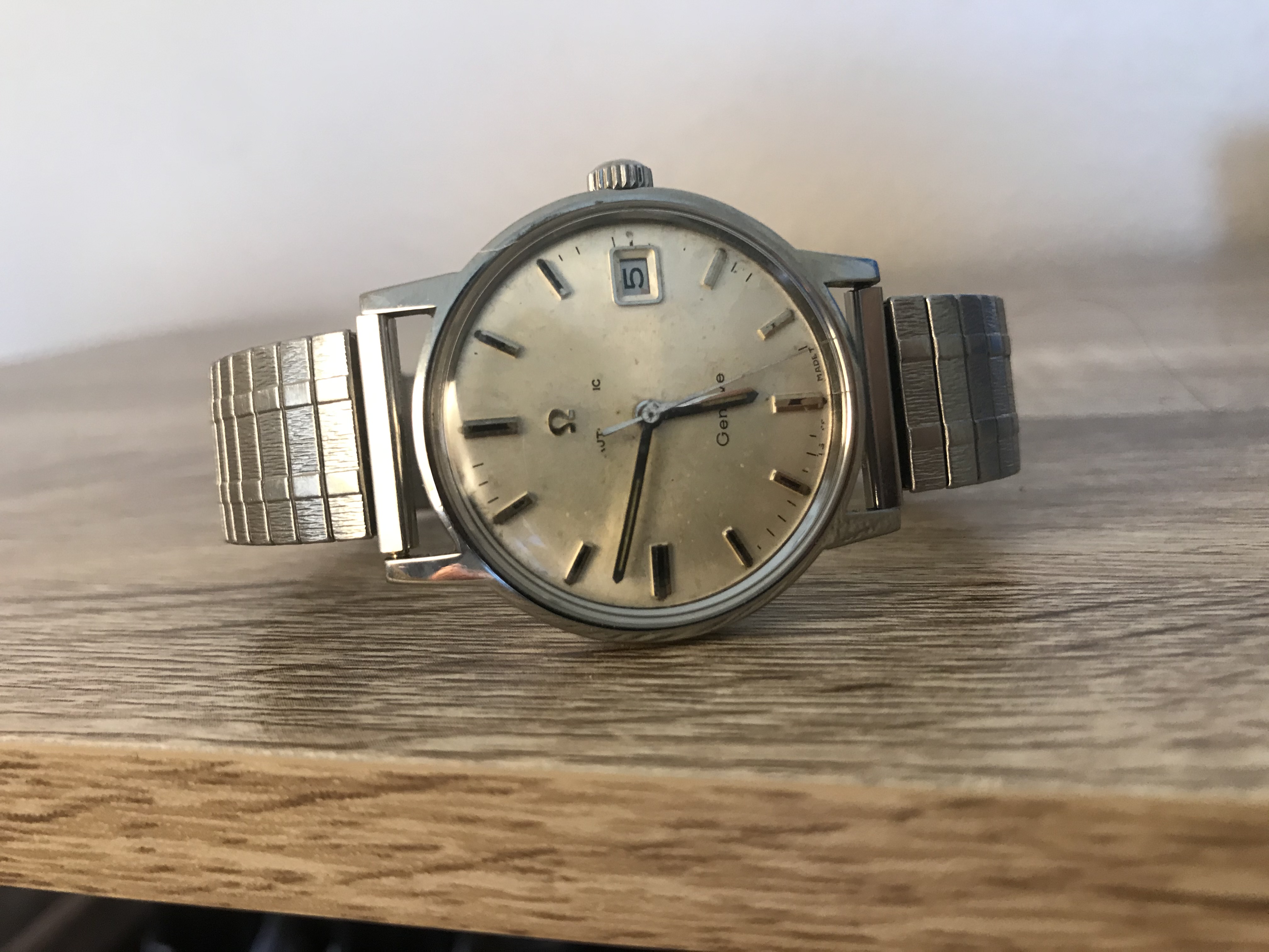 There is a signed Omega crown, an indication "Genève", and "Automatic" (almost scrapped out too).