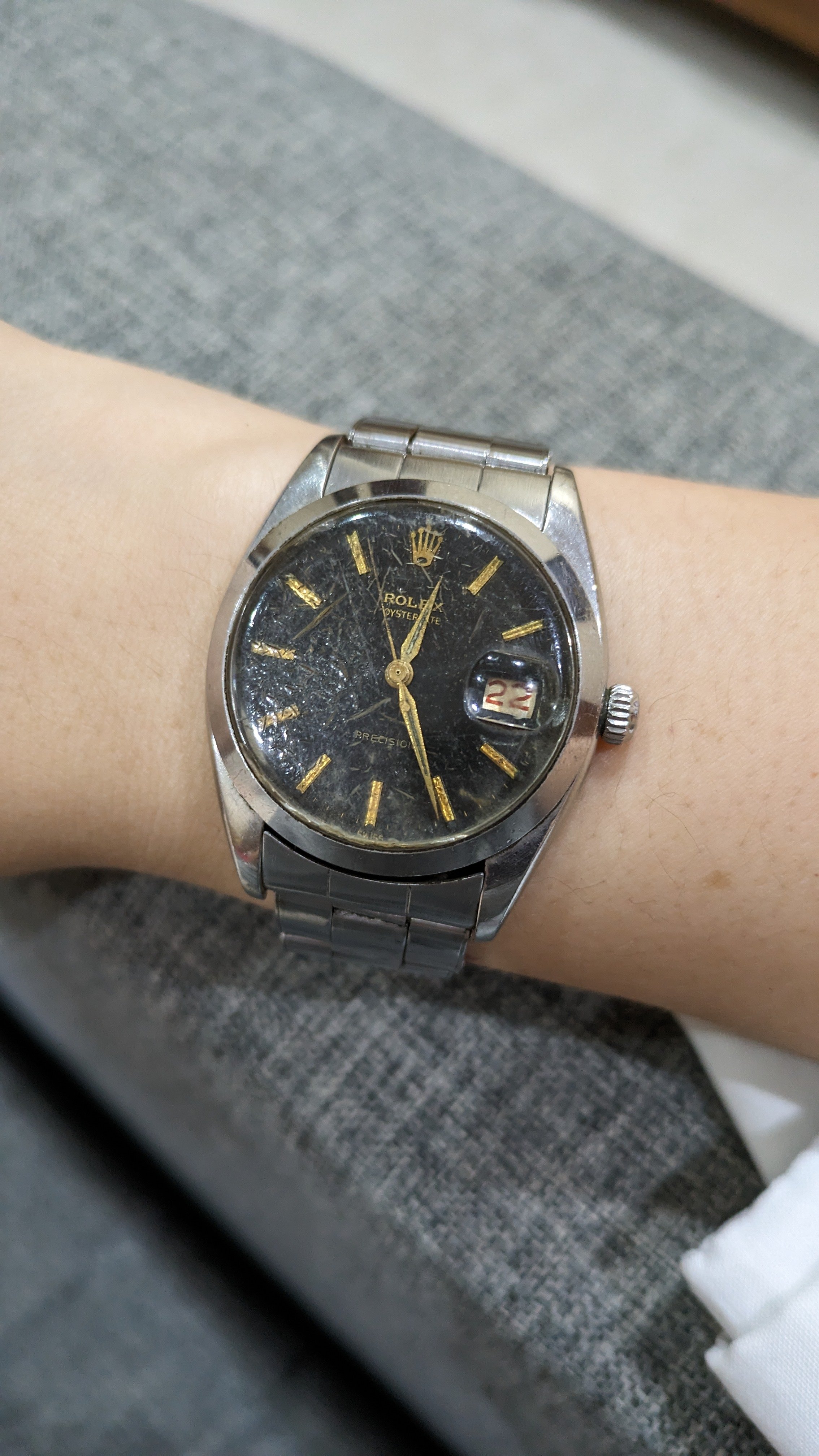 ·Recently I found out that my late grandpa has a couple of vintage Rolex. The crystal for this one is in a bad condition, so for a non-expert like me it's tricky to assess whether this is a genuine rolex. No one in the family knows for sure. We didn't think our grandpa was that rich in his 20s, but then it could be a gift.