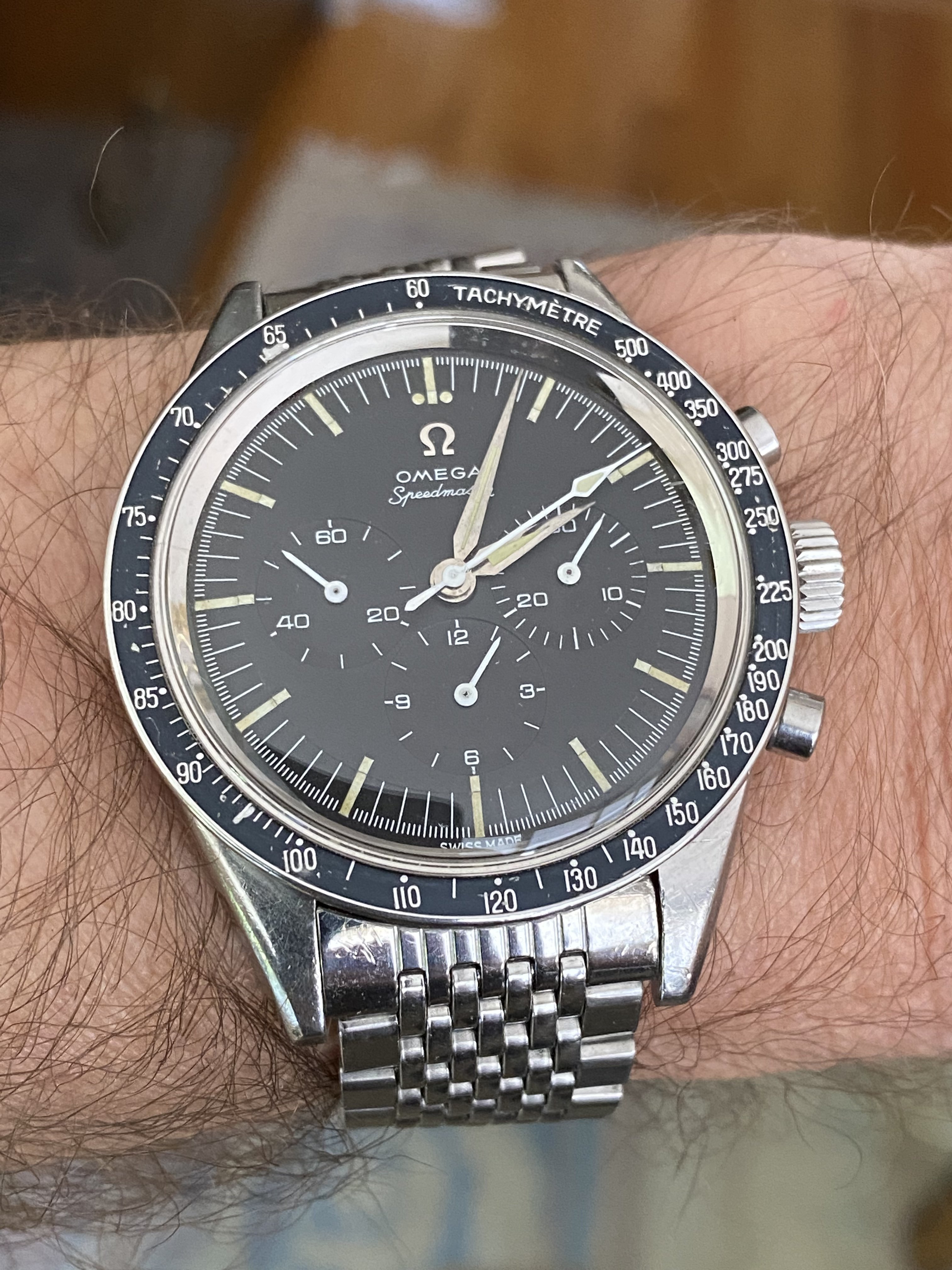 ·I am less positive towards that I am sorry to say. The lume looks to have been removed (see the halos round the plots) and while it may be a heavily patinated matt grey dial, as seen on SP101 and therefore vanishingly rare, it may also be a heavily water damaged or aggressively cleaned std black dial. I am leaning towards the latter but perhaps one of the big Speedy hitters might want to make comment. It is not unattractive but the movement condition just reinforces the suspicion in my mind.